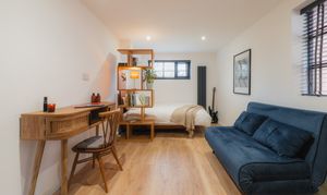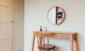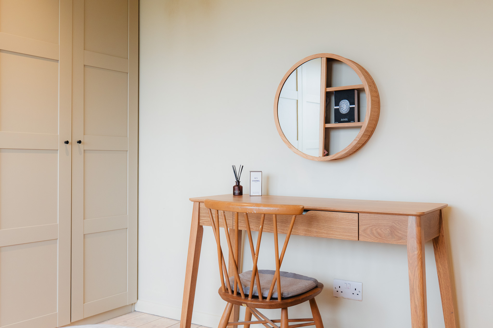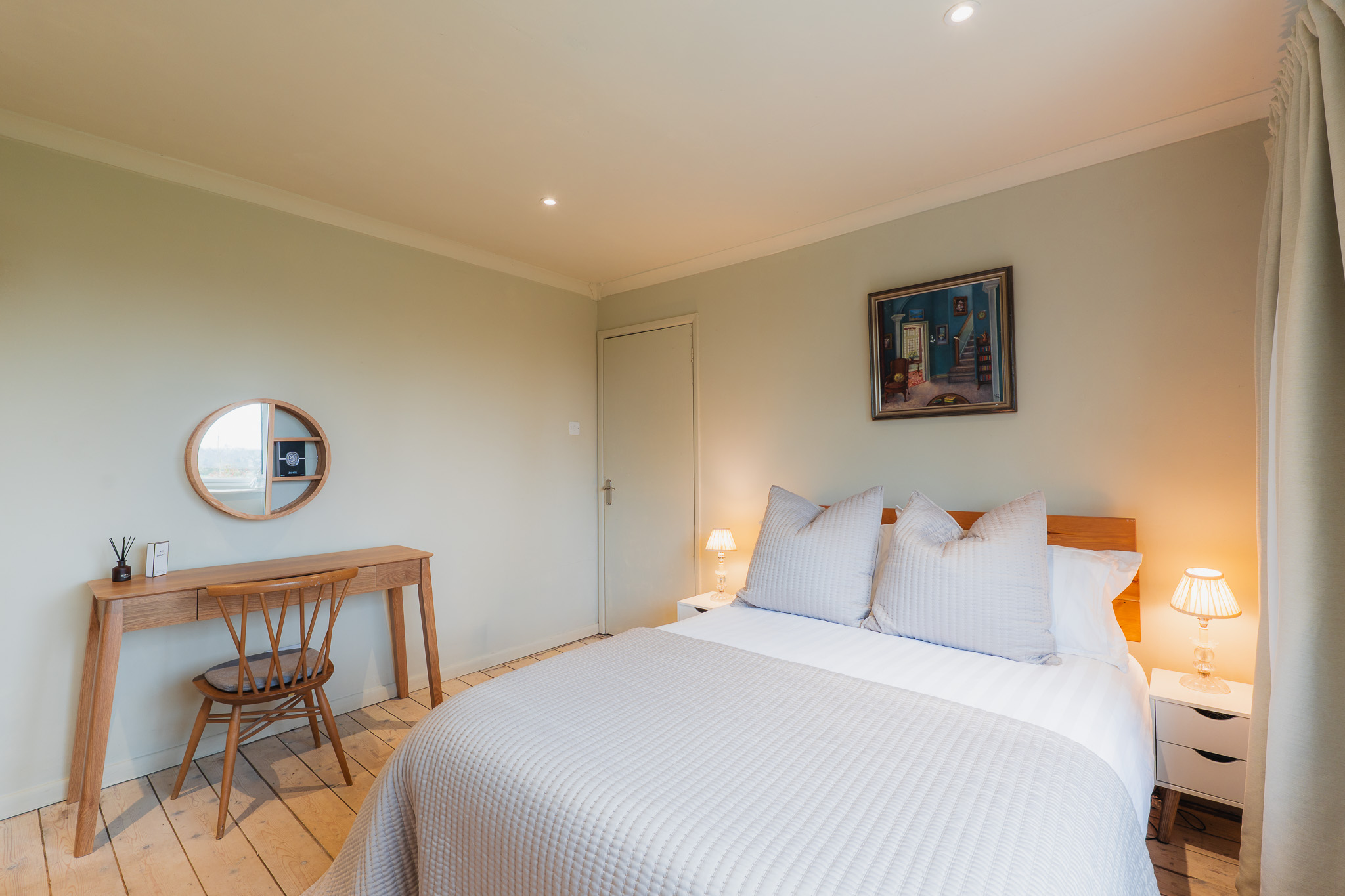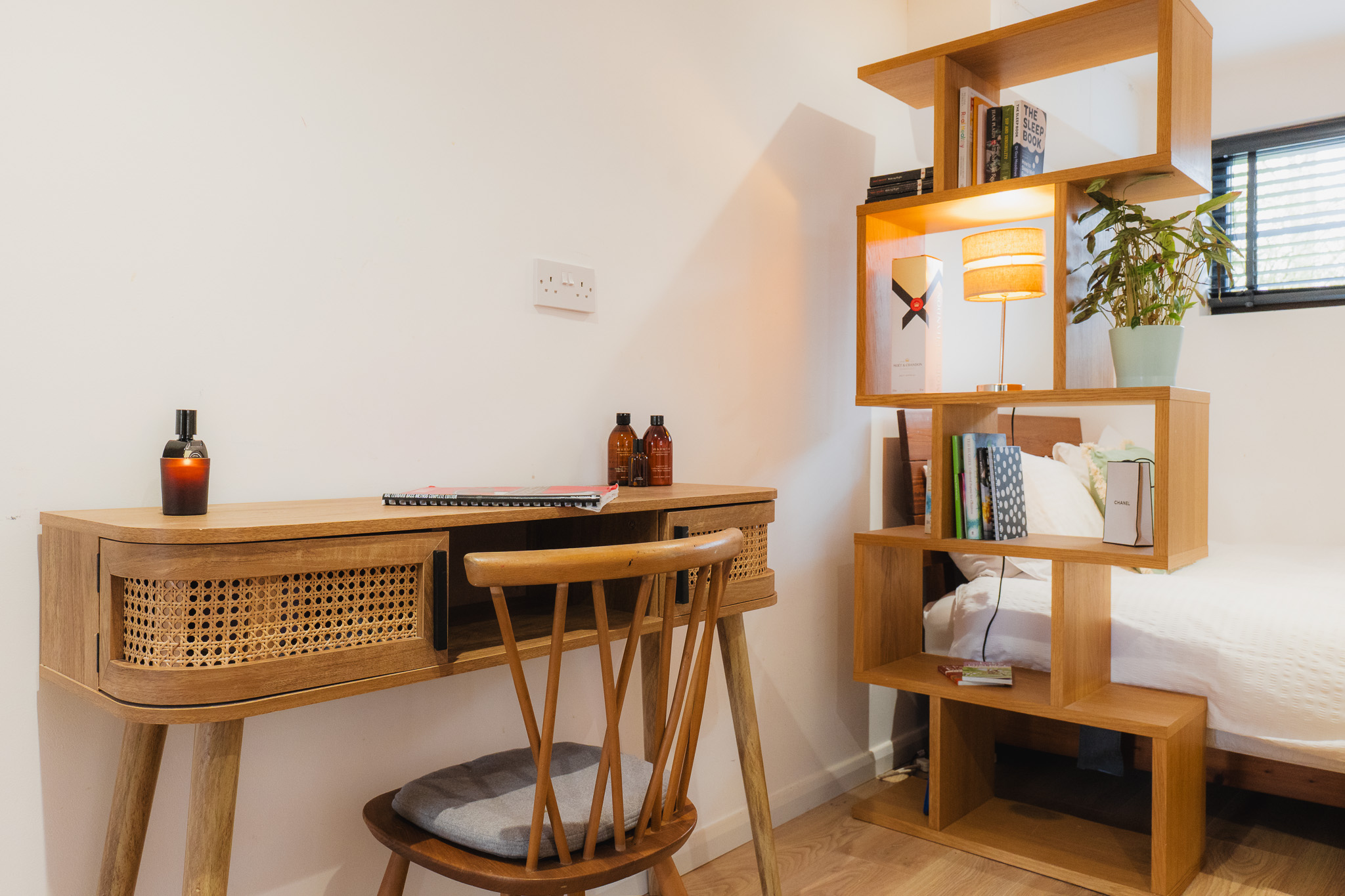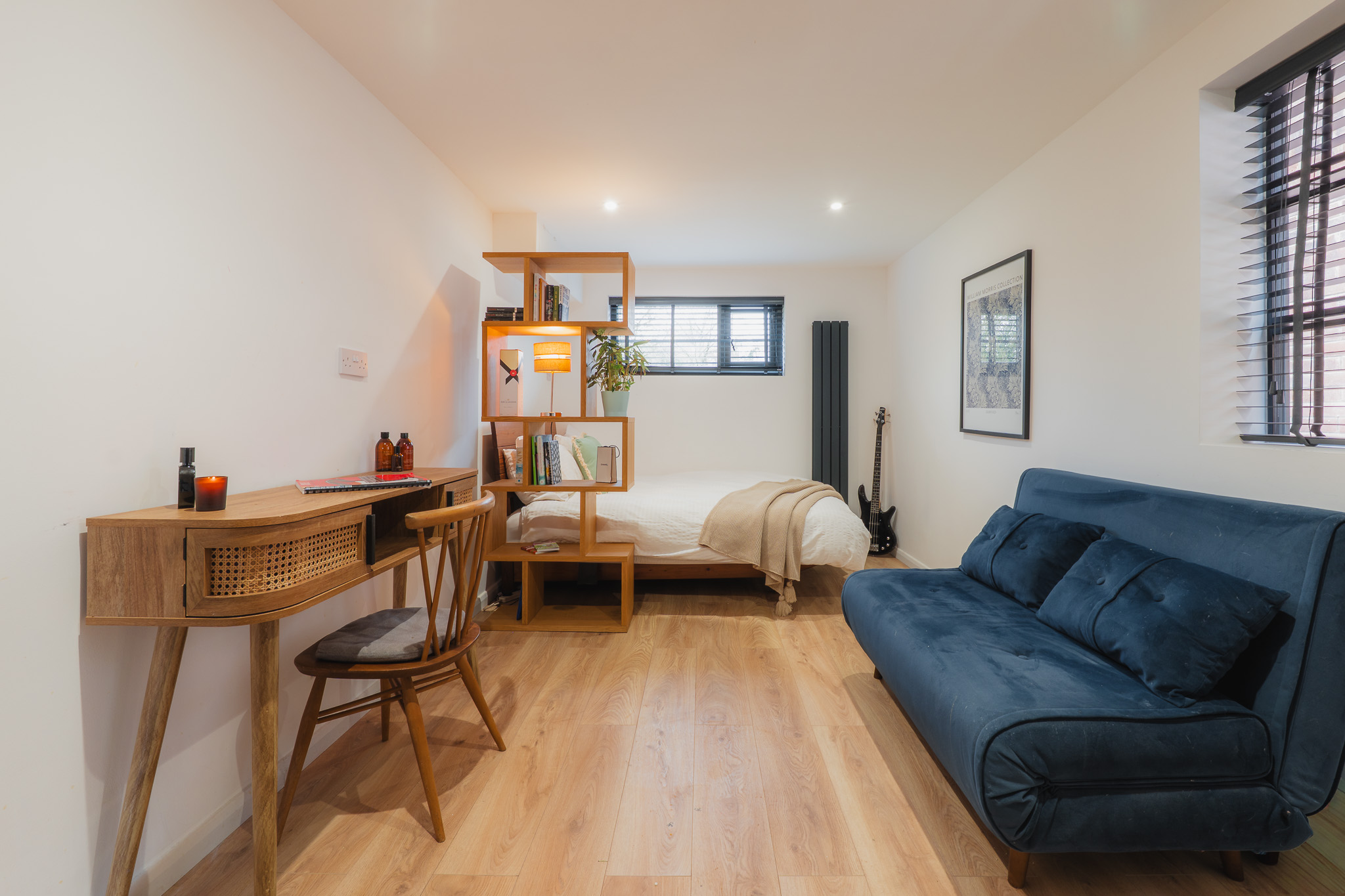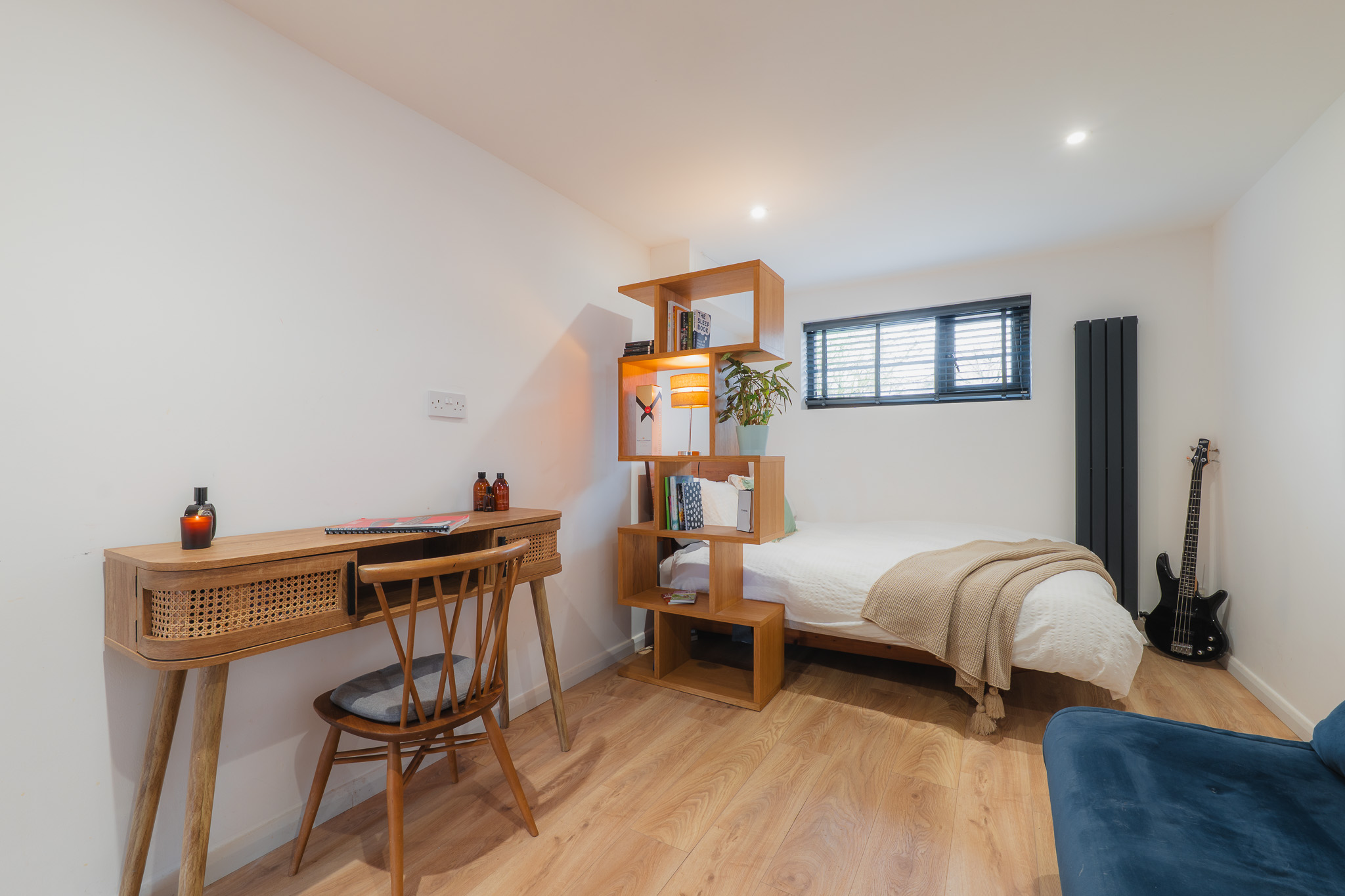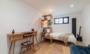 Practicality remains close at hand, with a second sink positioned within the utility room. To this side of the kitchen there is also a downstairs WC, while next door, an accessible ground floor bedroom is finished in elegant, minimal Scandi-style, its pale timber flooring and restrained palette reinforcing the home’s clean, contemporary aesthetic. A versatile room, converted from the original garage, this space is ideal for multigenerational living, older teenagers or even for use as a home gym.