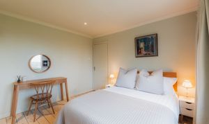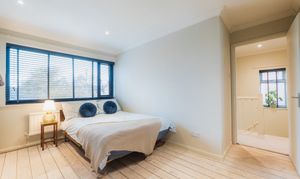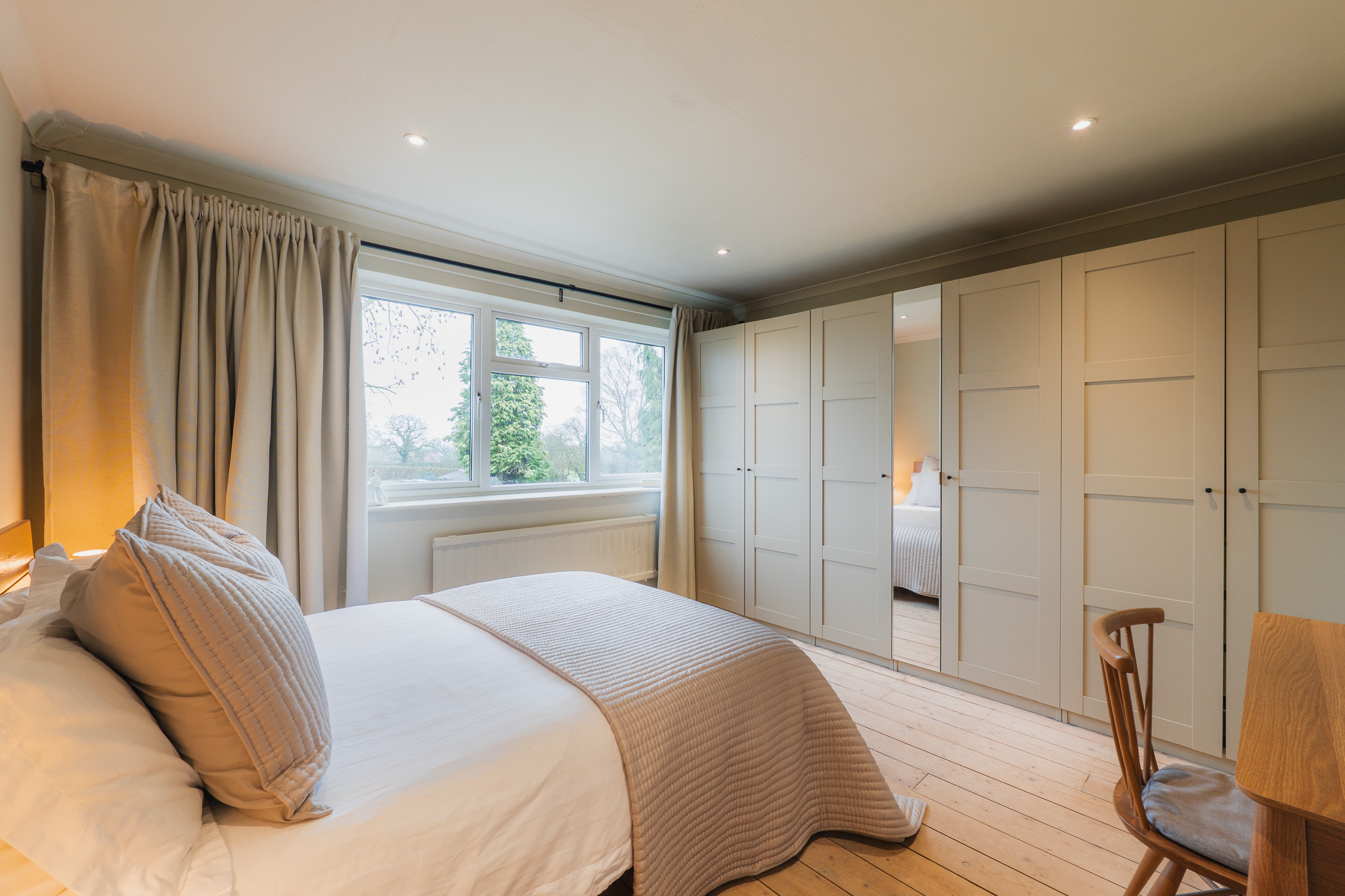 Overlooking the garden and open views to the rear, the master bedroom is simple and elegant in its design with a wall of modern wardrobes: a peaceful retreat.