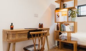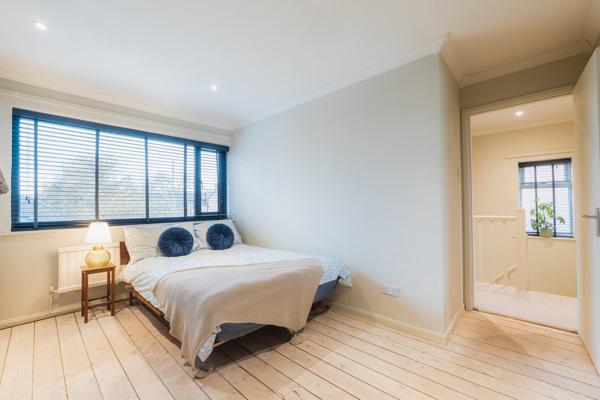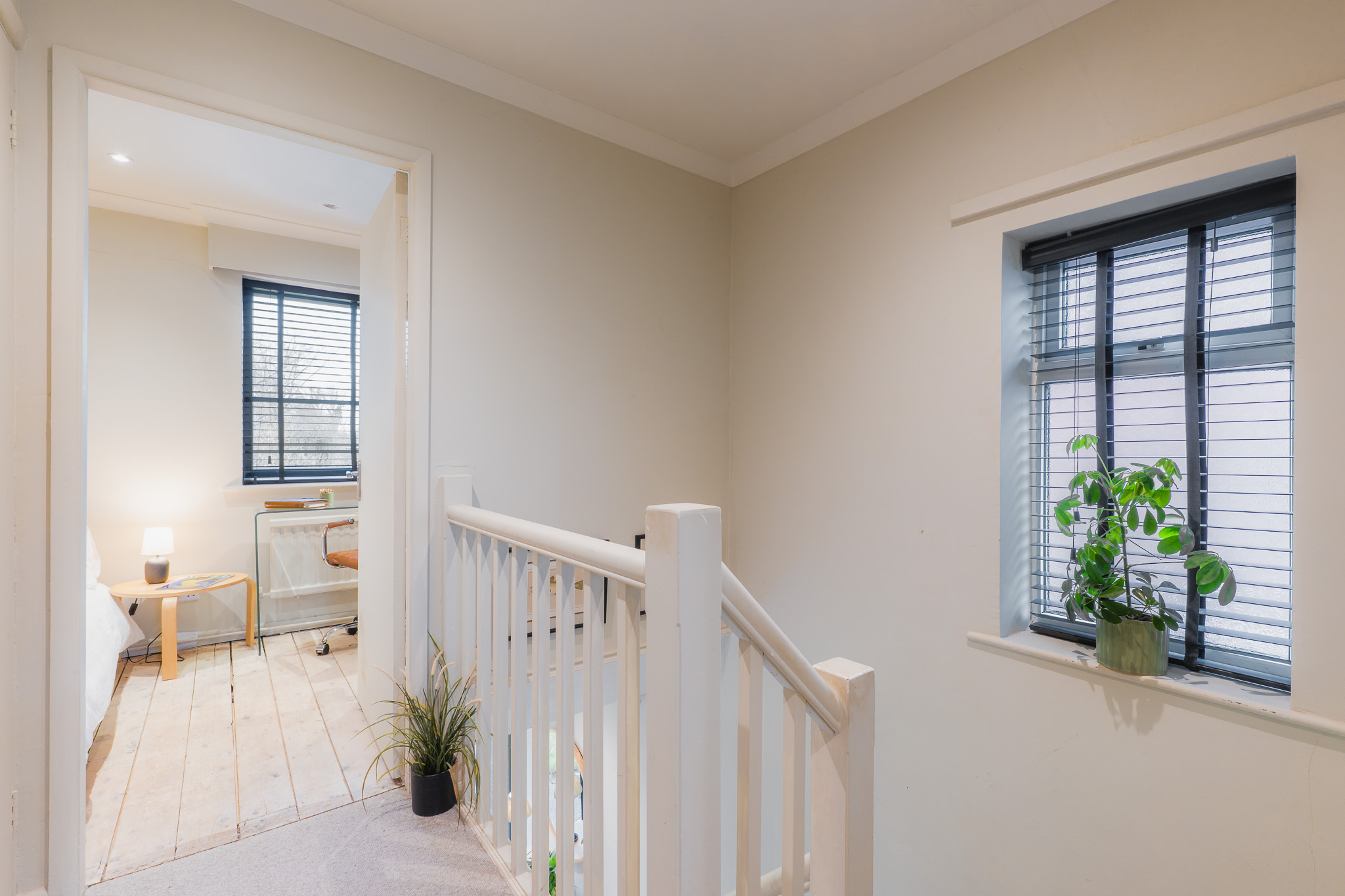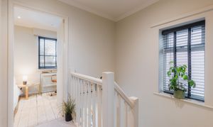 Make your way up the carpeted stairs to the first-floor landing, turning right to find a natural study or bedroom, shelved and with views to the front through a blind fitted window.