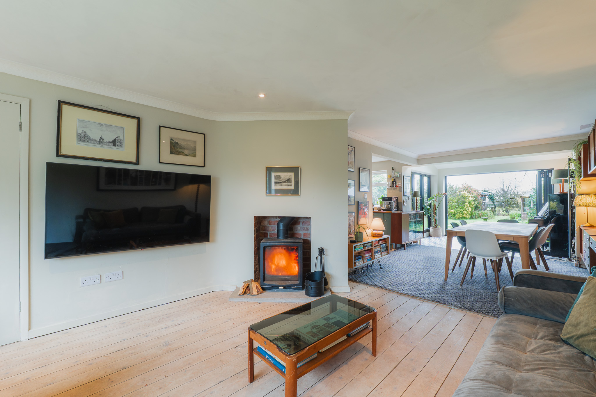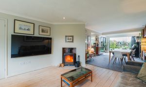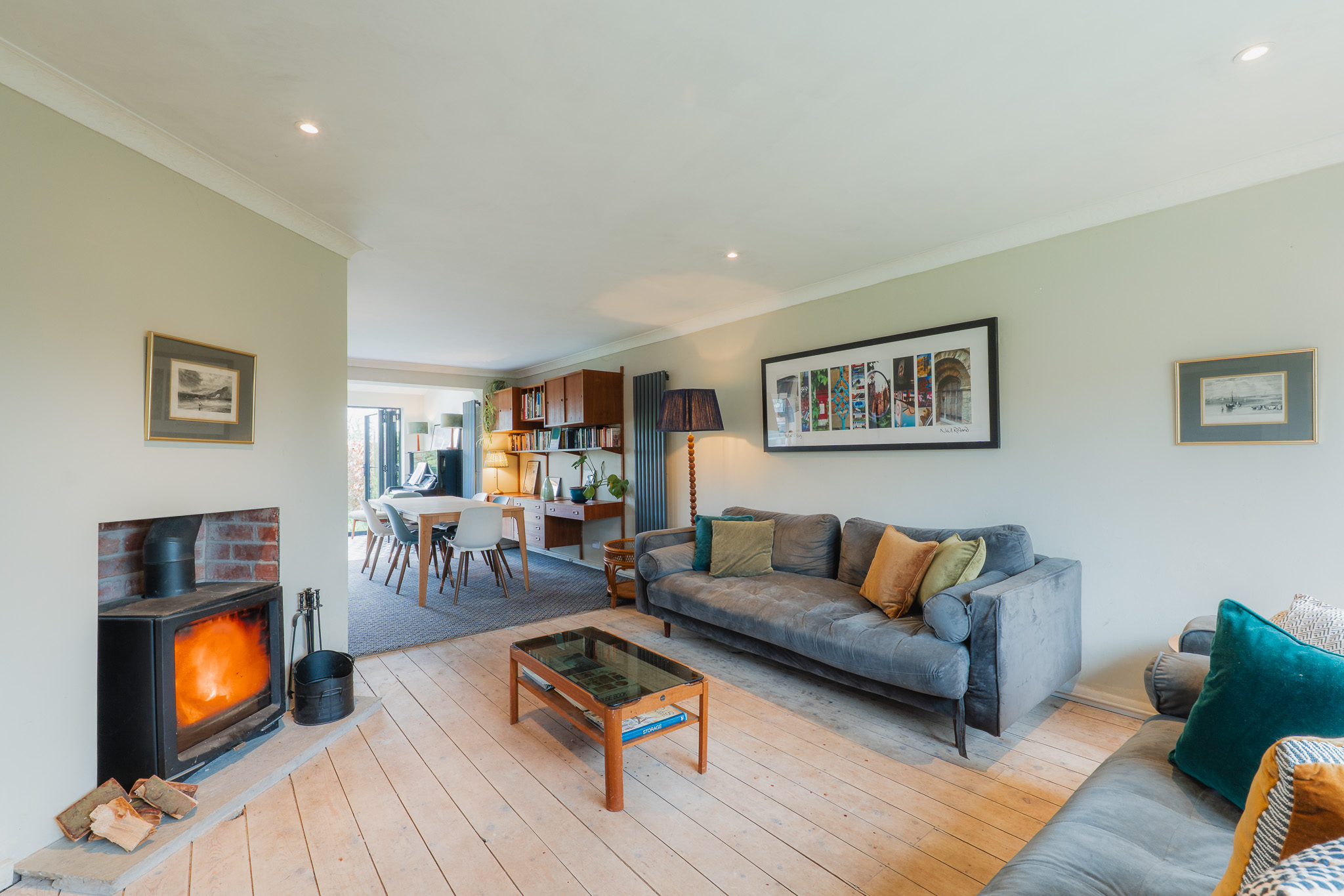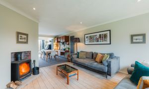 From the entrance hallway, original floorboards treated with a Danish whitening oil, introduce a soft, pale Scandinavian tone that flows underfoot into the lounge to the right. A good-sized log burner, positioned at an angle, creates a natural division within the room, forming a cosy seating area to the front where a wide window draws in plenty of light.