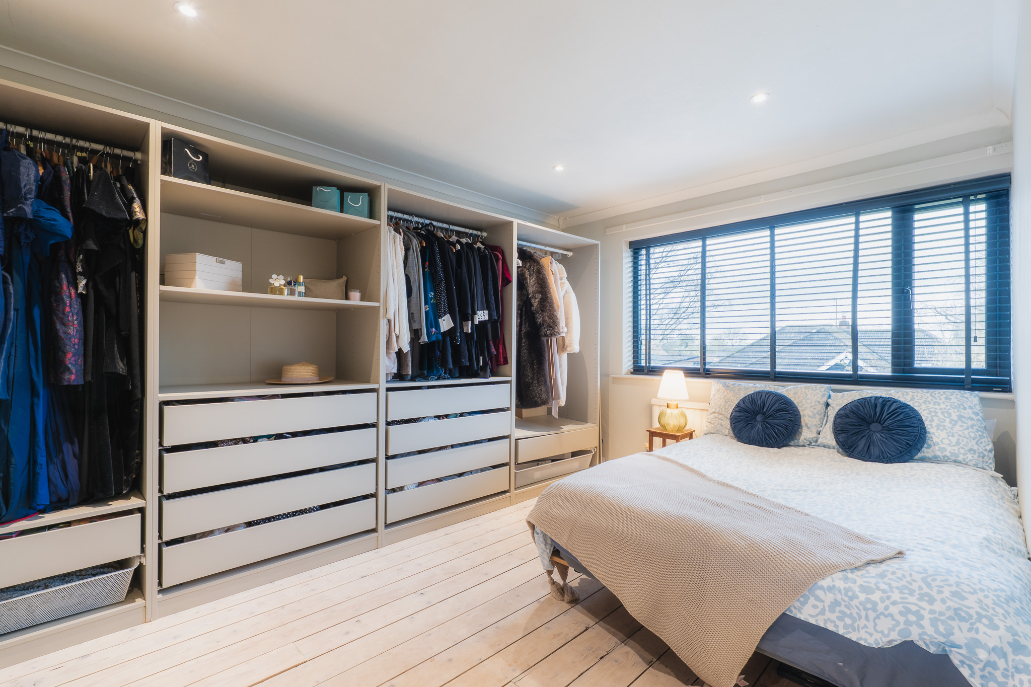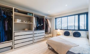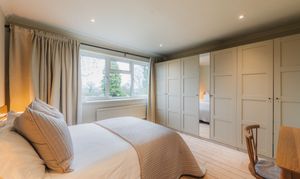 Next door, the same flooring features in the guest bedroom, where large open fronted wardrobes with drawers beneath provide plenty of storage. A spacious double, views again extend to the front garden.