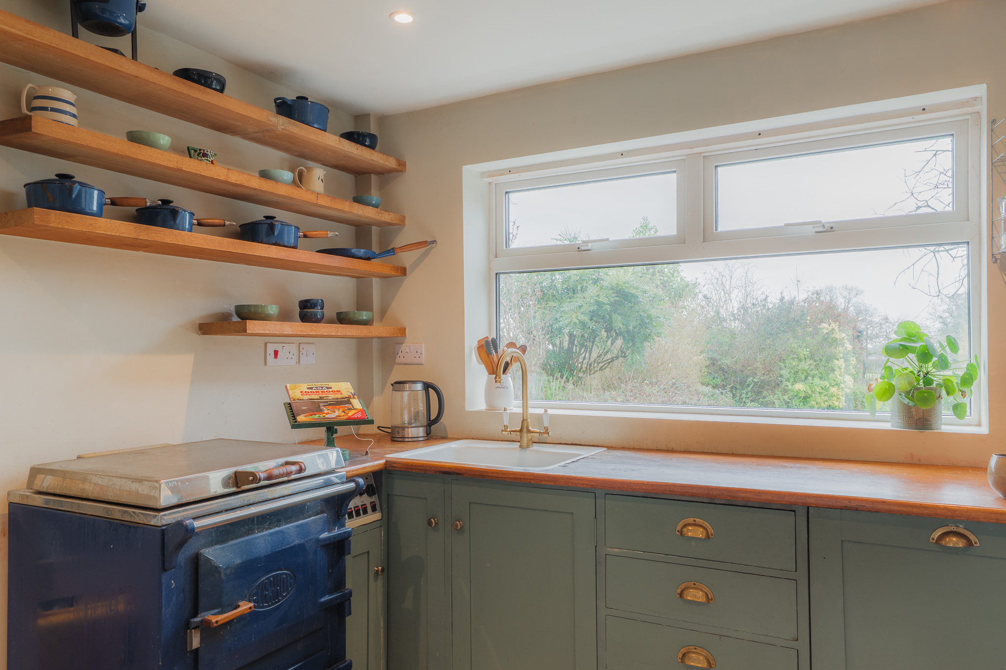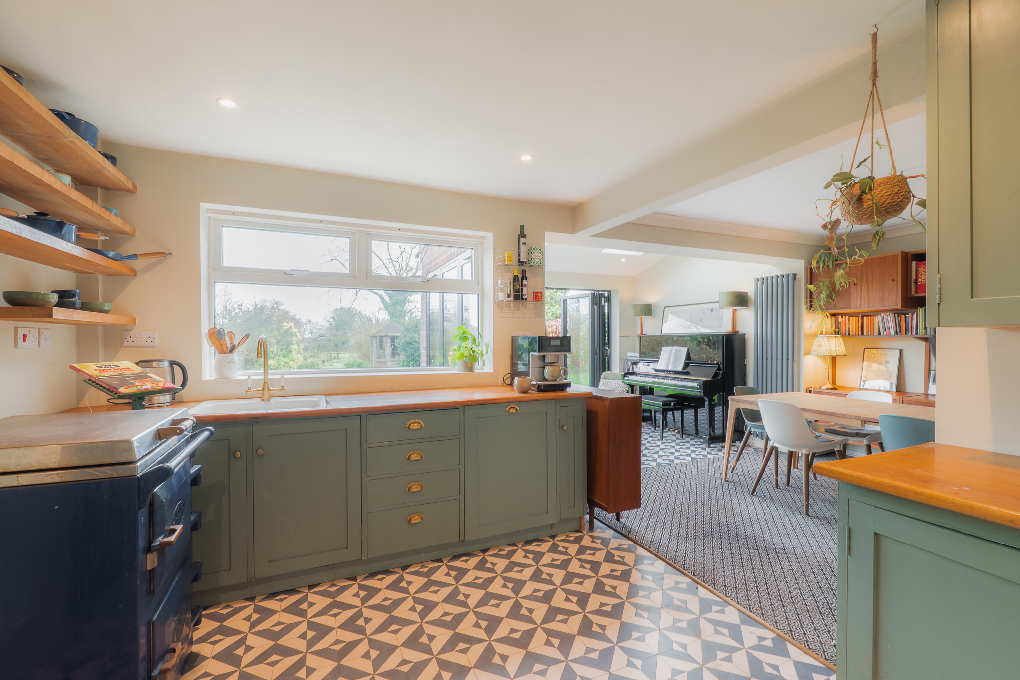Furnished with an electric Everhot range (available by separate negotiation), the minimalist ambience of the home is warmed by the rustic-French feel of the hand-built cabinetry, reclaimed from a London home and meticulously refitted, with leftover oak from the worktops repurposed to create floating shelves. Cupboards painted in Farrow & Ball’s Green Smoke balance the tiling underfoot with a rich blue-green palette, complemented by a white Belfast sink with antique brass taps and integrated appliances including a dishwasher.