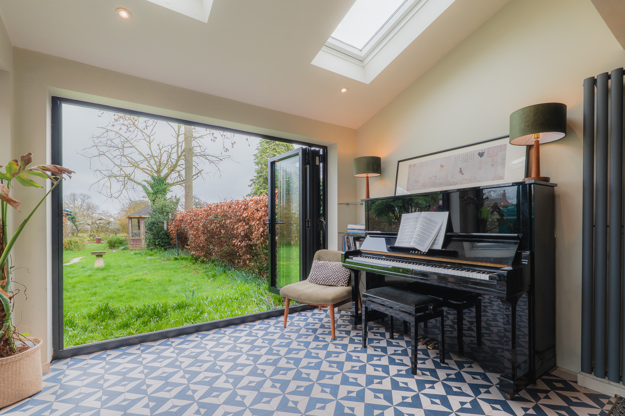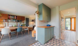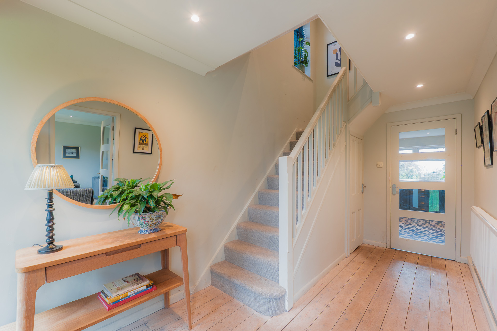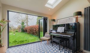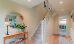 Outside, the porch, redesigned with glass panels and tiled in handmade Fired Earth blue tiles, draws an abundance of natural light through into the entrance hallway, accessed via a solid oak front door with polished chrome T-bar handle. Inside, the entrance hall is a broad and bright space decorated in Farrow & Ball Shaded White to the walls with All White across the ceiling.