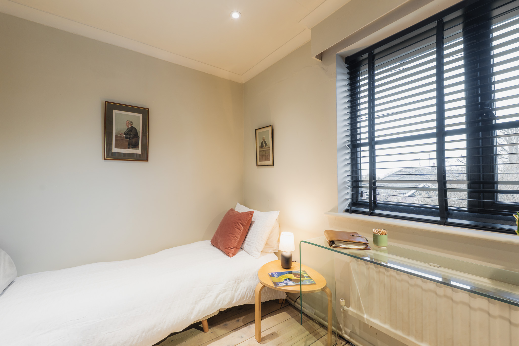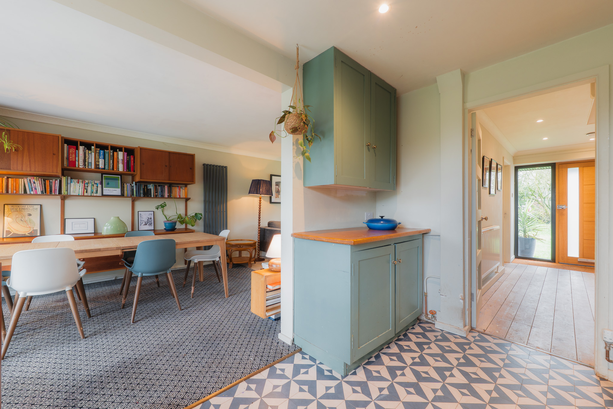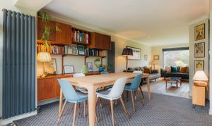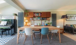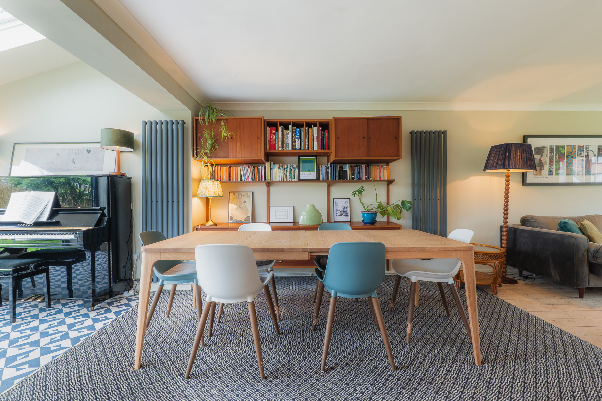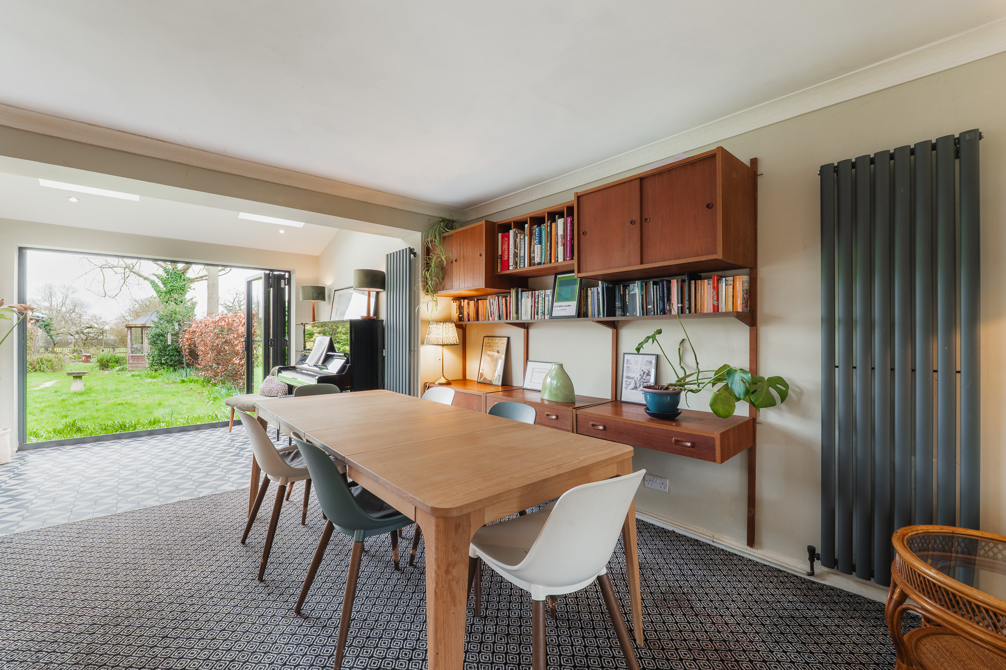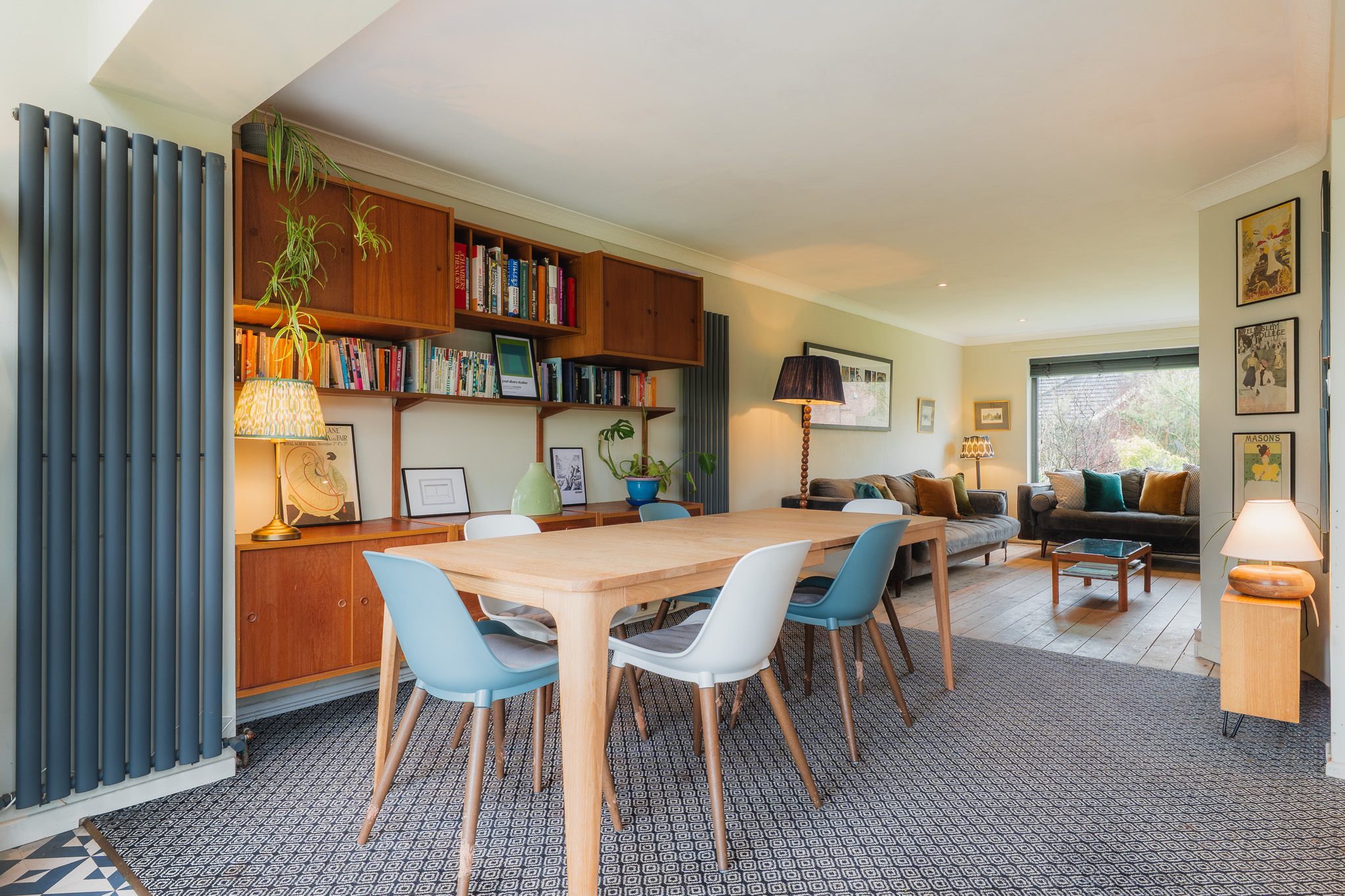 Elsewhere, new vertical radiators introduce a contemporary edge, while replacement windows in sleek black frames and carefully chosen blinds sharpen the home’s mid-century character.
