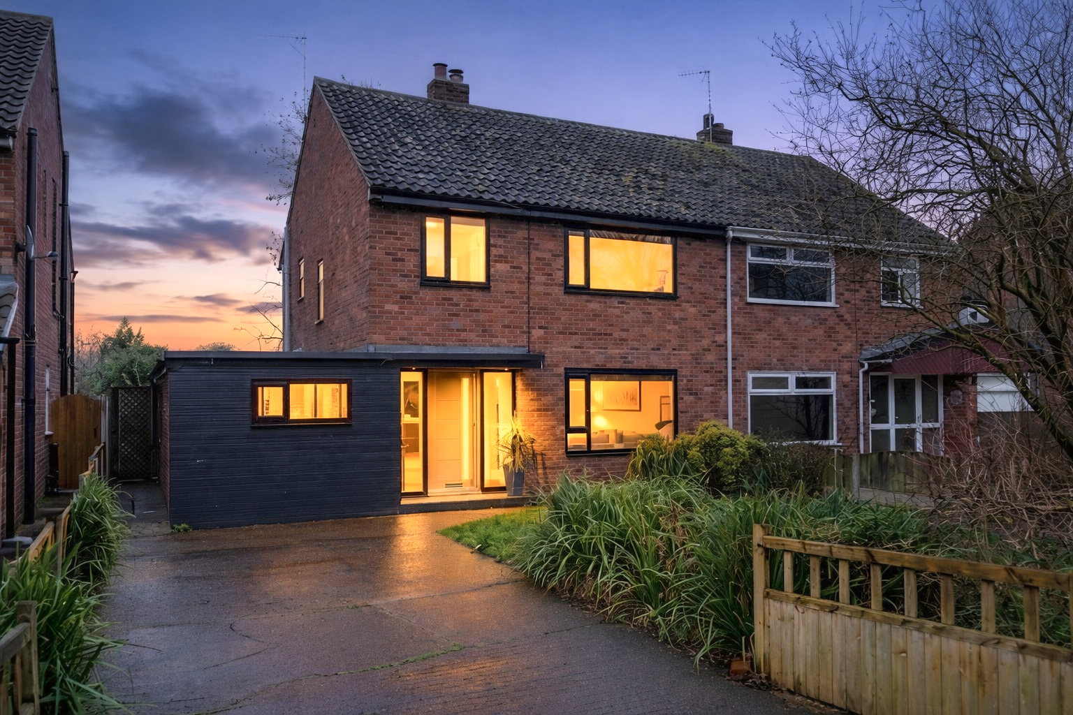Pull onto the driveway where there is comfortably parking for two large cars, alongside the traditionally lawned garden and its neatly planted garden to the front.