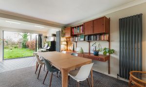 Returning to the main open plan living-dining-kitchen, at the far end, the room has been opened up by the current owners, with a heightened ceiling, new sky lights and bifolding doors pulling back to bring the garden in; perfect for balmy summer days.