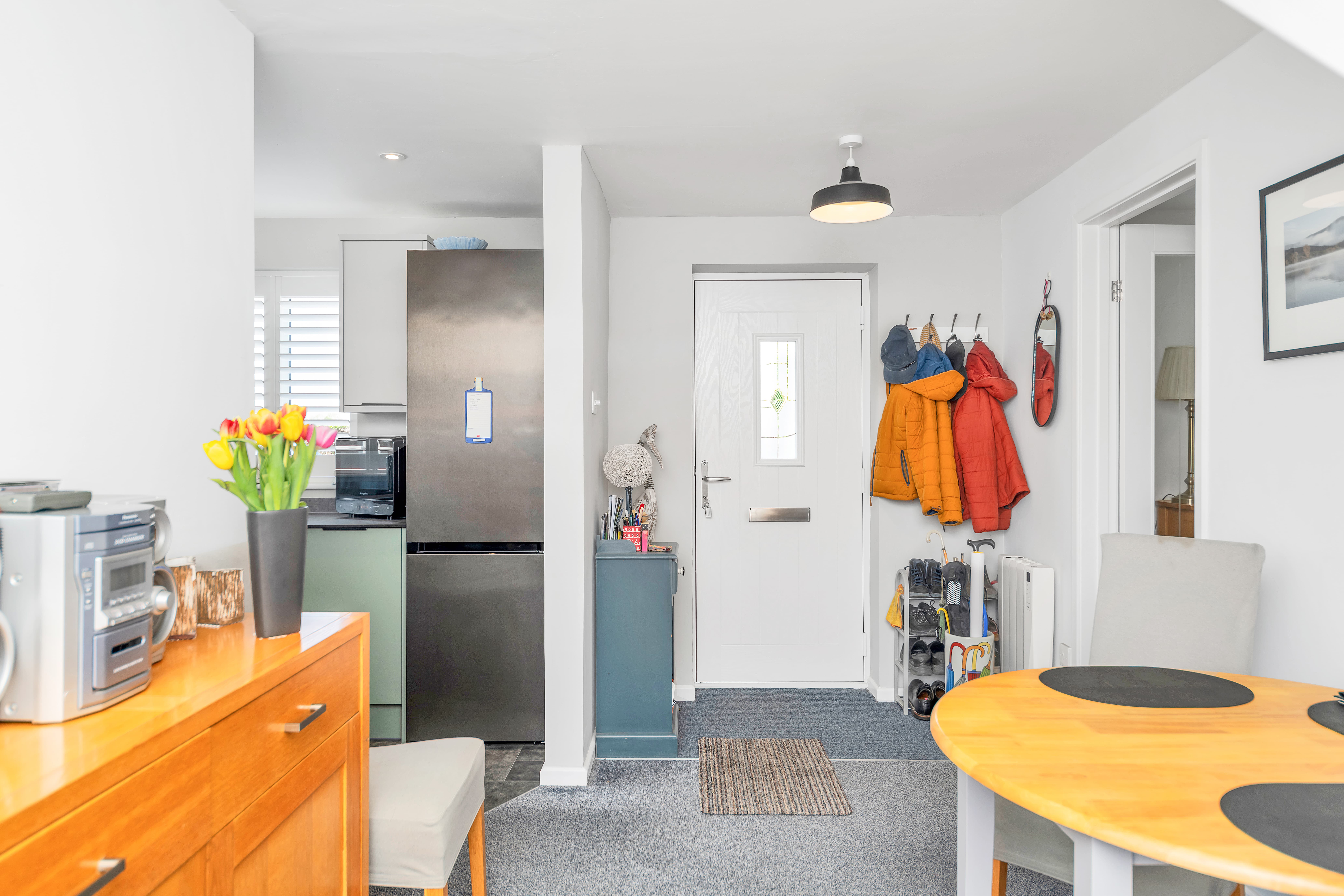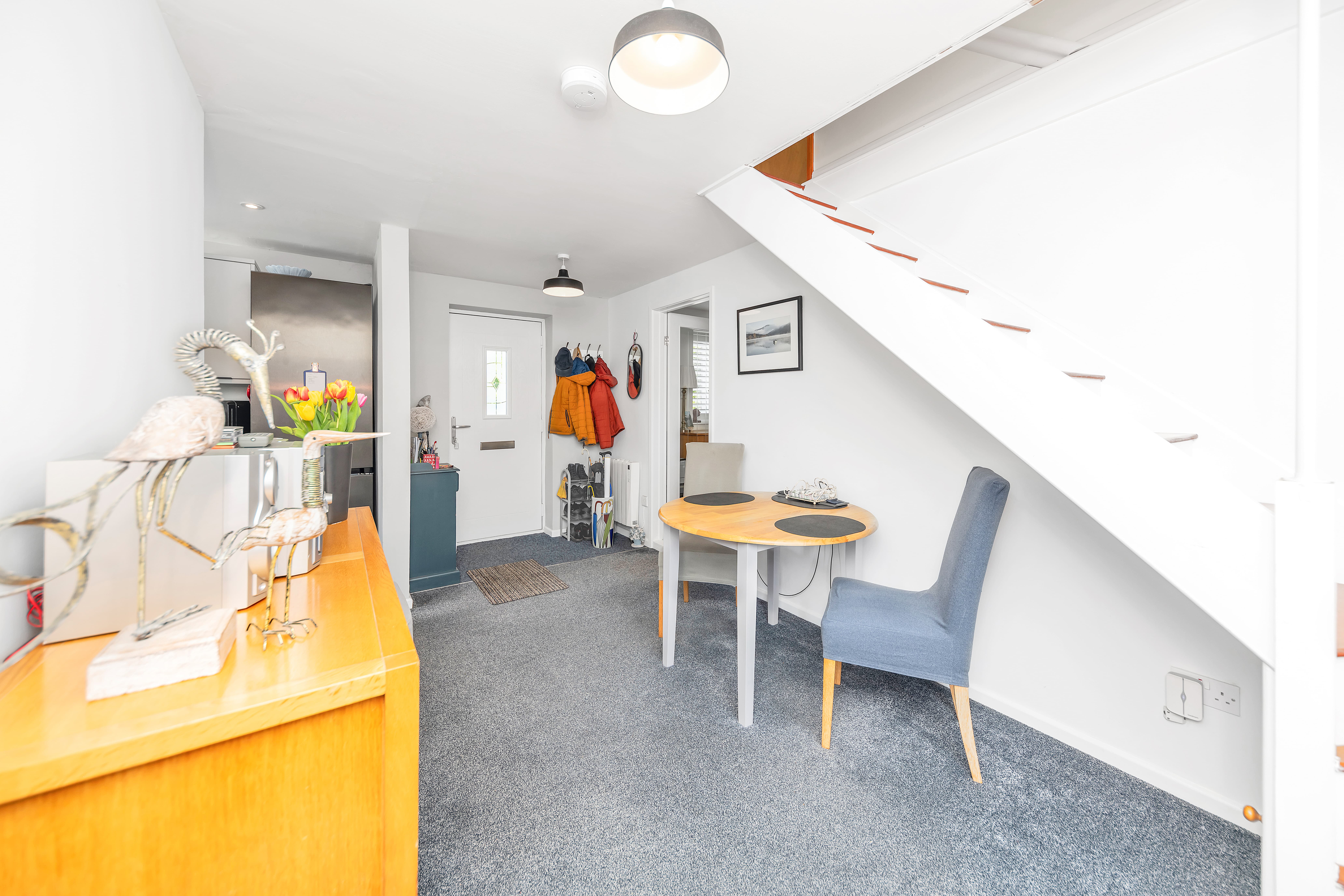 This beautiful home enjoys excellent kerb appeal, with a tidy and attractive frontage which is finished in monocouche render, front lawn gardens, gravel borders, space for potted plants and gated access to the rear. The front door opens up into a bright and beautifully decorated dining room, benefiting from thick carpets, pendant lighting, storage, stairs to the first floor, and ample room for furniture. The lounge adjacent is equally bright and spacious, enjoying wood flooring, pendant lighting, windows to a dual aspect, integrated storage, and space for a variety of lounge furniture.