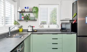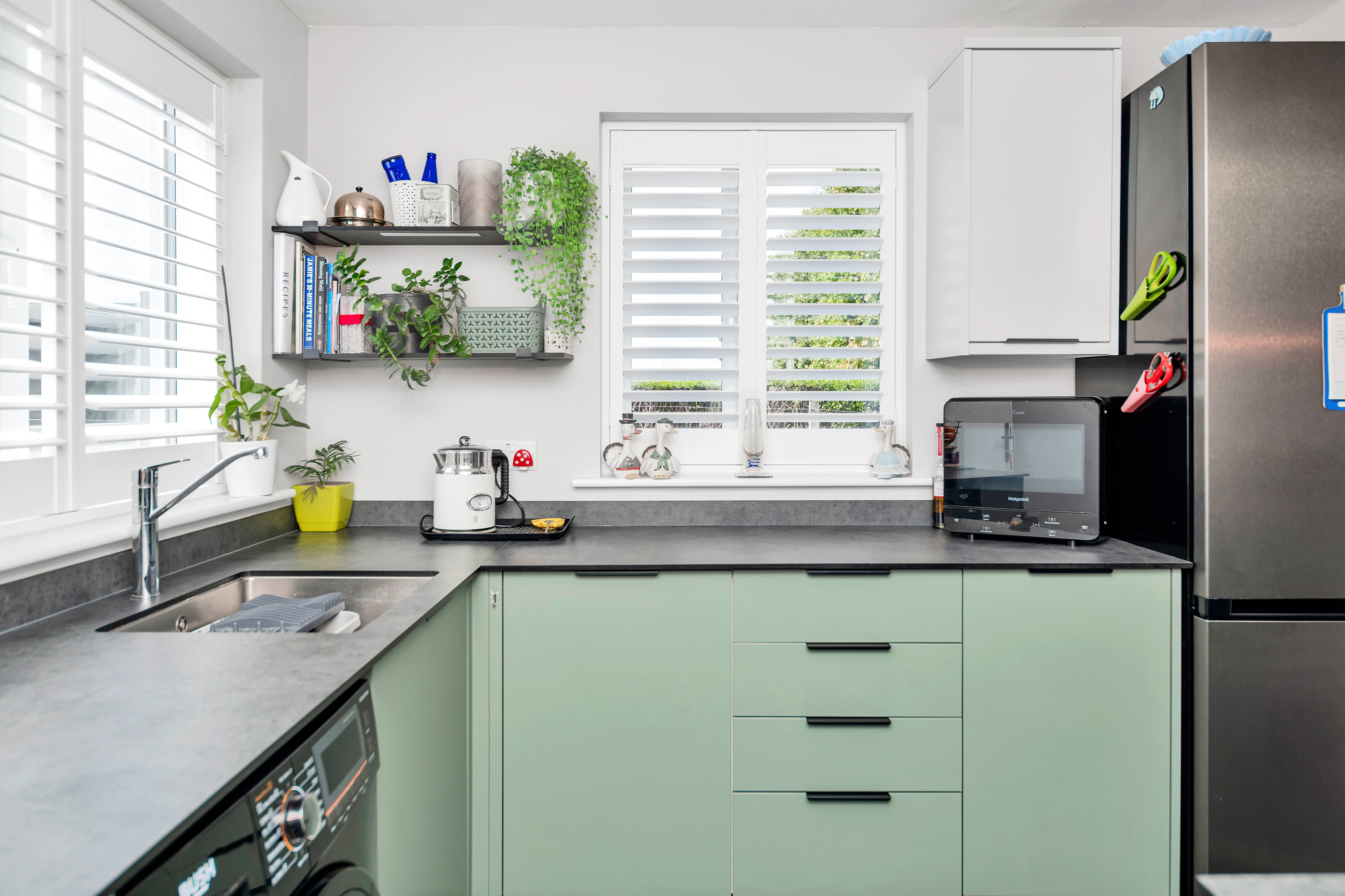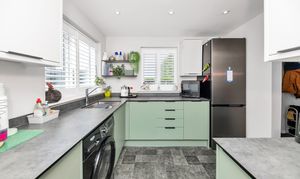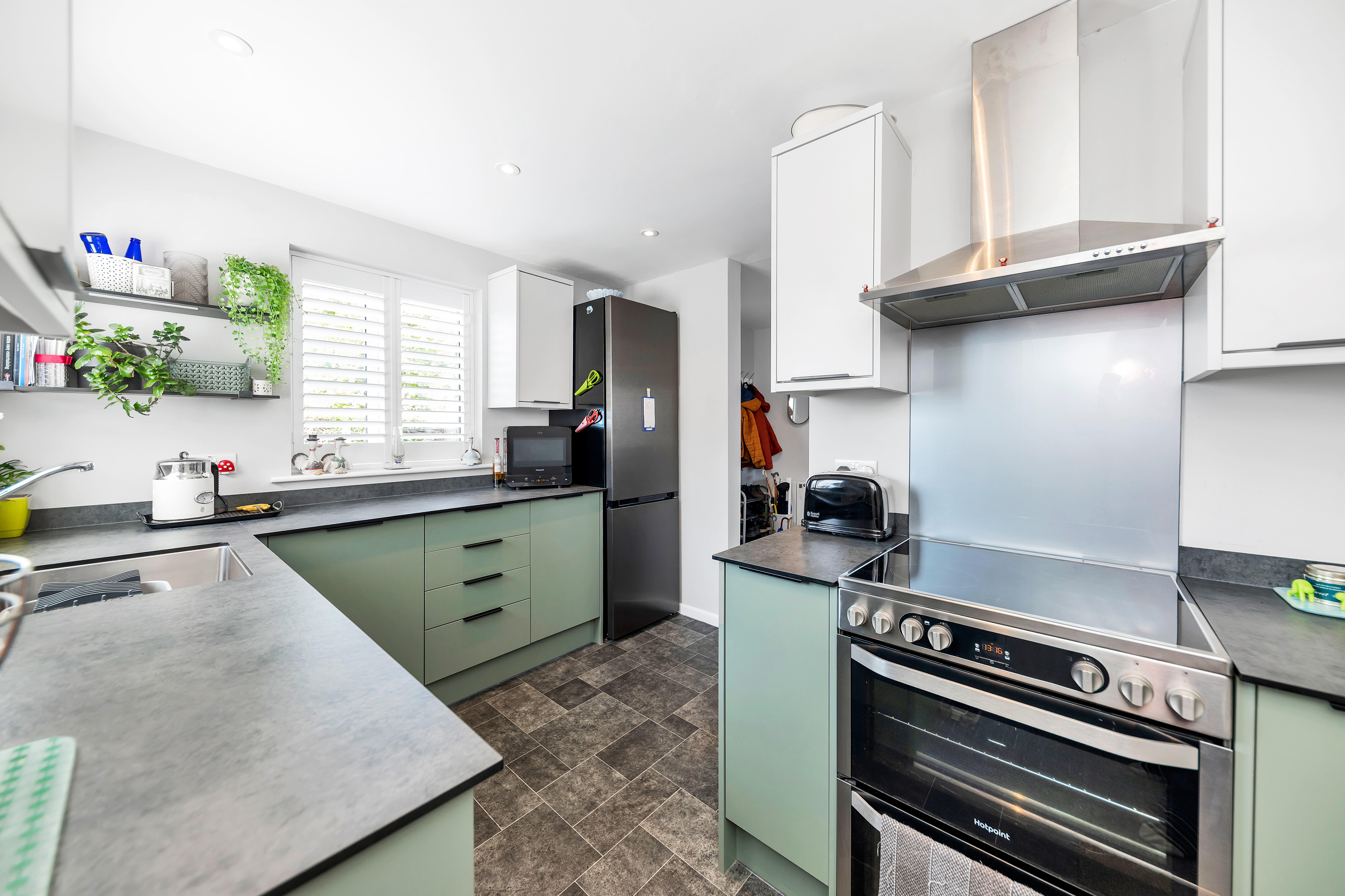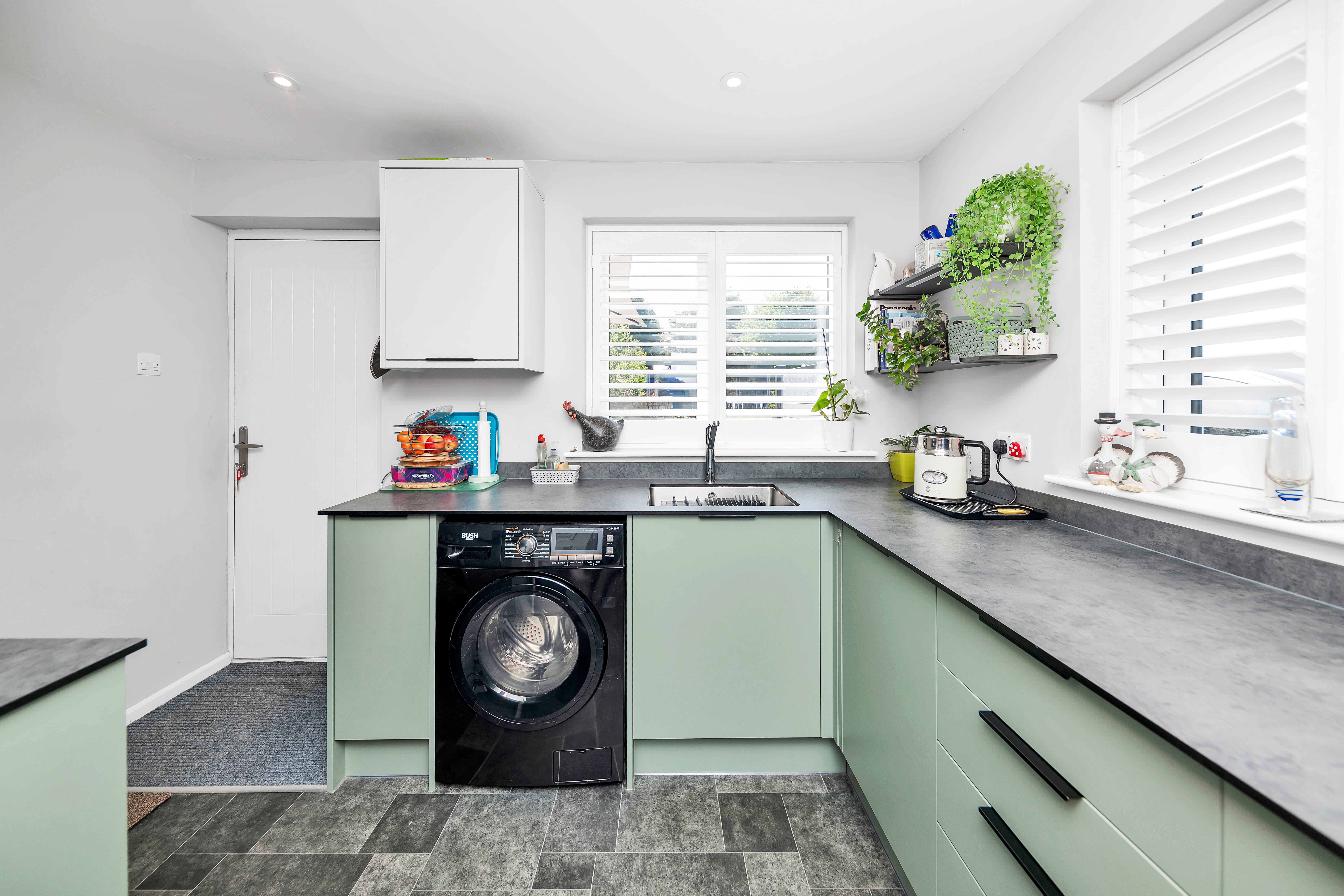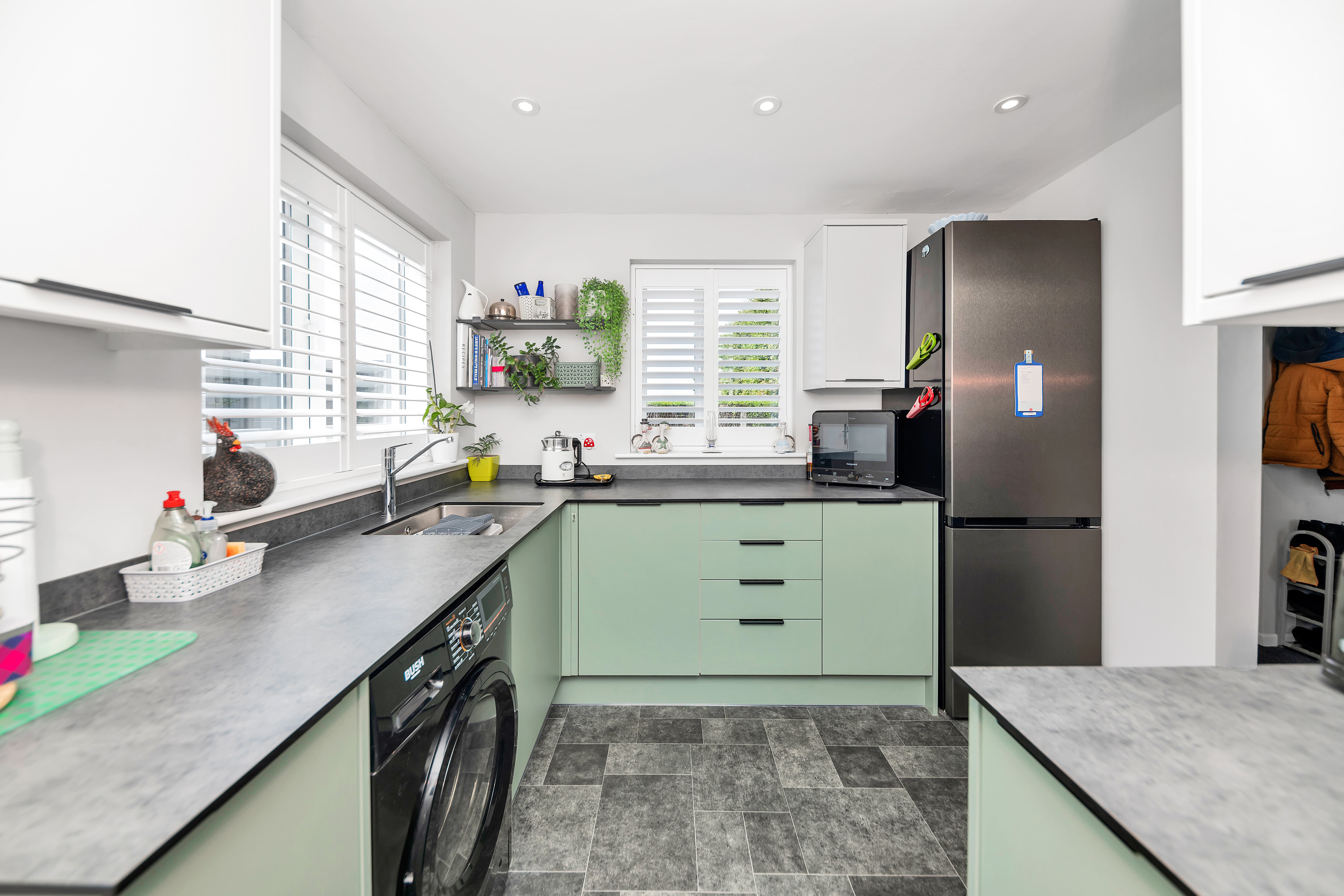 The kitchen is a very attractive room, featuring windows and a door to a dual aspect, a range of two-toned base and wall units, composite worktops, cushion-vinyl flooring with tile effect, inset lighting, an integrated extractor hood, and space for an oven, fridge/freezer, washing machine and other small kitchen appliances.
