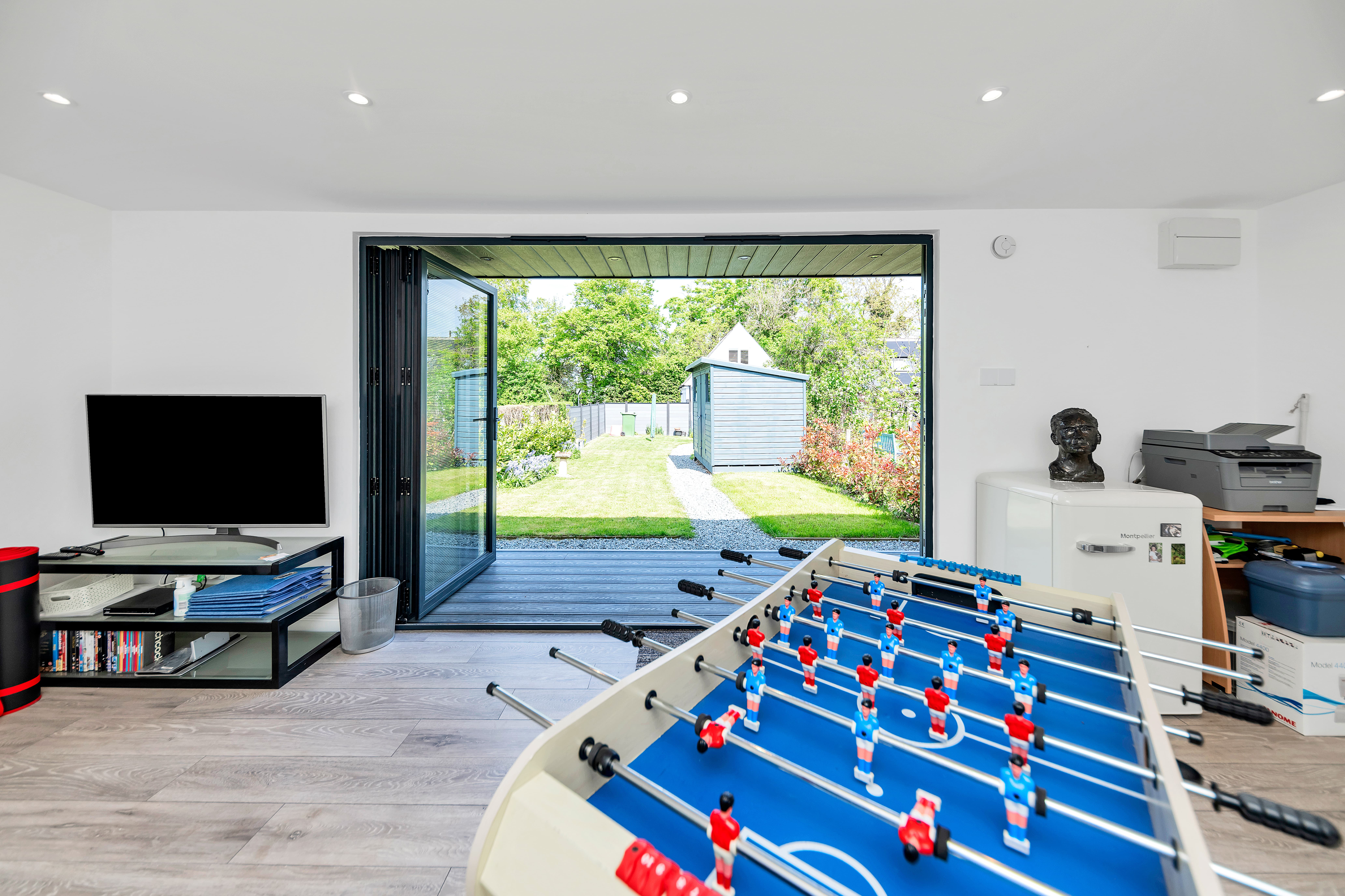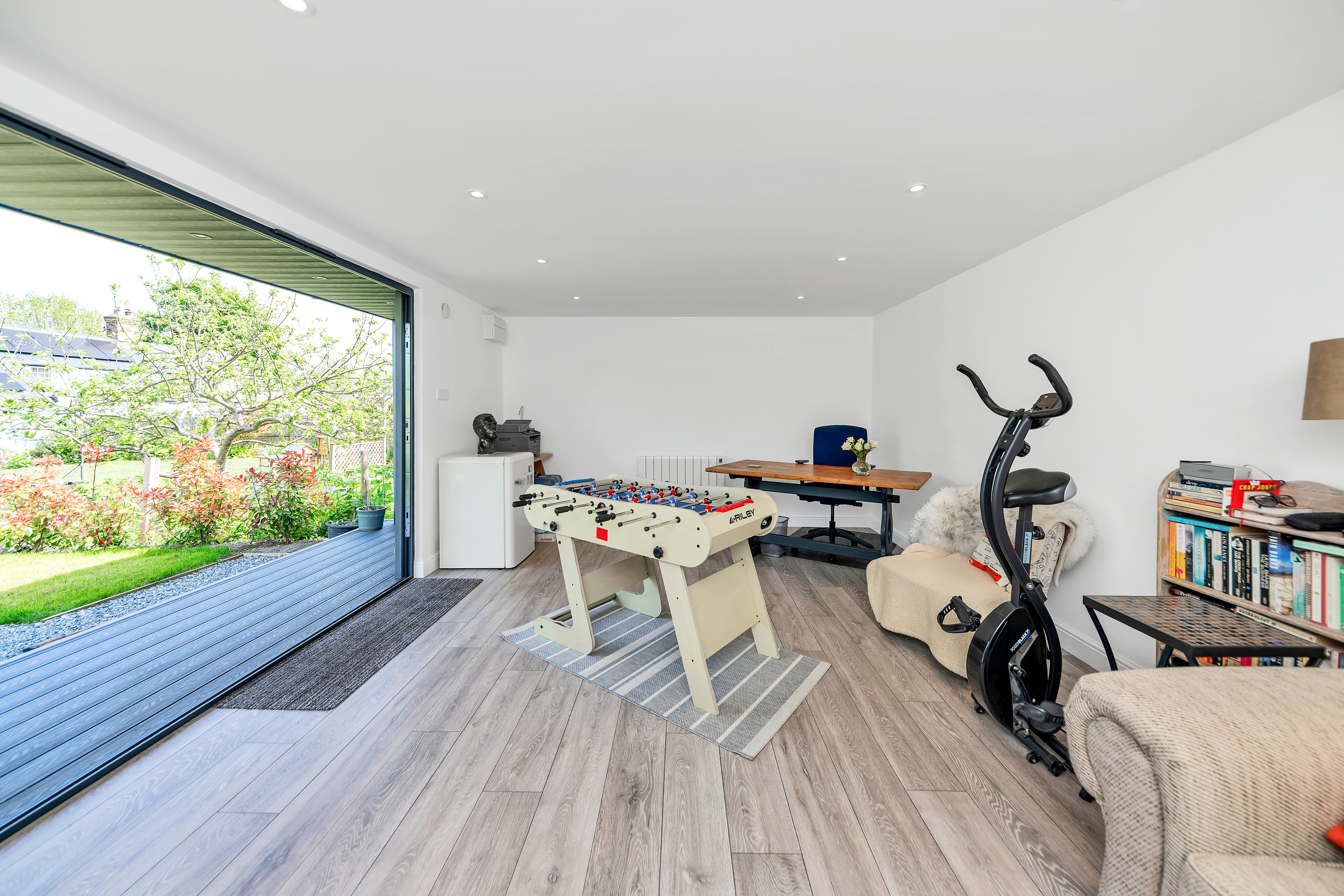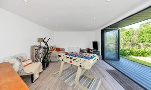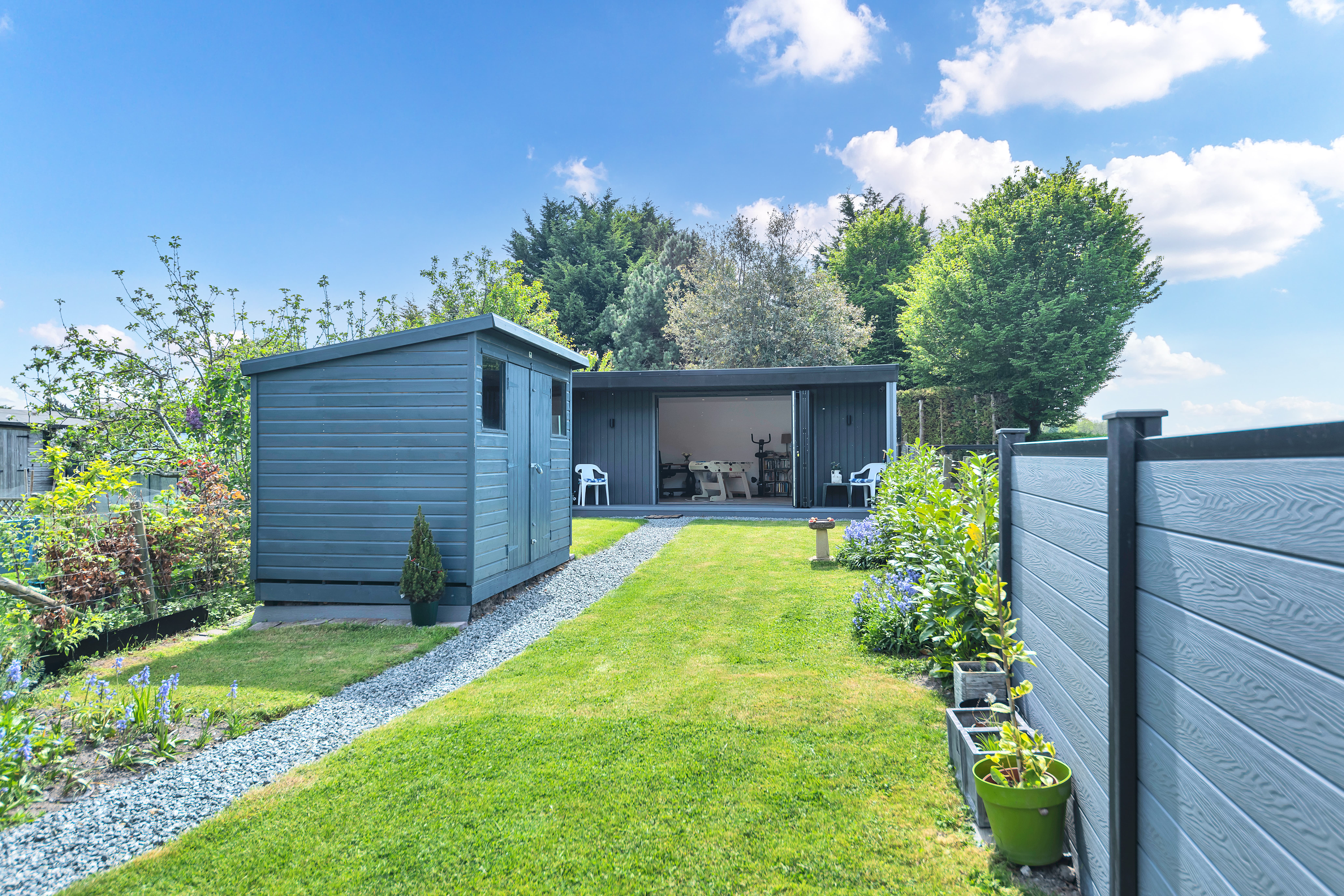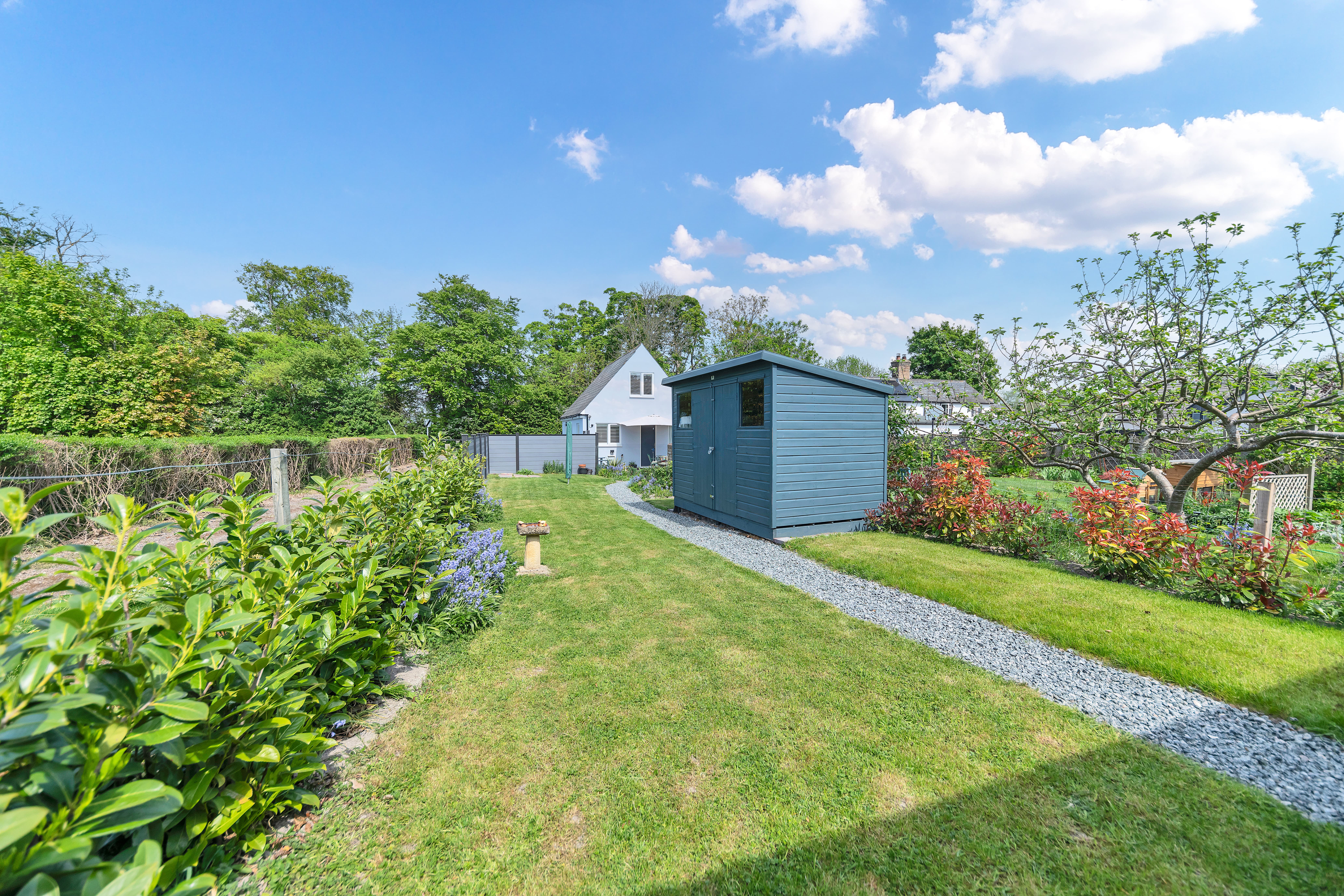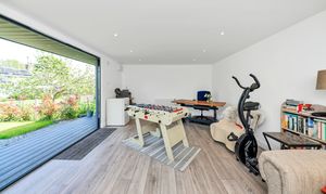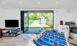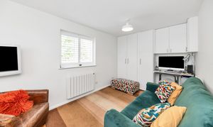 Outside, to the rear, the garden is an excellent size, fully enclosed by fencing and brick walls and offering multiple lovely spots to sit and relax during the warmer months. It is laid mainly to lawn with paved patio just by the house, providing space for garden furniture, cooking al fresco and entertaining guests. There are some beautifully maintained borders, full of colourful flowers, plants and shrubs, access to a large shed, and access to a stunning garden studio, with bi-fold doors to the garden, power and lighting, which offers the perfect to area to relax, entertain or even work from.