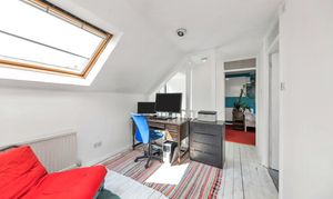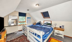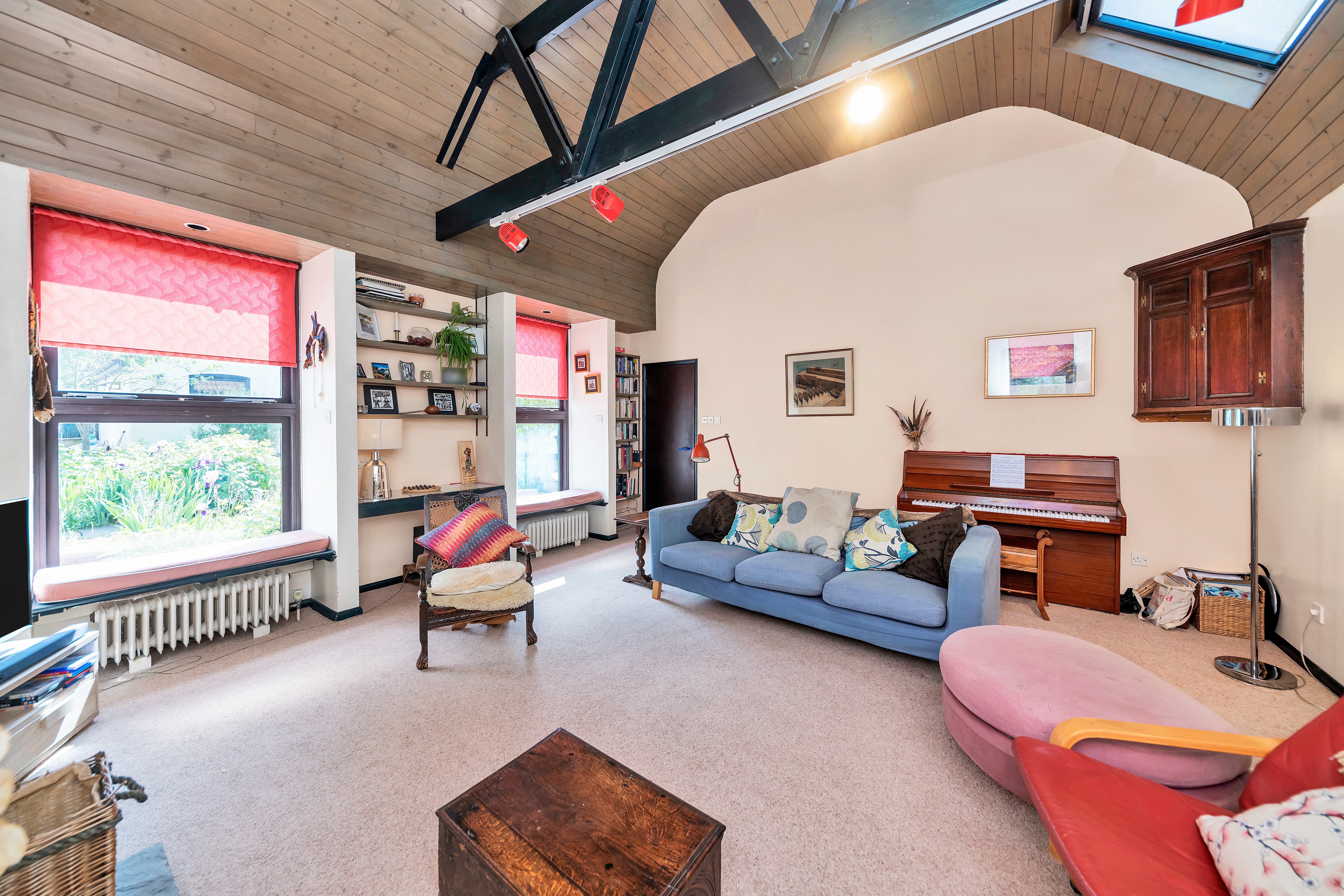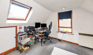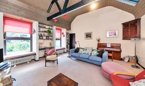 The lounge is equally an exceptionally large space, benefiting from stunning vaulted ceilings, windows to a front and side aspect, Velux windows, a fireplace, carpets, spot lighting, and vast amounts of space for lounge and storage furniture.