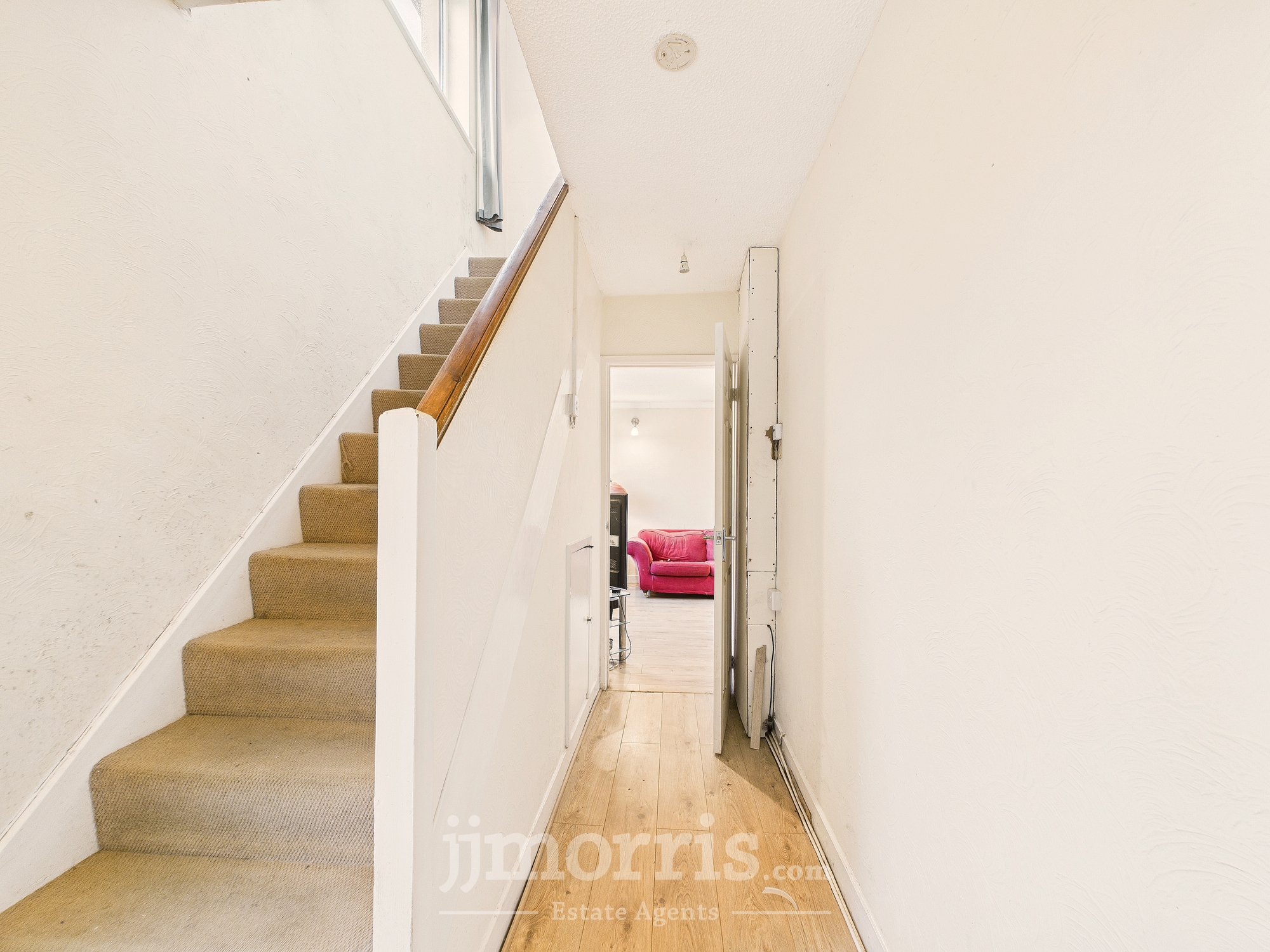 ("L" shaped maximum). With a laminate wood floor, understairs cupboard with electric light, ceiling light, smoke detector (not tested), 1 power point, telephone point, concealed radiator, staircase to First Floor and doors to Sitting Room and:-