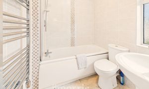 With ceramic tile floor, fully tiled walls, white suite of panelled Bath, Wash Hand Basin and WC, Mira Sport Electric Shower over Bath, glazed shower screen, ceiling light, extractor fan, mirror fronted bathroom cabinet, shaver point, uPVC double glazed window and a Chrome heated towel rail/radiator.