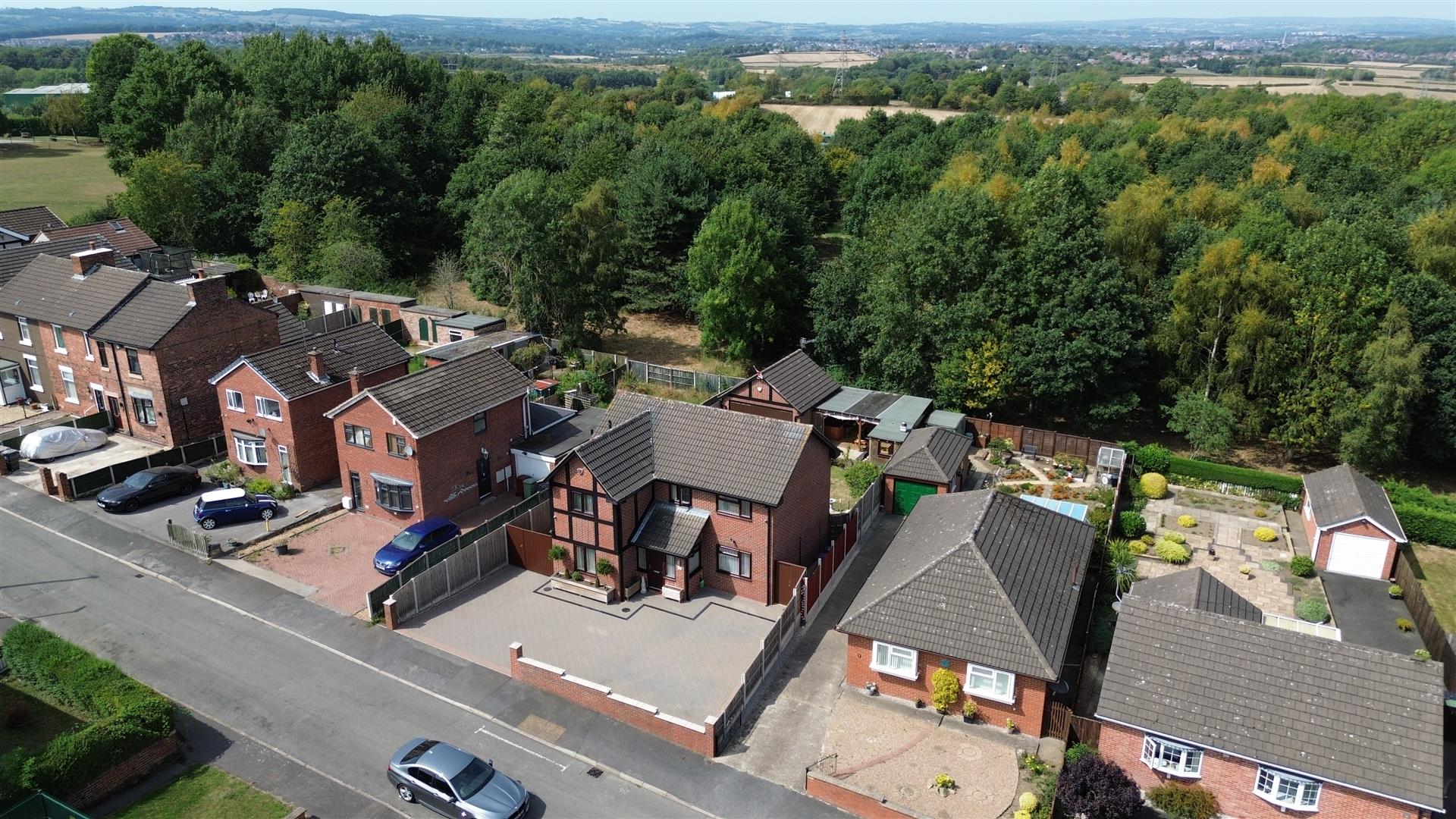 Set well back from the road behind a low wall, the property has a broad block-paved driveway with secure gated side access, continuing to a large detached double garage with power, lighting, a powered door and alarm. The enclosed rear garden is made for entertaining, featuring a wide patio, lawn and a garden bar/BBQ zone with built-in oven, wall-mounted TV and multiple seating areas. Convenient for the M1 and Chesterfield town centre, with excellent transport links and everyday amenities close by.