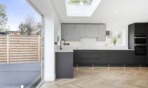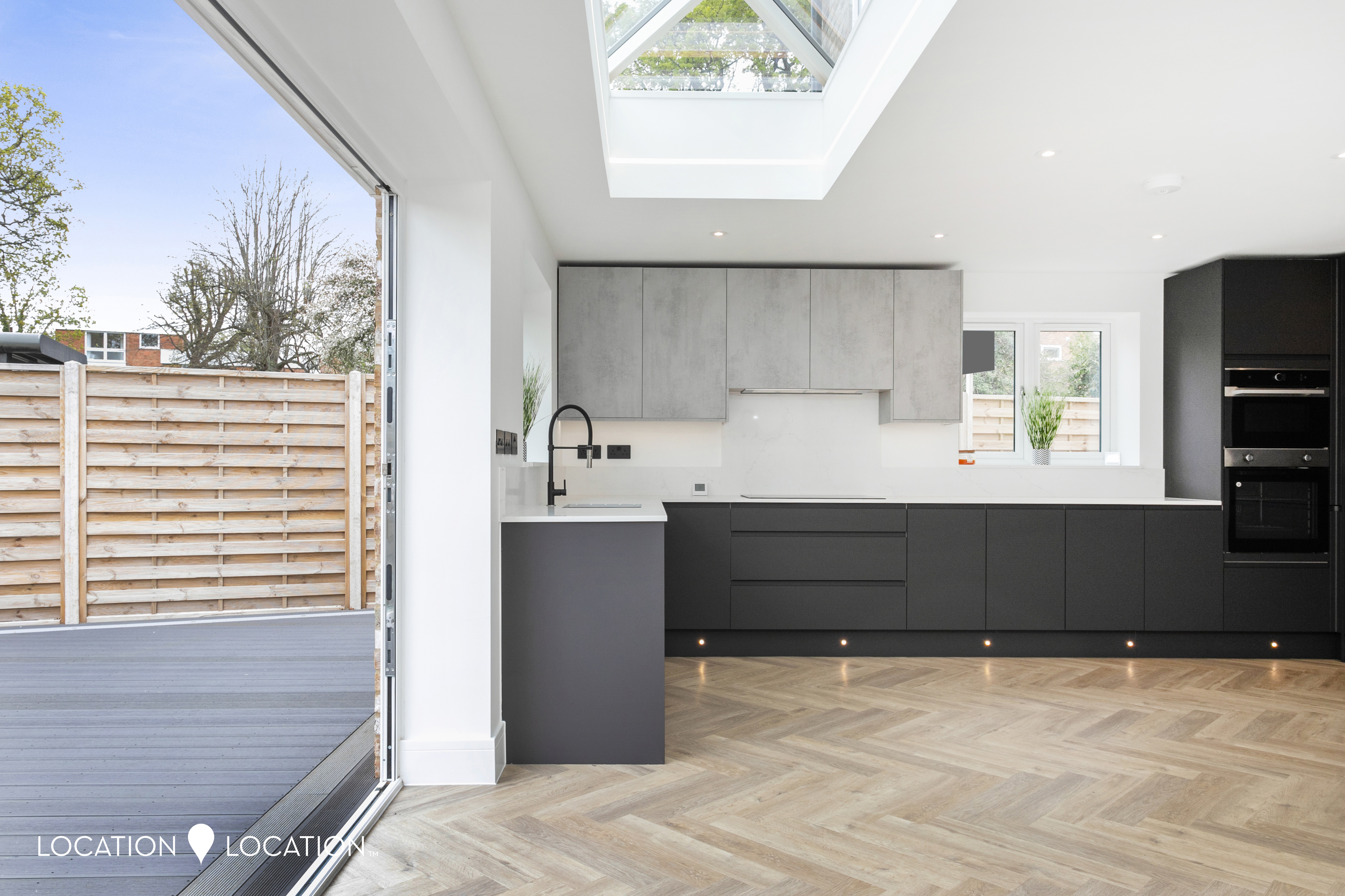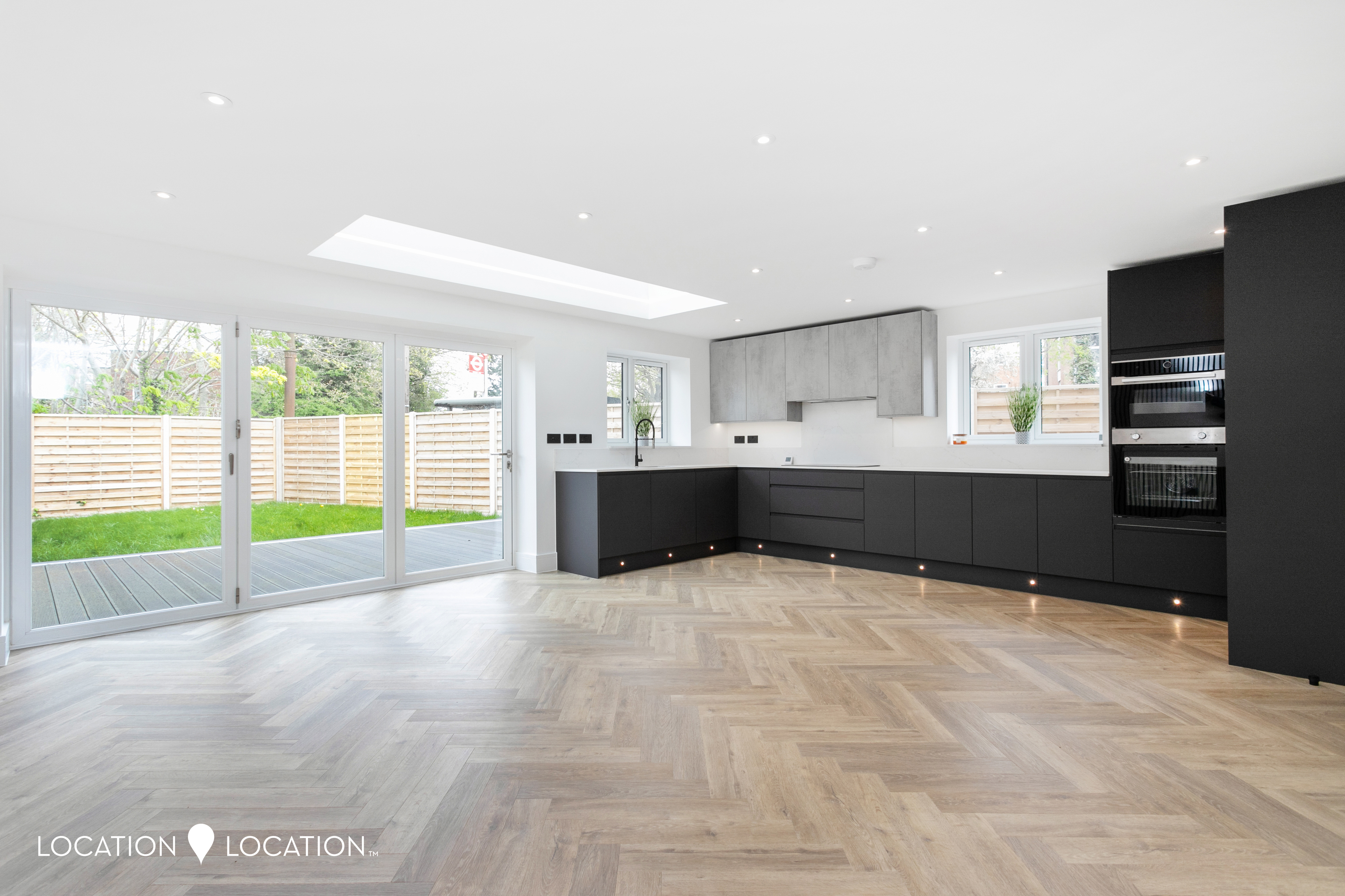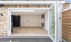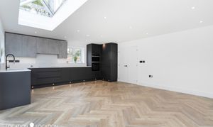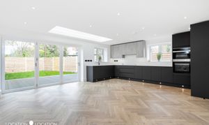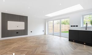 The impressive detached double fronted new build house boasts a contemporary design, showcasing parquet flooring throughout the ground floor, complete with guest wc and front reception room. Natural light floods the large open plan kitchen living room, thanks to a large pitched skylight and bifolding doors leading to the garden. The high-end modern kitchen is a culinary enthusiast's dream, with integrated appliances and sleek design elements.