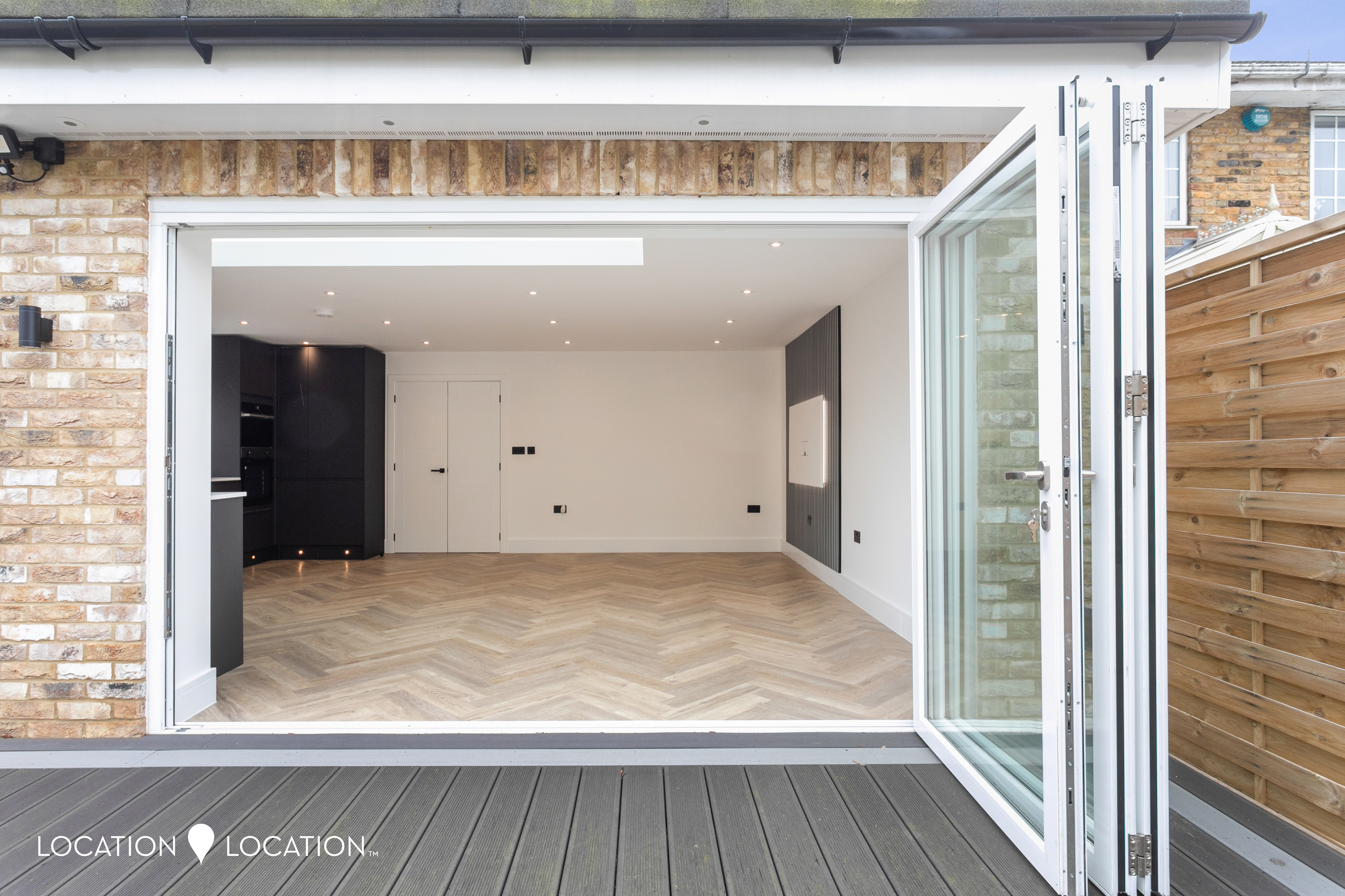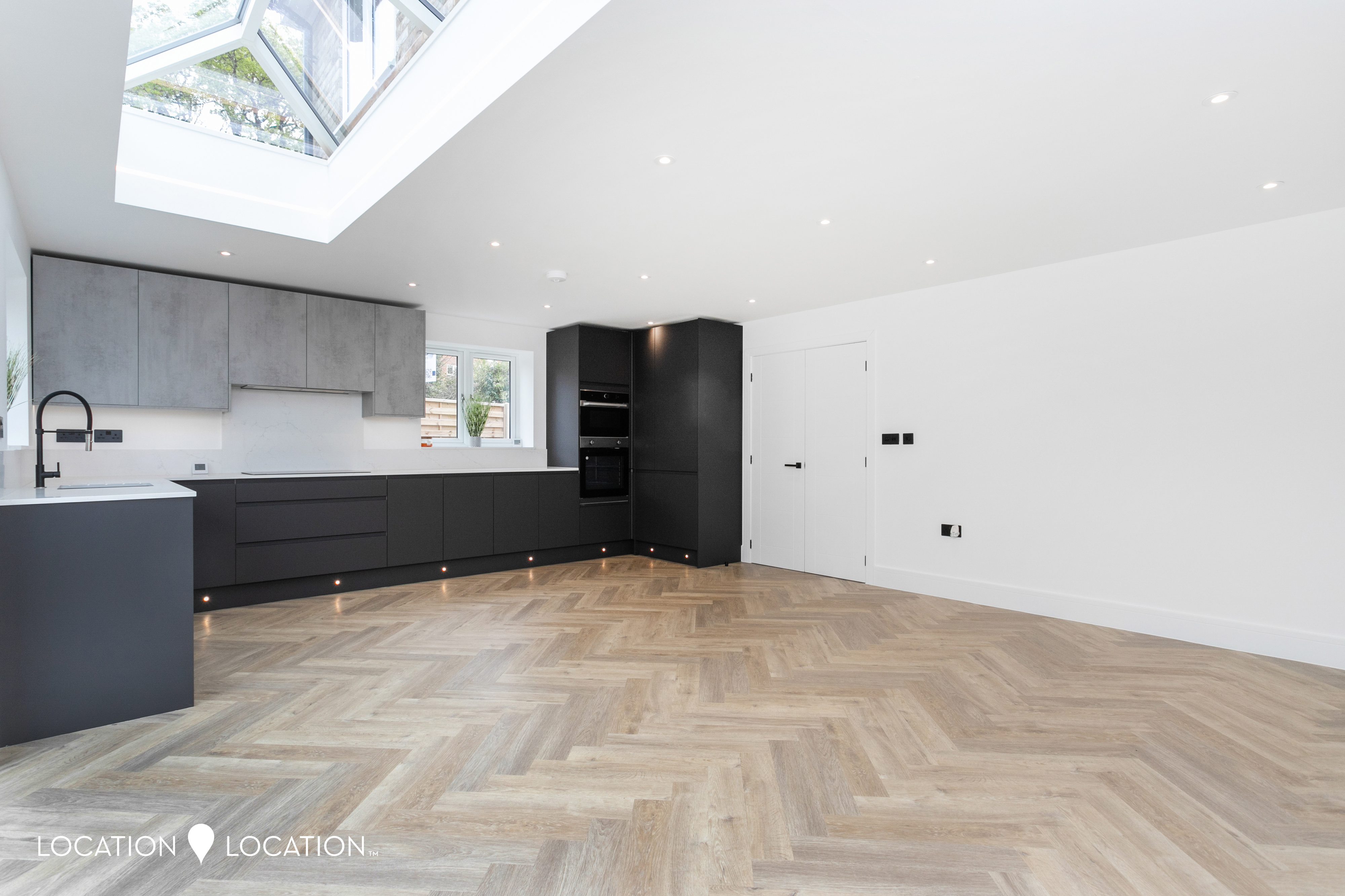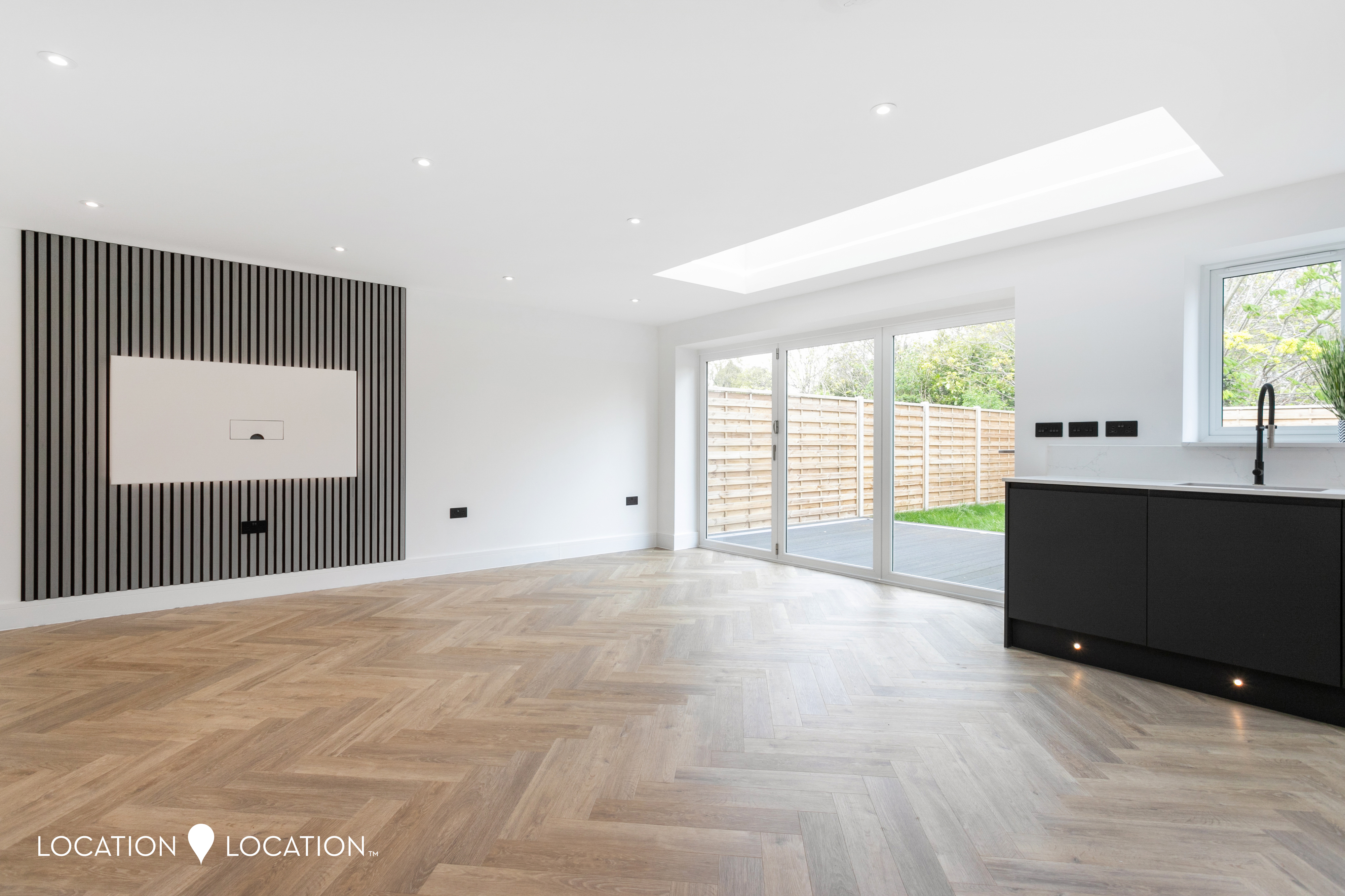 The impressive detached double fronted new build house boasts a contemporary design, showcasing parquet flooring throughout the ground floor, complete with guest wc and front reception room. Natural light floods the large open plan kitchen living room, thanks to a large pitched skylight and bifolding doors leading to the garden. The high-end modern kitchen is a culinary enthusiast's dream, with integrated appliances and sleek design elements.