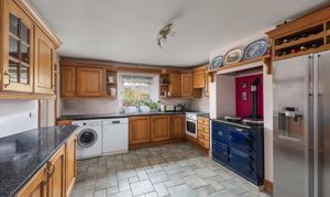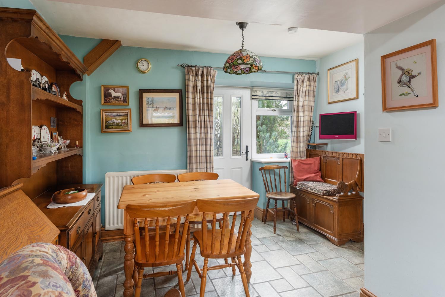 The traditional farmhouse kitchen is a capable workspace fitted with solid oak cabinetry and tiled flooring. A classic AGA range sits within the chimney recess, complemented by additional cooking appliances, refrigeration and ample storage. A window over the sink looks onto the courtyard, while a door opens directly outside to the rear, where a sheltered seating area provides the perfect spot for outdoor dining and relaxed summer evenings. A separate store room provides valuable utility space and storage for boots, with clear potential to form a study or shower room, or to incorporate into a wider expansion subject to consent.