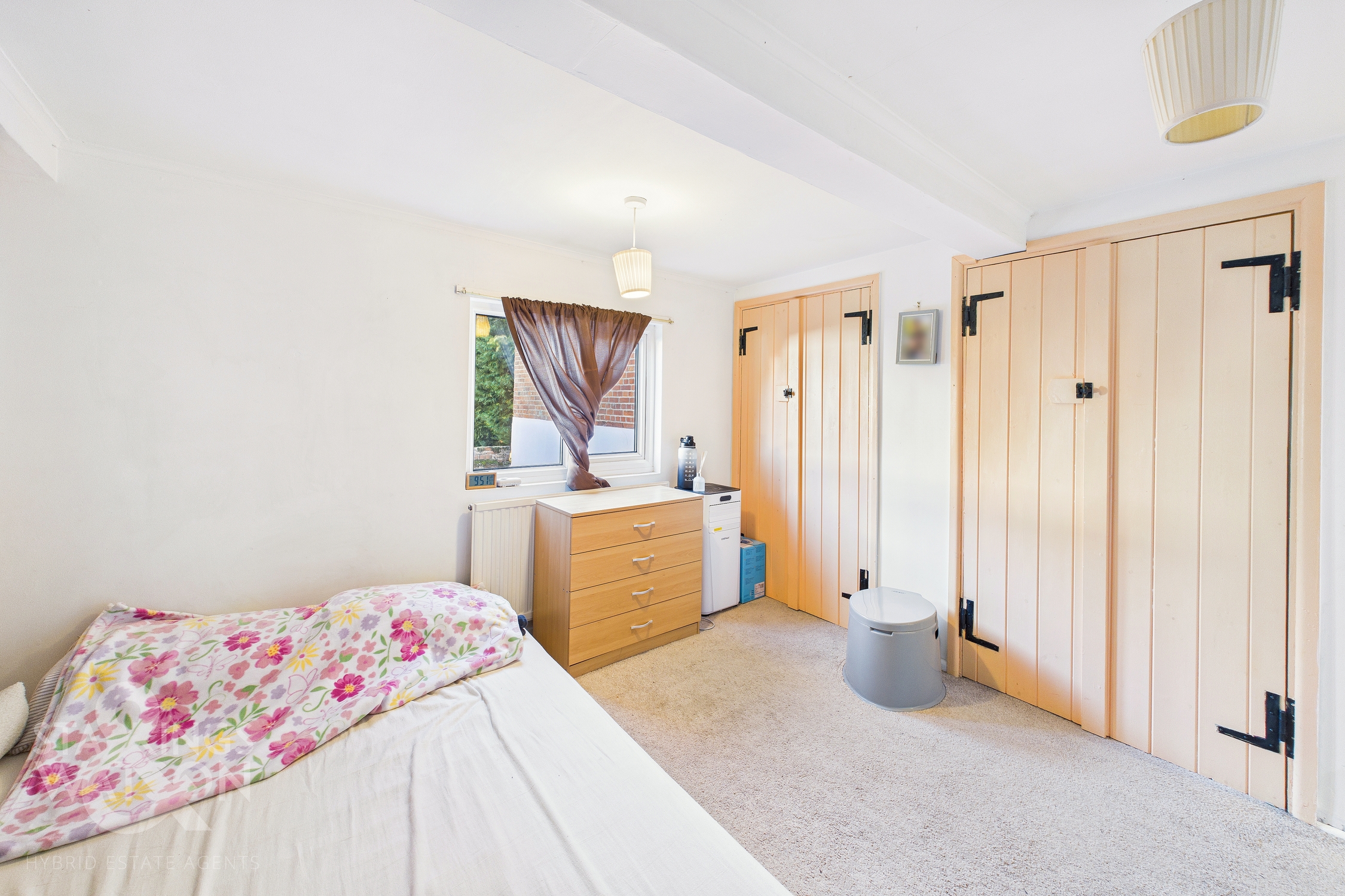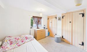Heading up to the first floor landing there are two ample bedrooms off the landing, one to the front and one to the rear. The bedroom to the rear offers two double wardrobes and a cupboard with the room to the front also benefitting from fitted wardrobes and exposed timbers.