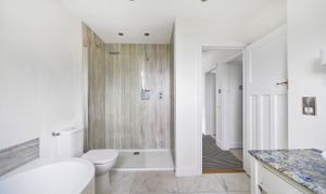 Ascending to the first floor, a landing provides access on to two very good sized double bedrooms, one with fitted wardrobes, a third larger-than-usual single bedroom and a stylish house bathroom with a separate shower enclosure.