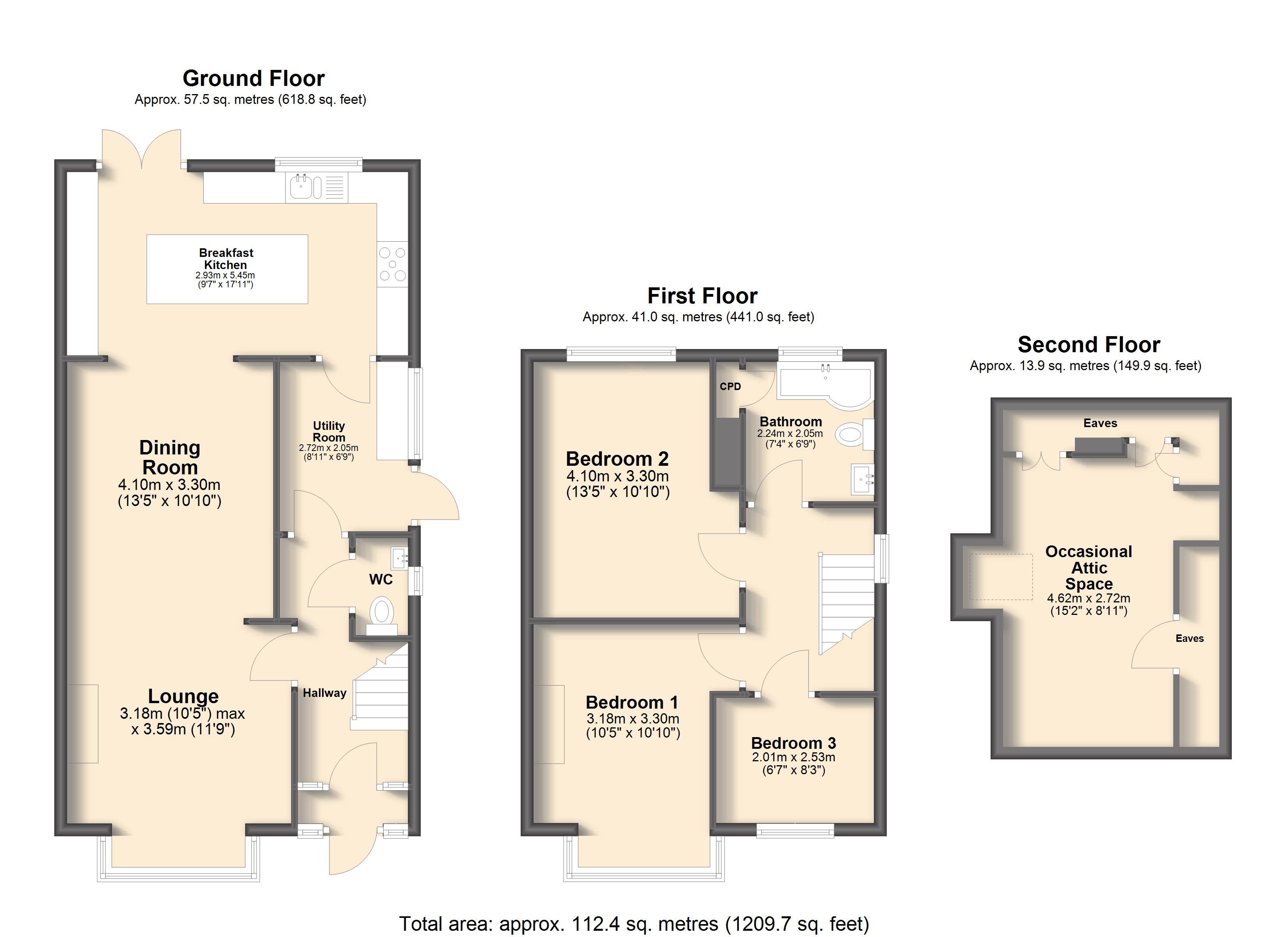 The ground floor provides ample living space with an open-plan lounge/dining room. A stunning breakfast kitchen with a lantern skylight window overlooks the garden and has been finished with quartz worktops and a range of integrated appliances. You also have an adjoining utility room and a hallway which features a W/C. Upstairs, the bedrooms offer plenty of space for fitted or stand-alone furniture, with two doubles and a single offering flexibility. A three-piece bathroom completes the layout. Furthermore, a great occasional attic space accessed via the landing could be fully converted, subject to consent.
