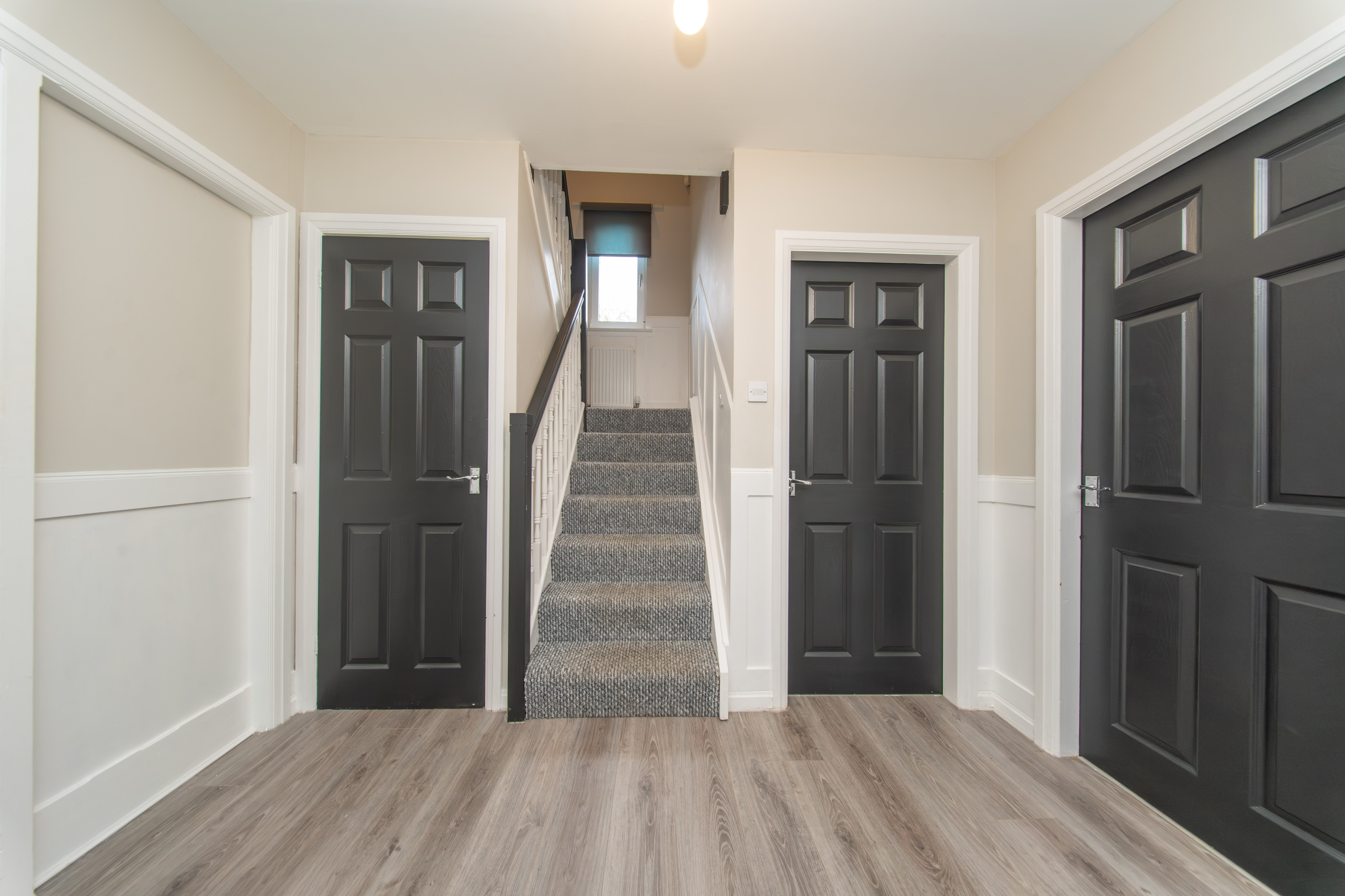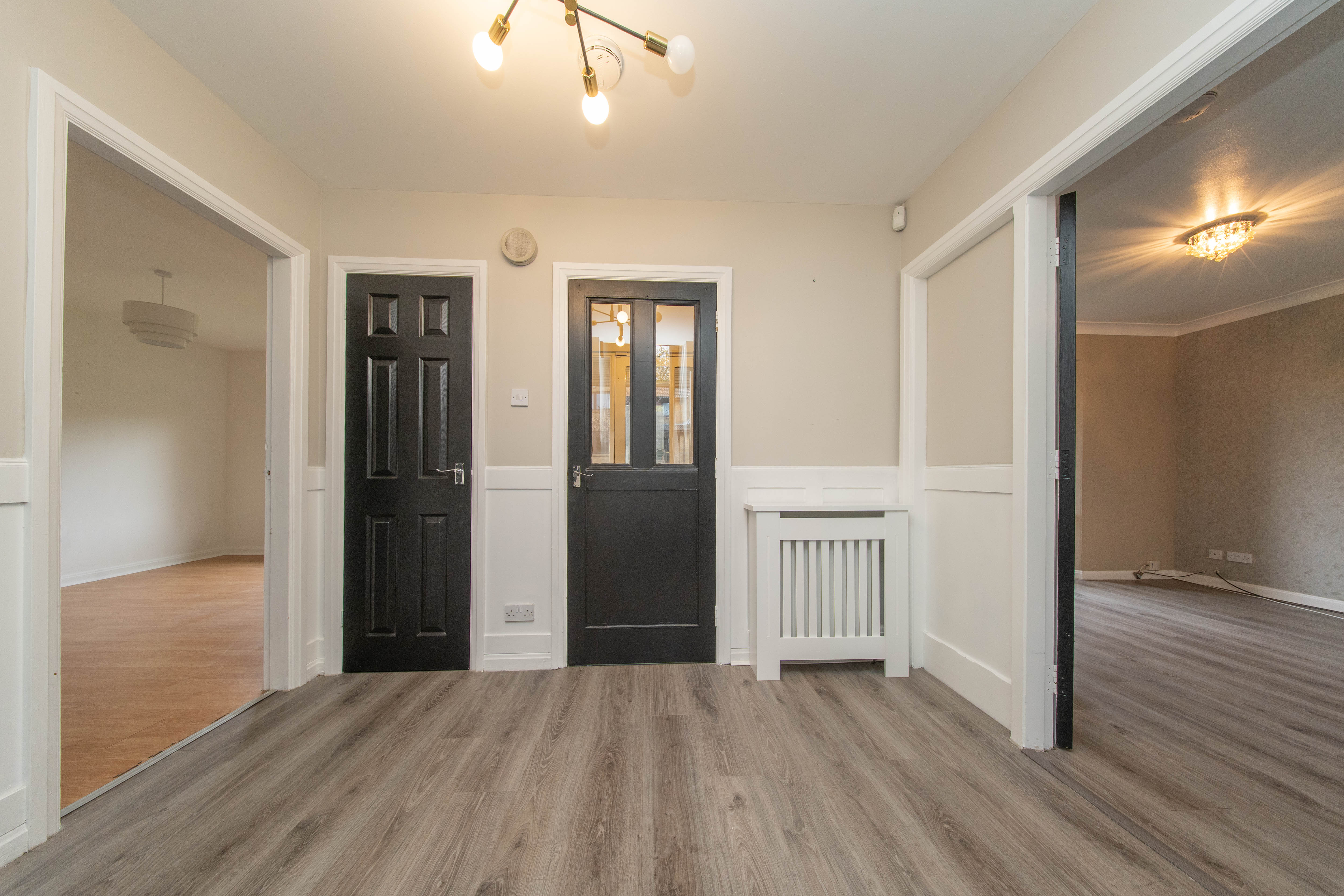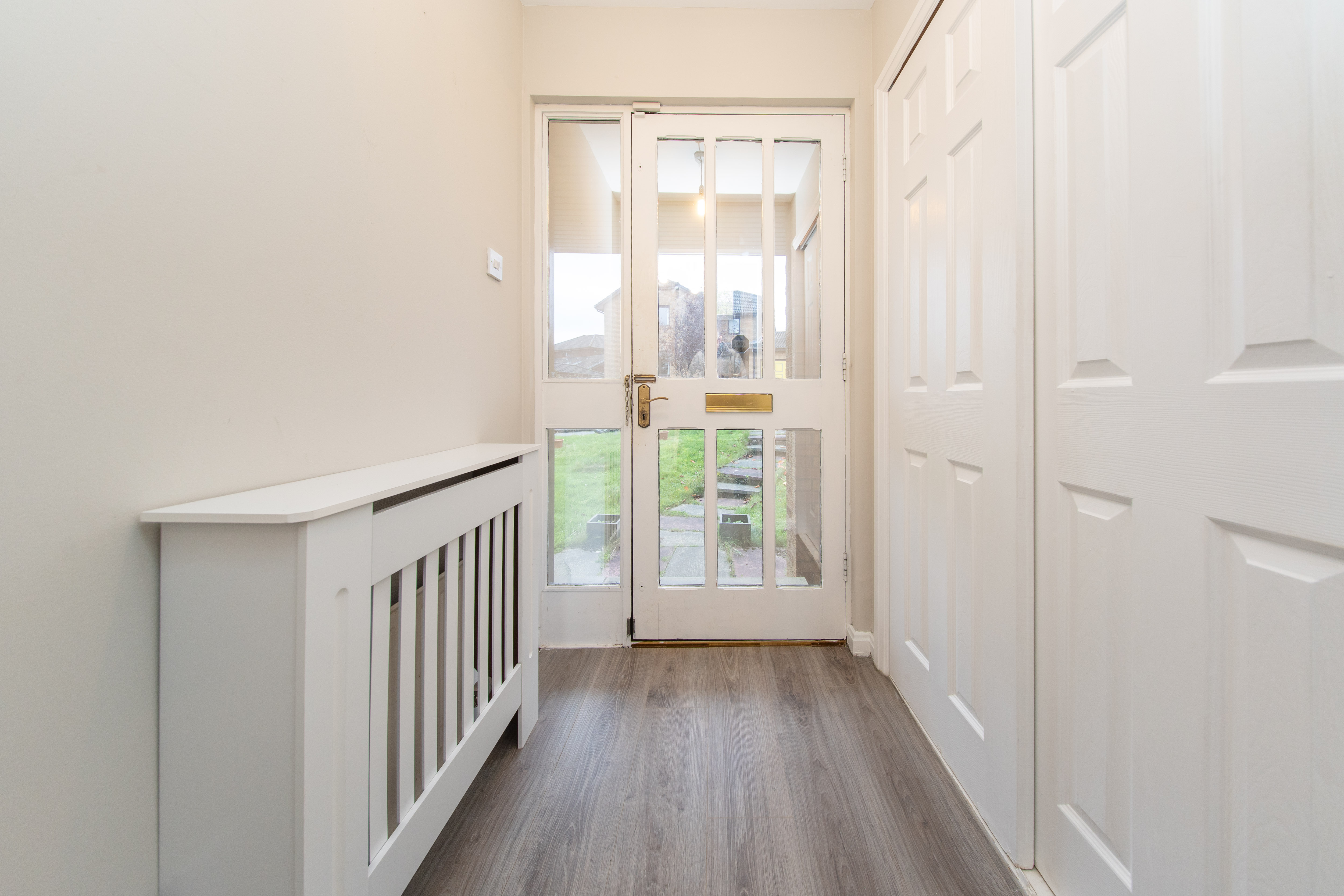 Welcoming you into this family home is a wooden front door with glazed panels, allowing natural light into this area. The neutral décor begins with grey laminate flooring and white painted walls. A useful cloakroom cupboard is housed behind the two sliding doors providing storage. A half-glazed door allows access to the hallway and provides the transition of natural light. A radiator, with cover and a ceiling light finish this area.