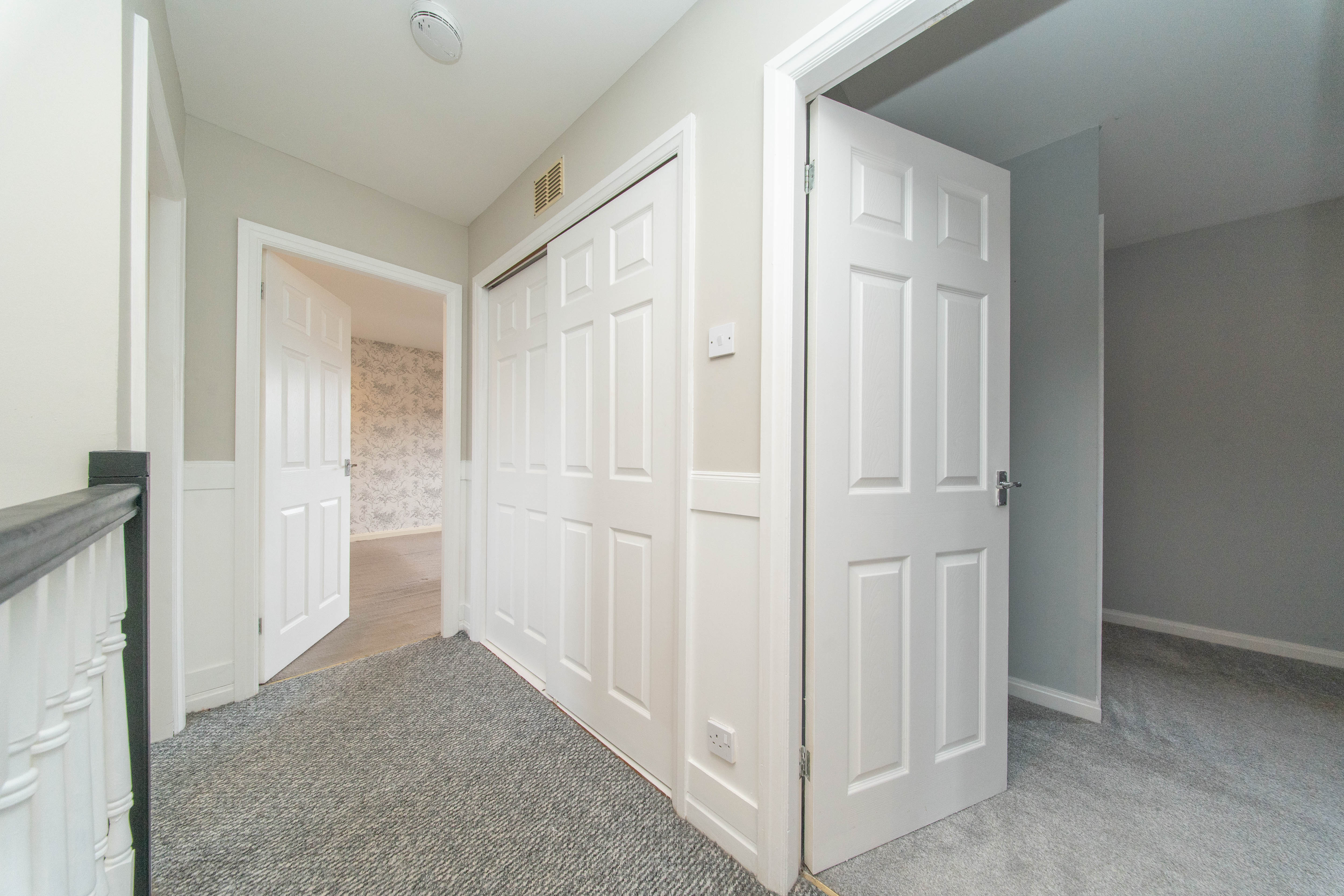 The modern décor continues with the half wood panelling and neutrally painted walls flowing up the stairs. The carpeted flooring provides a soft feel underfoot. A window allows in natural light and is enhanced by the recessed ceiling downlights. Further storage is provided by a double fronted built-in cupboard. A radiator, a smoke detector, an attic hatch and a power point are included.