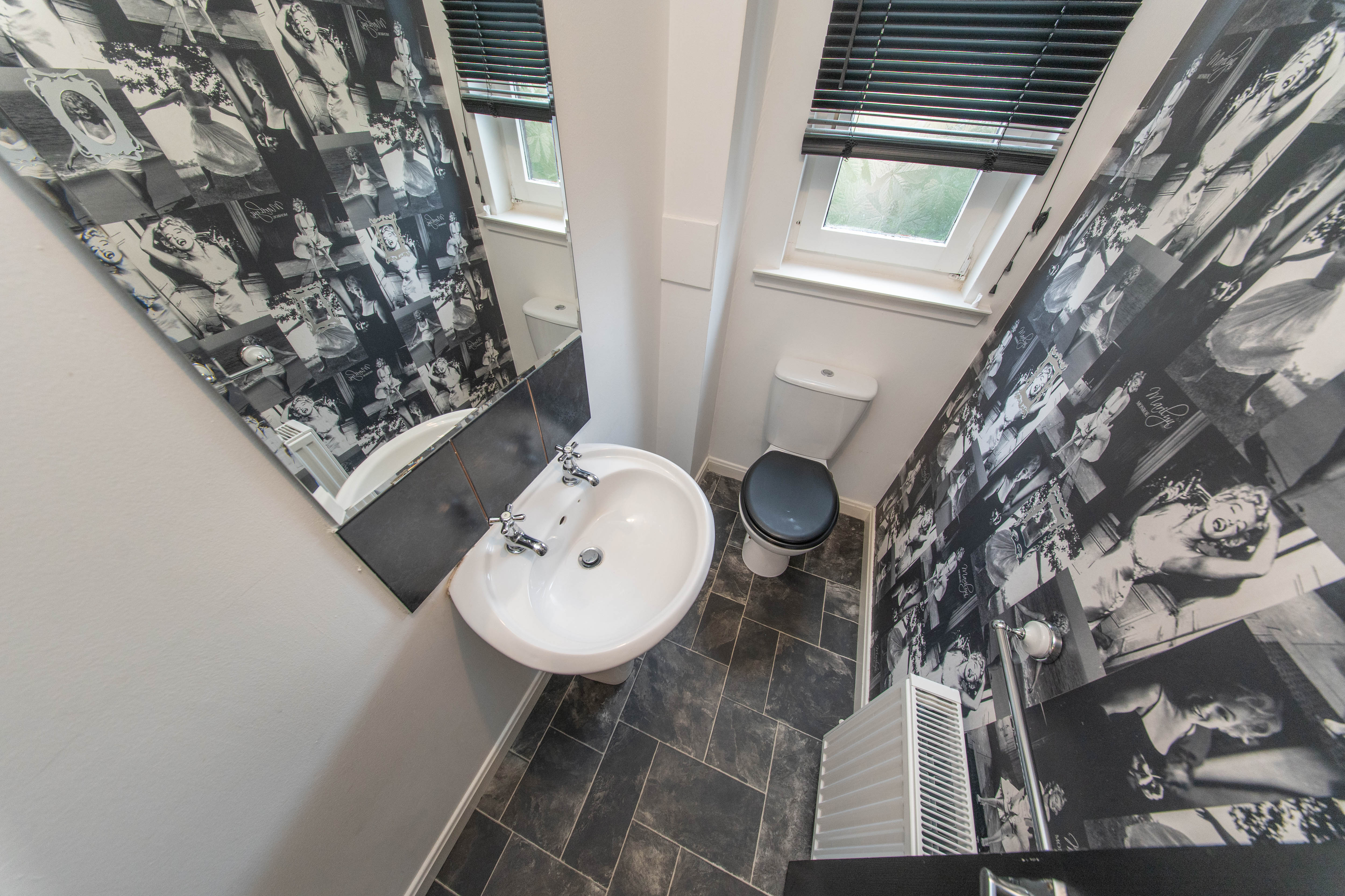 2.11m x 1.02m (06’11” x 03’04”) An essential room for modern day living. The feature wall provides some modern décor and is complemented by the white painted walls, tiled splashback and tile effect vinyl flooring. A white suite comprises of a pedestal sink and a close coupled toilet. A window, a ceiling light and a radiator complete the room.