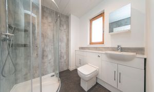 1.99m x 1.77m (06’06” x 05’10”) This modern room features some wet wall panelling, neutral tones to the walls and vinyl tiles to the floor. A white back to wall toilet, a white vanity sink, set within a storage unit, and a wall mounted shower, with rainforest shower head plus additional handheld shower, set within a cubicle, make up the suite for this shower room. A window, recessed ceiling downlights, an extractor and a chrome ladder radiator are also included.