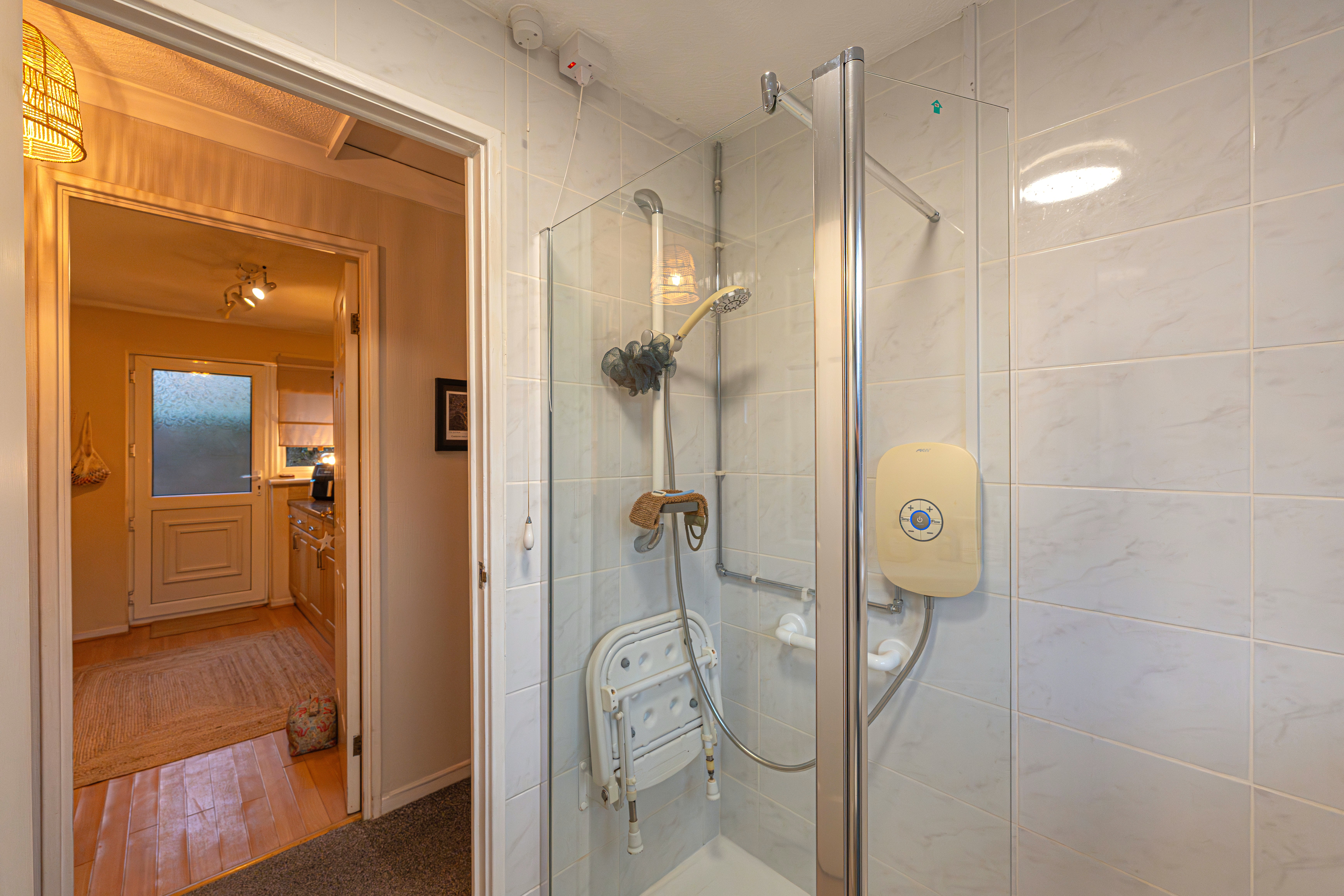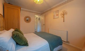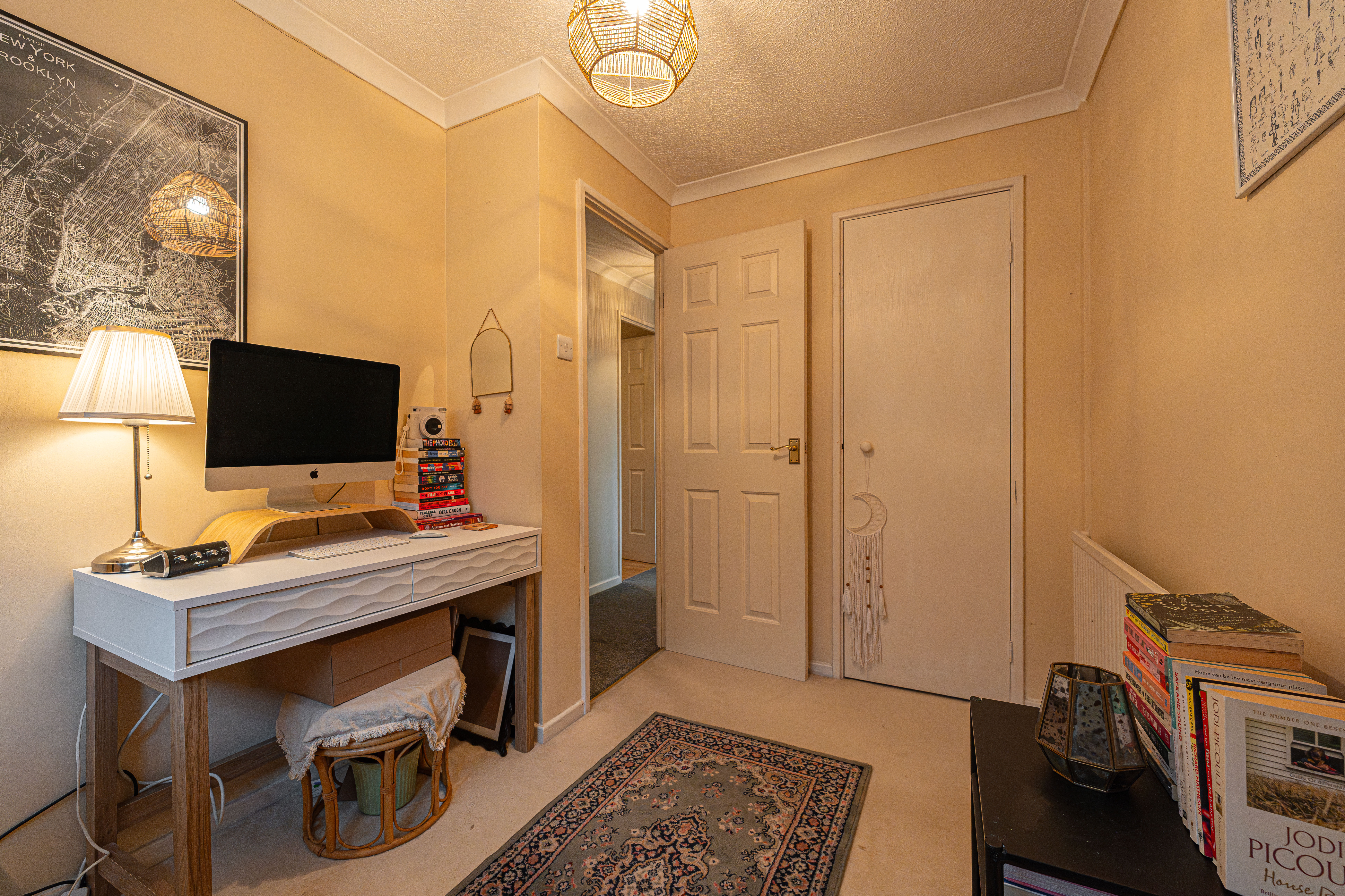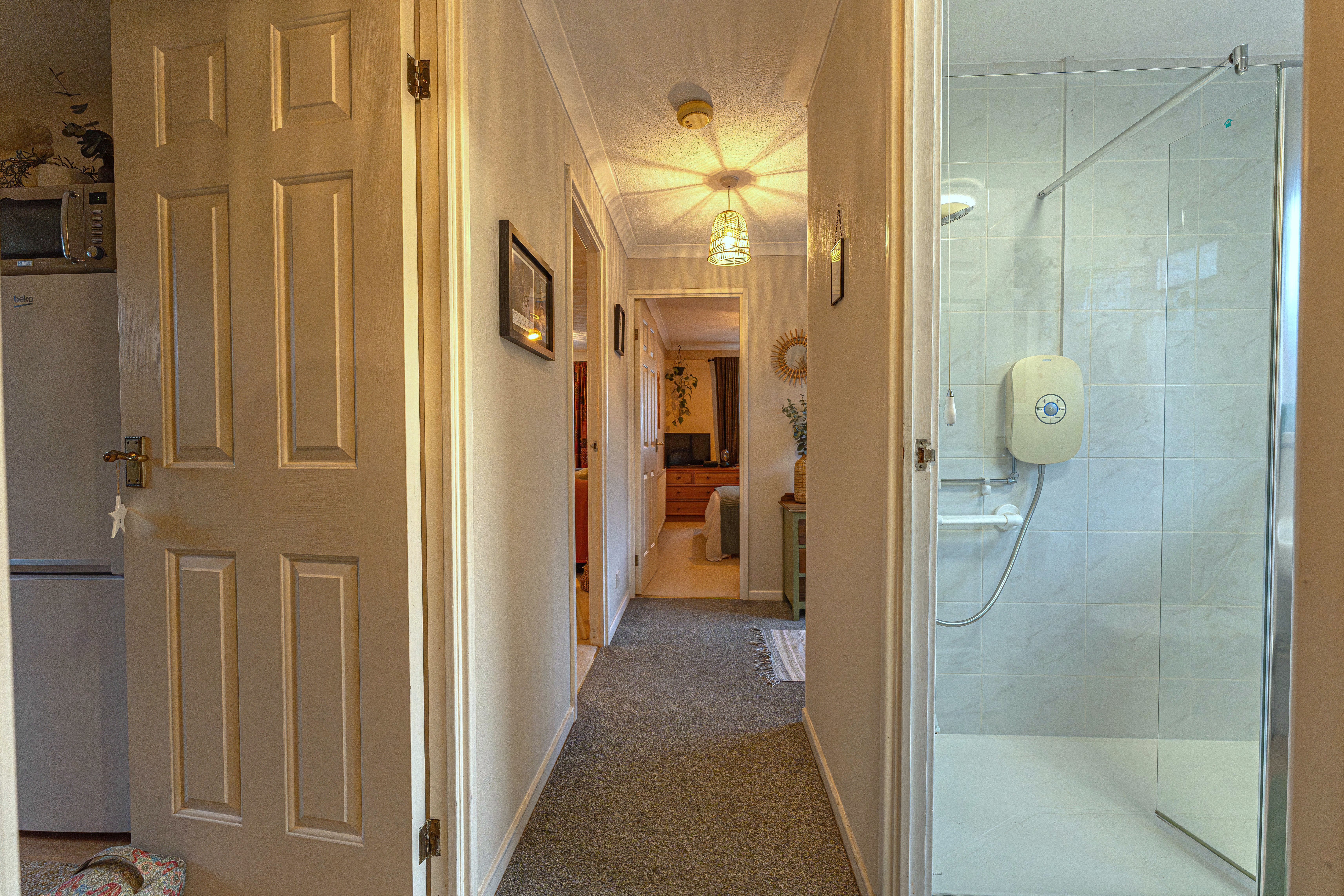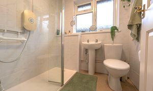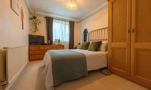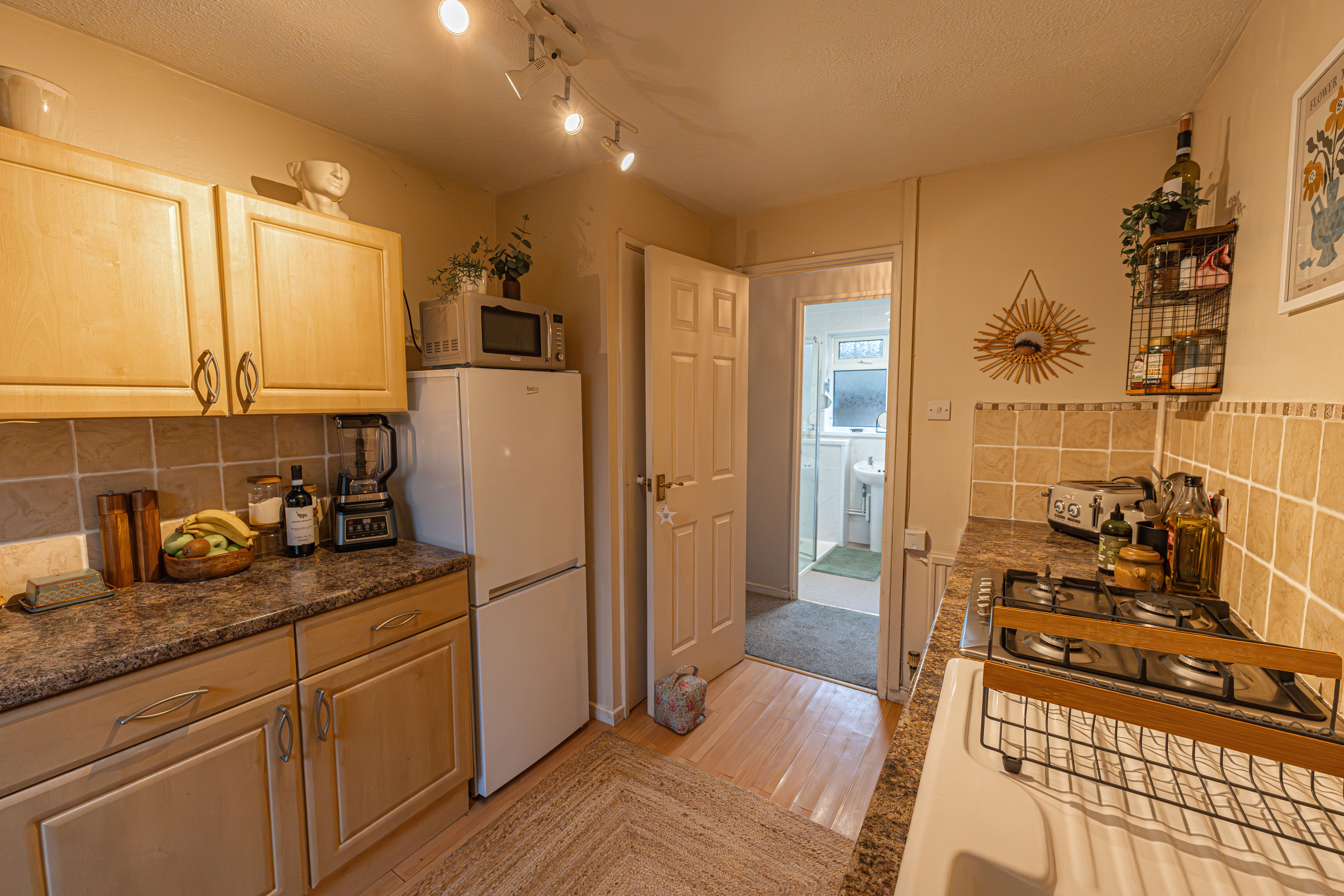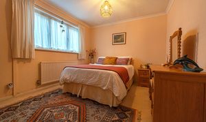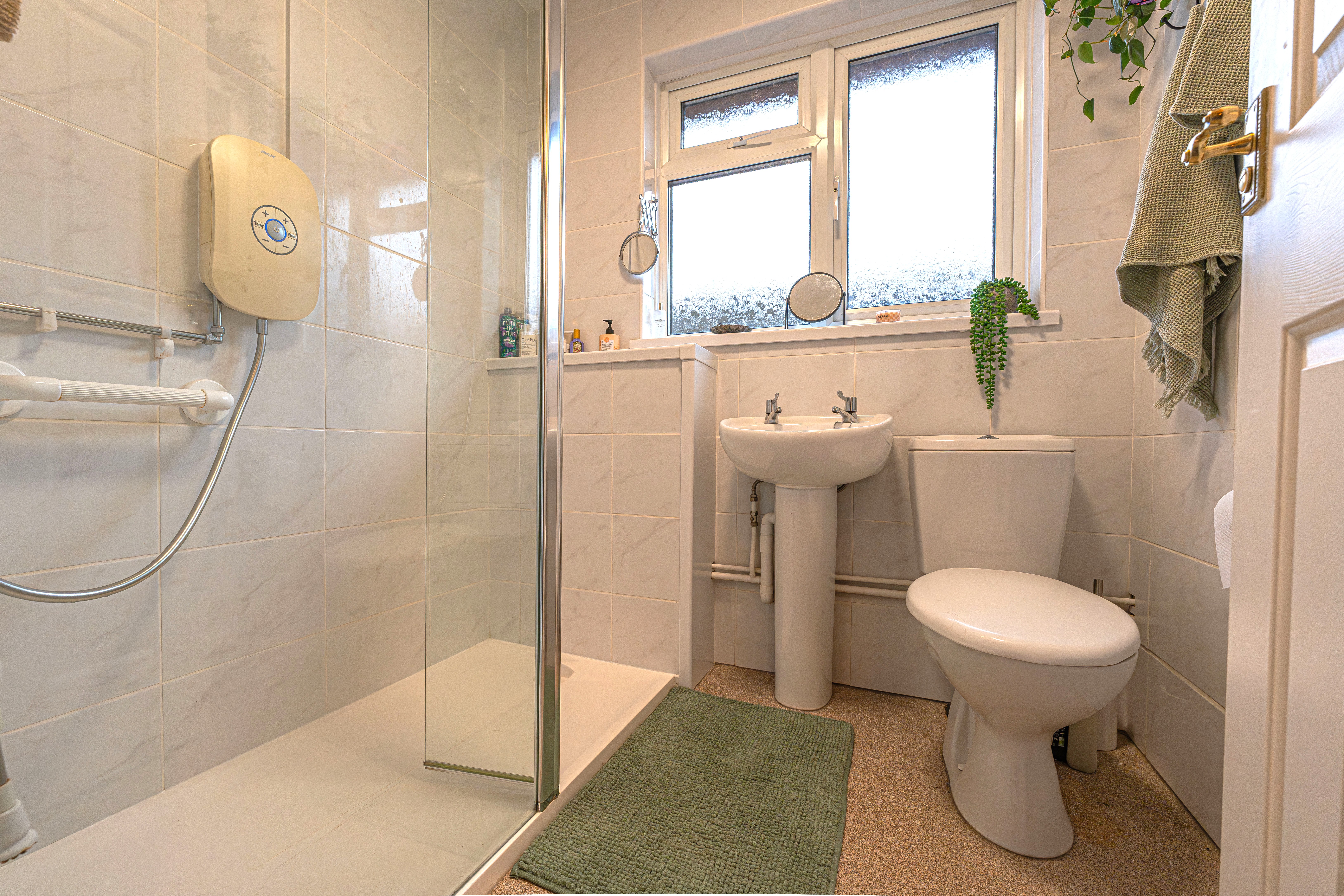 Across the bungalow we have three bedrooms - two of which are well proportioned doubles while the third is a comfortable single, which is reinforced with a fitted wardrobe and staged as a versatile space that is ideal for practical uses like a home office or dressing room. Another fitted cupboard can be found from the hallway.