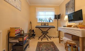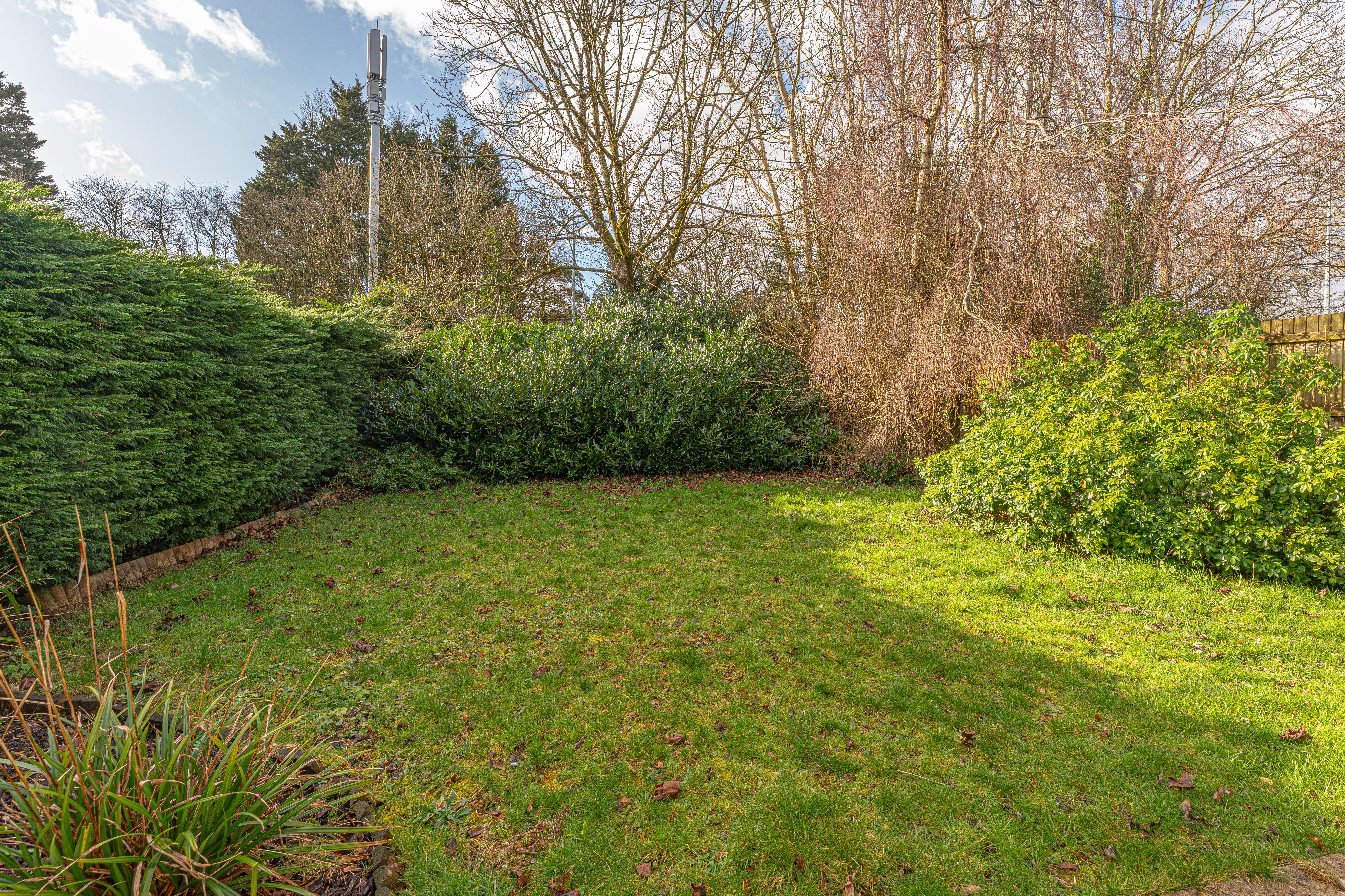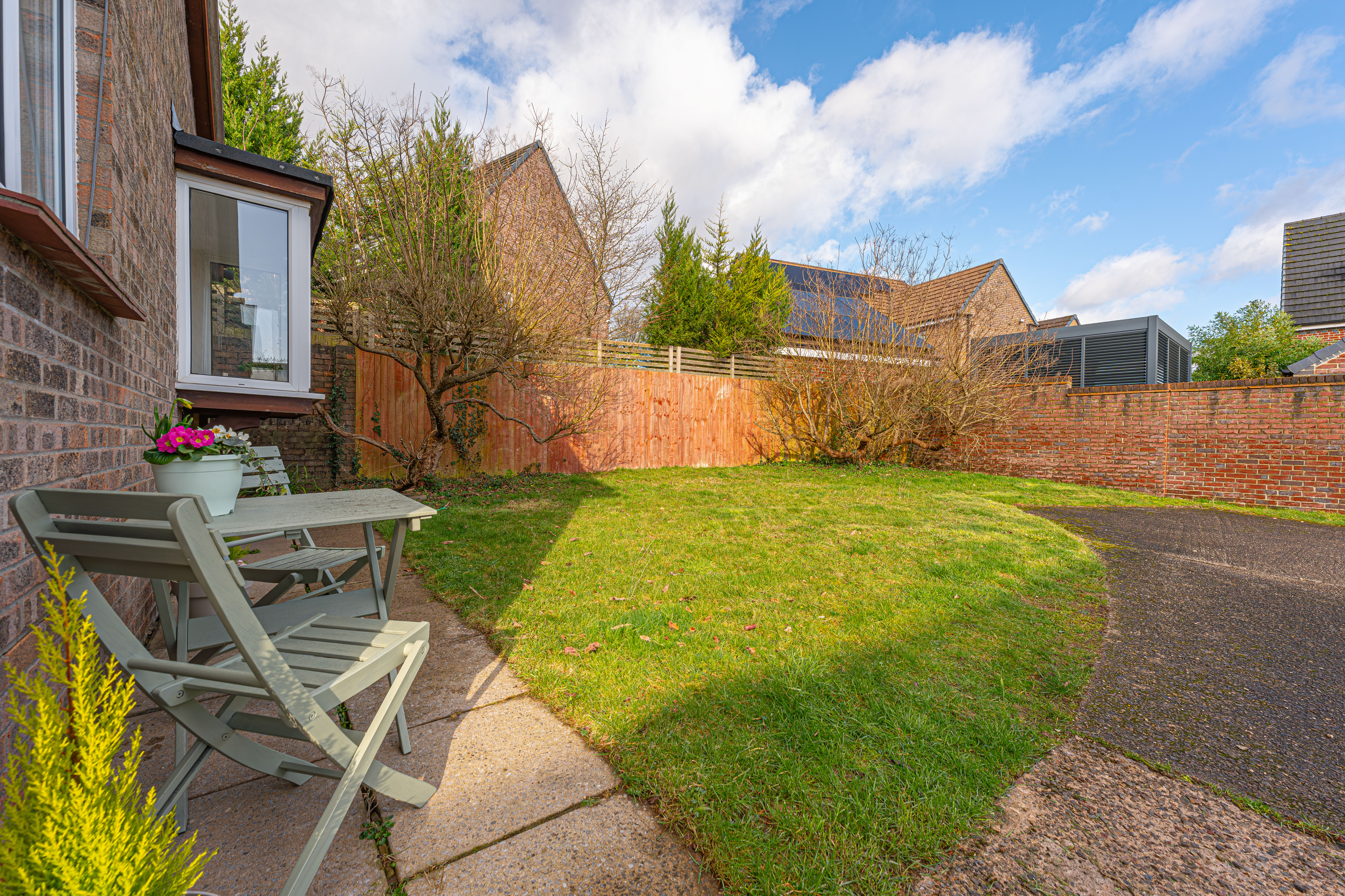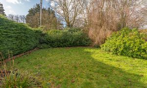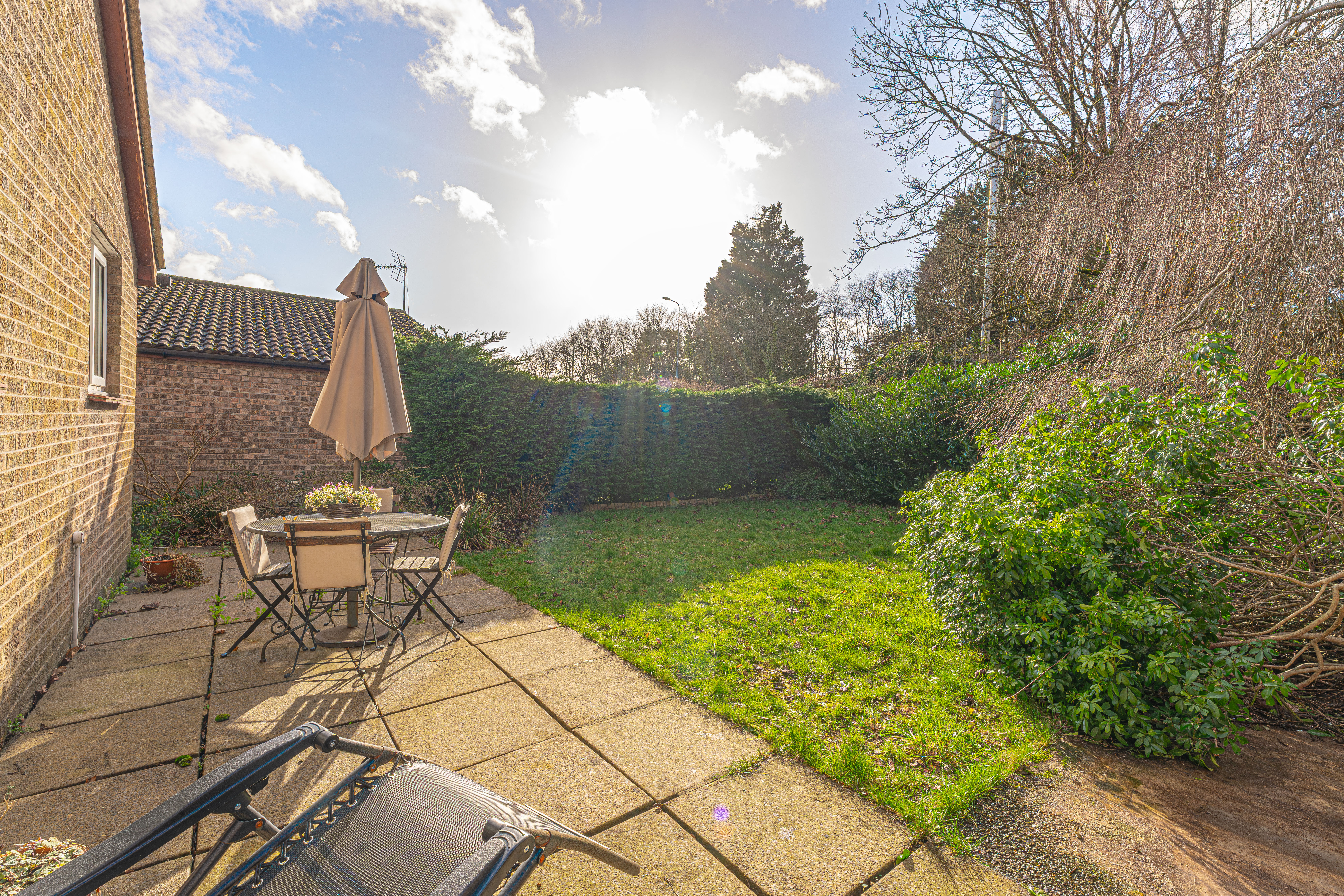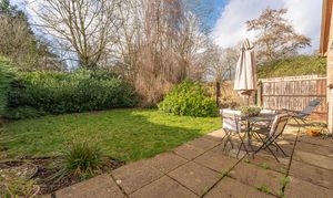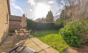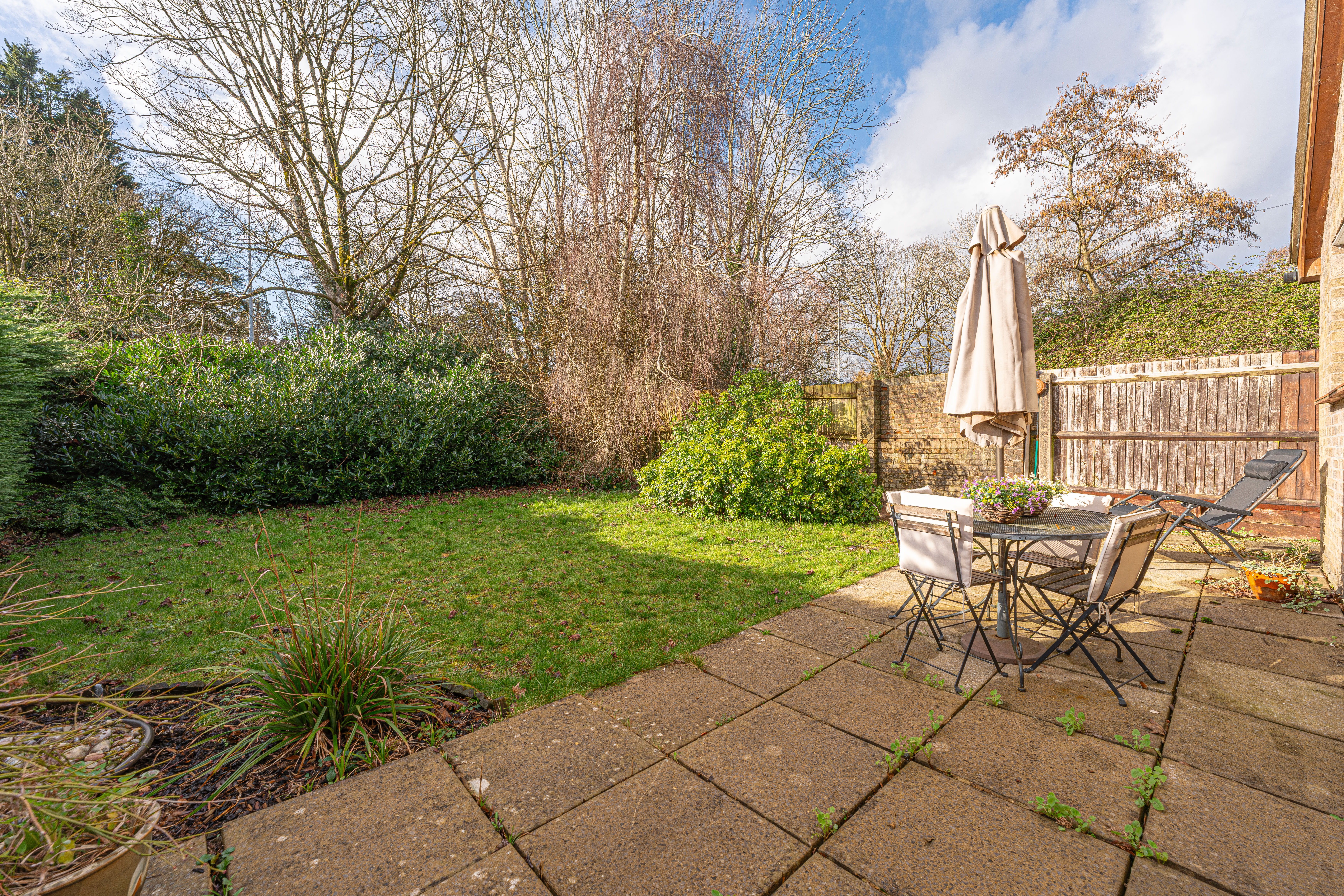 Stepping outside we have the incredible rear garden, which features a generous corner plot with a large lawn and a patio area for lounge seating and al-fresco dining. The garden also benefits from a range of mature shrubs and tall trees that naturally encloses the garden. The trees and greenery provide a touch of shade in the summer months, while the garden enjoys a great amount of sunlight, particularly in the afternoon and evenings. A gateway also opens the garden to the driveway at the side of the house, with space to park two vehicles easily.