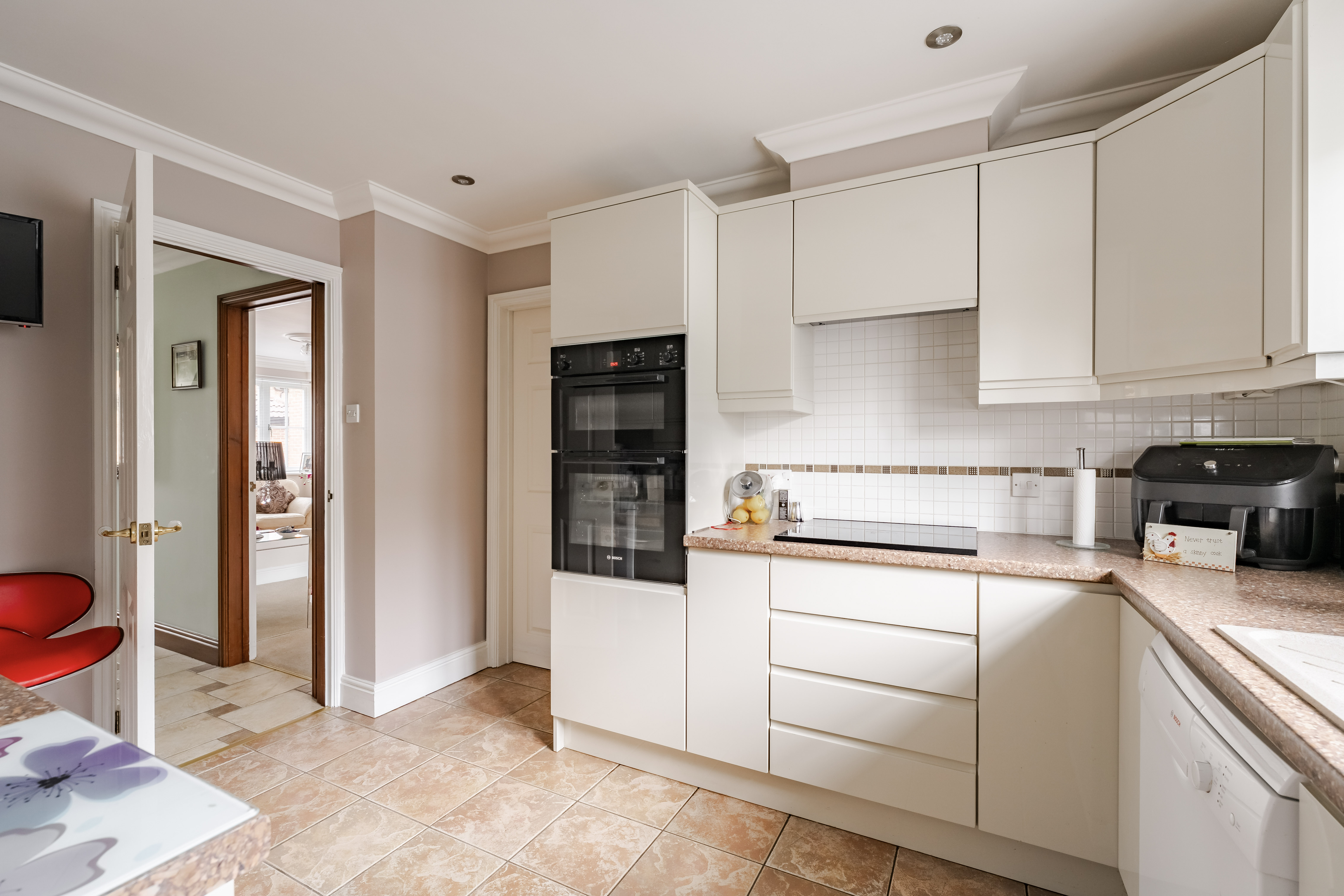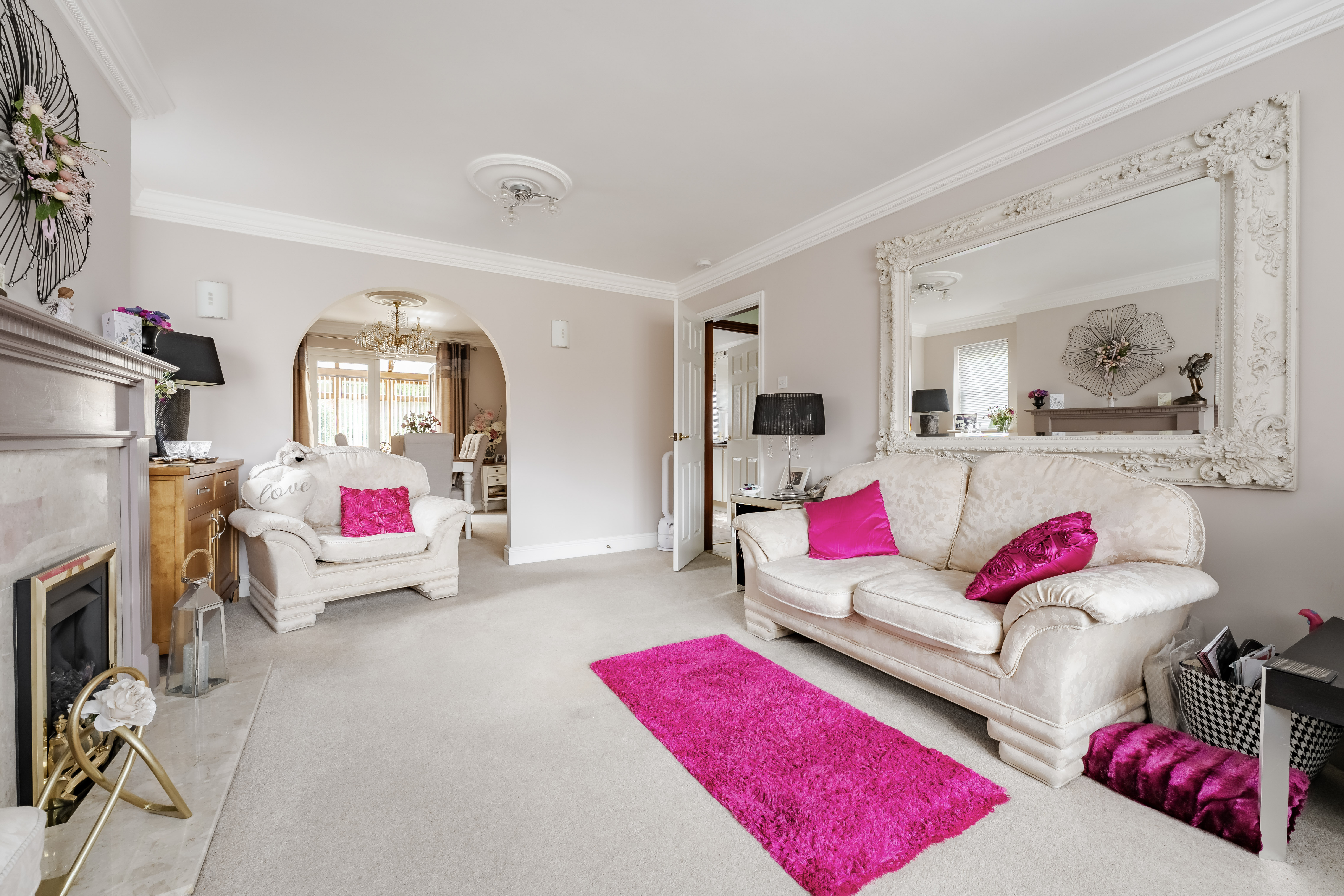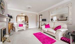 Stepping inside, a welcoming entrance hall provides access to all areas of the home, creating a natural flow throughout. The sitting room is a bright and generously sized space, enhanced by a bay fronted window and a central gas fireplace which forms an attractive focal point. Double doors lead through to the dining room, offering a dedicated space for entertaining or everyday use, which in turn opens into the conservatory. This additional reception area enjoys wide views over the garden and allows plenty of natural light to fill the space, with direct access outside.