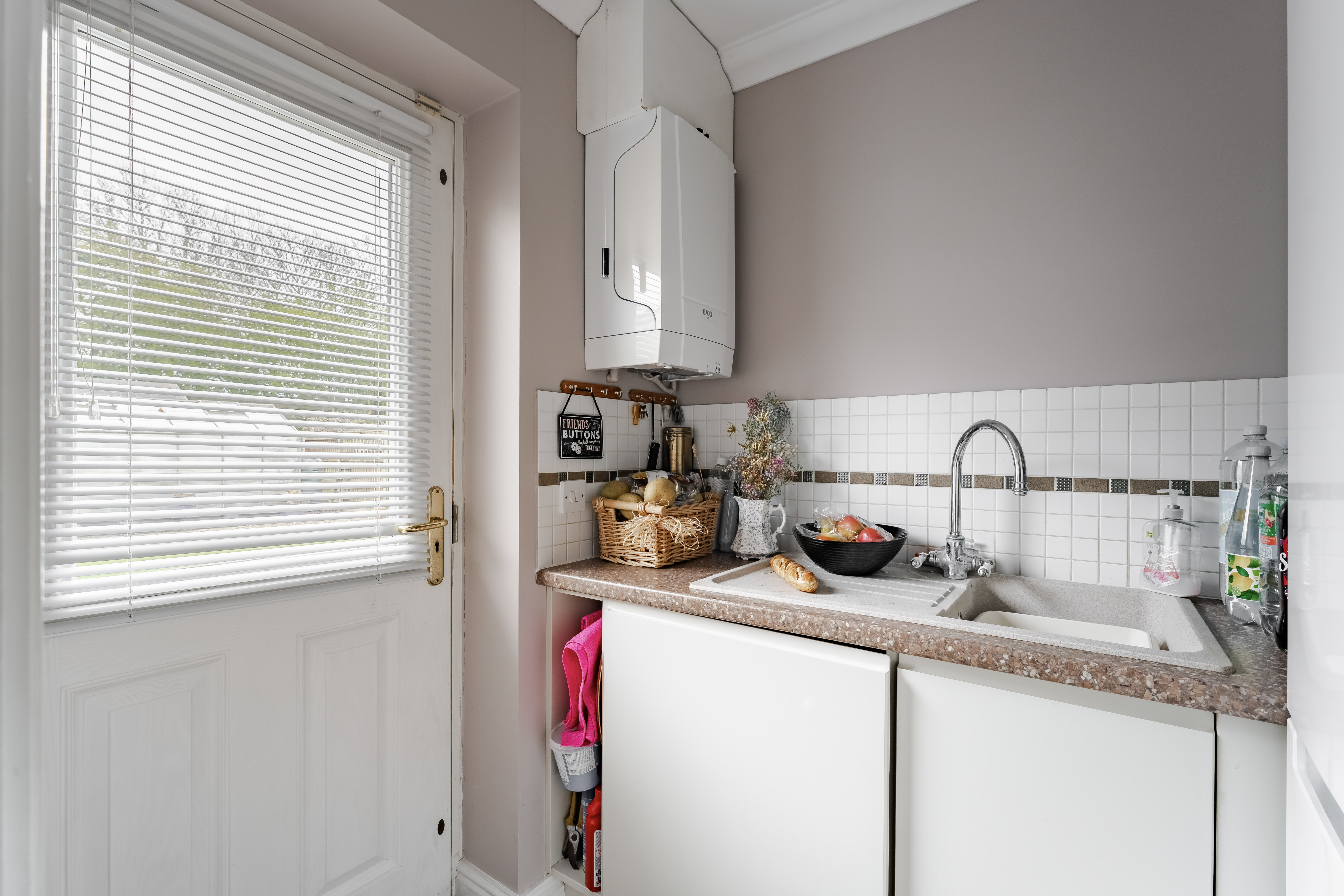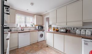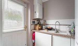 The kitchen is fitted with a range of units and includes a gas hob, providing a practical and functional space for cooking. An adjoining utility room offers further storage and space for appliances, along with a door leading out to the rear garden.