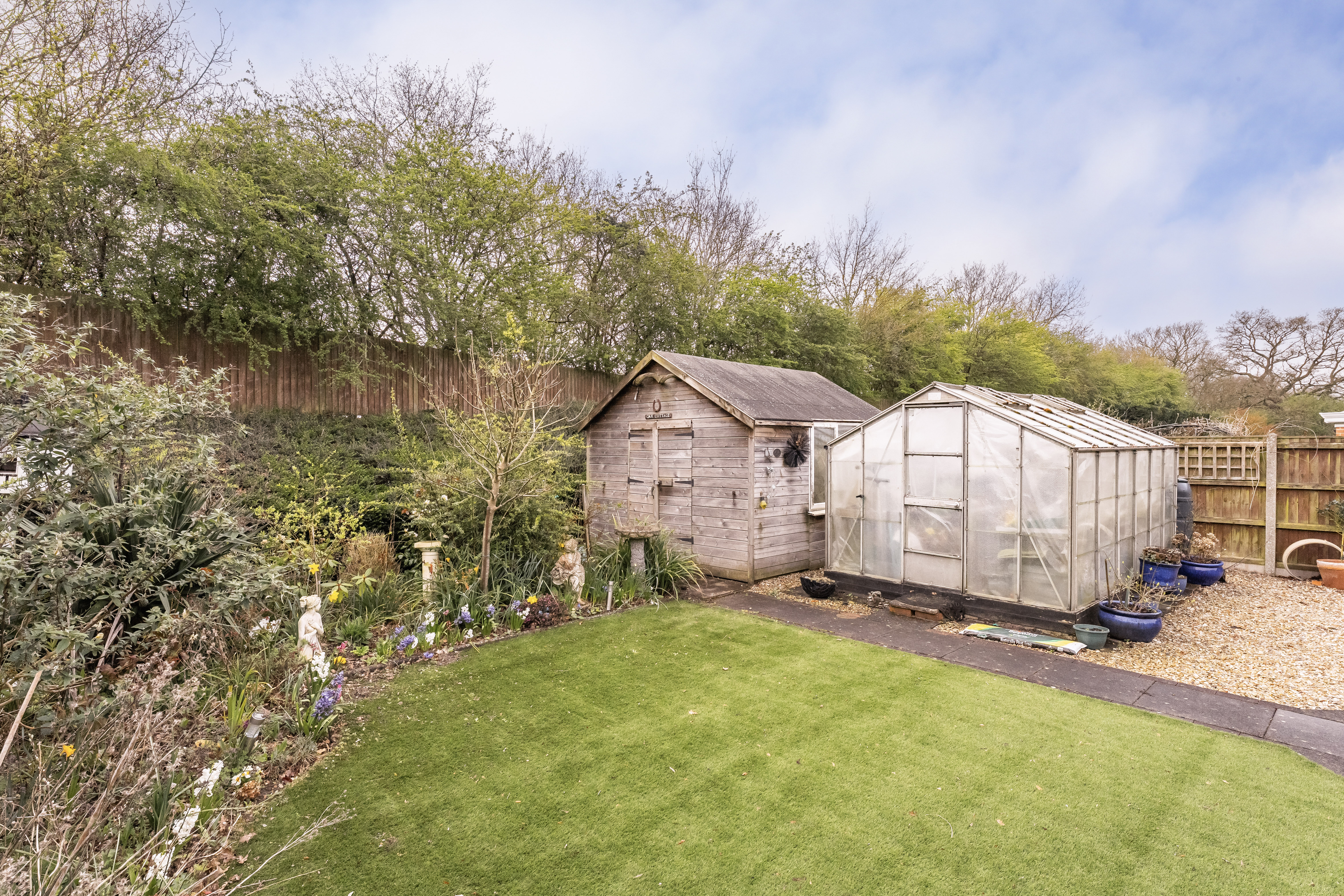 Externally, the rear garden is fully enclosed and designed for low maintenance, featuring astroturf along with a patio seating area suitable for outdoor dining and relaxing. To the front, the property is approached via a gated driveway providing ample off road parking, complemented by established planting. A double garage offers additional storage and practicality.