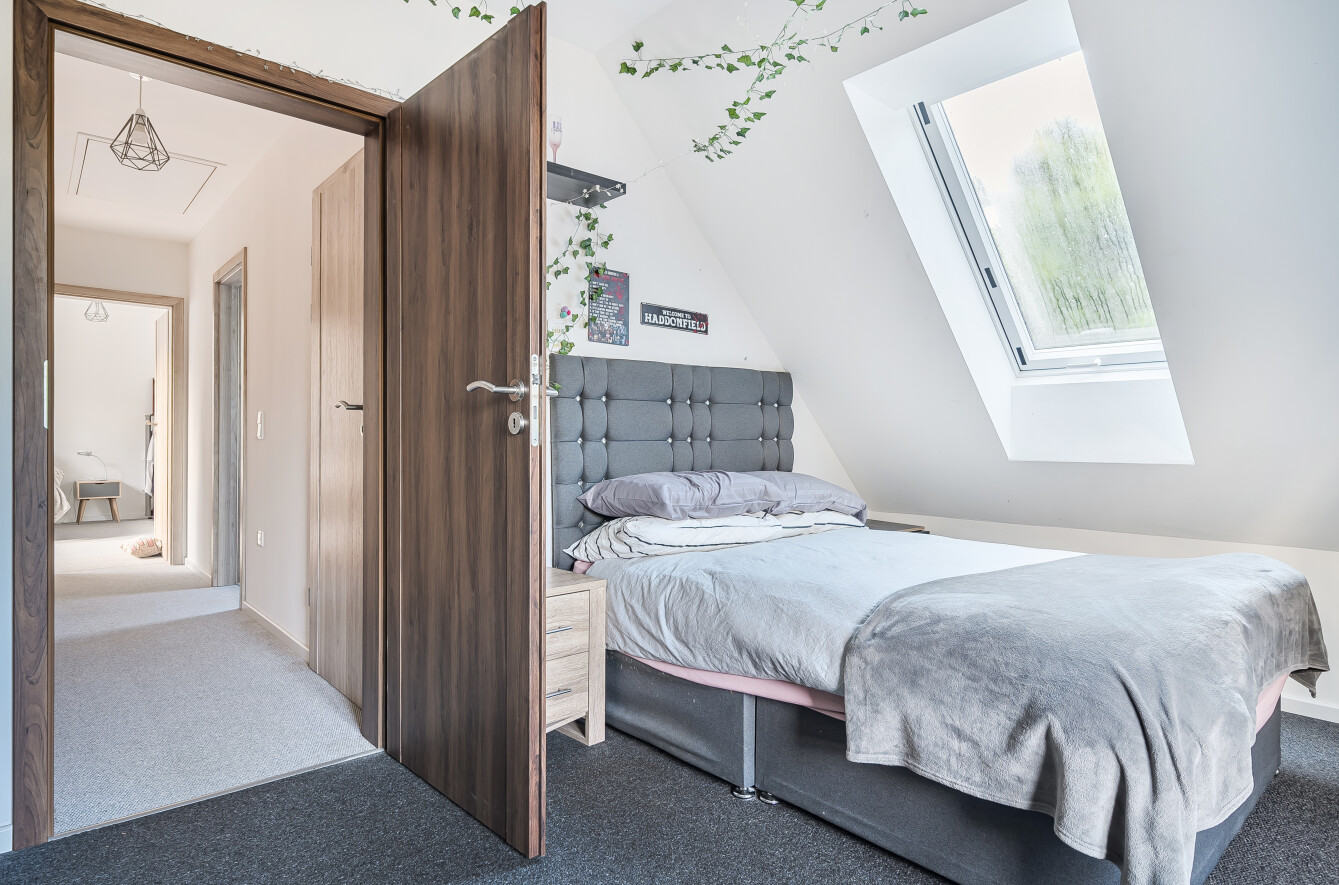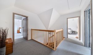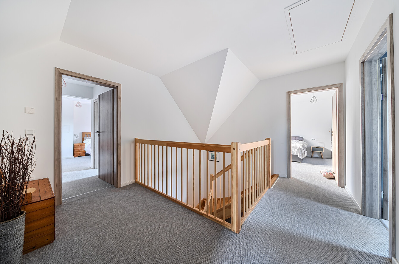The central, wooden staircase leads to the first-floor landing, with store cupboard, which provides access to two double bedrooms, family bathroom, and bedroom suite. The bedroom suite offers a double bedroom with dressing area and an en-suite shower room.