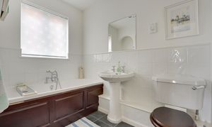 Going into the family bathroom, this is fitted with a three-piece suite comprising a wash hand basin with chrome hot/cold taps, low-level flush WC and a bath with a chrome mixer tap. Complementary features include vinyl flooring, partly-tiled walls, a radiator, a wall-mounted mirrored cabinet, an extractor, spotlights and an obscured double-glazed window facing the side aspect.