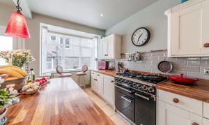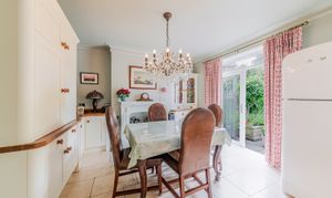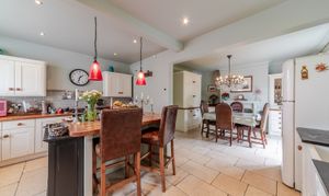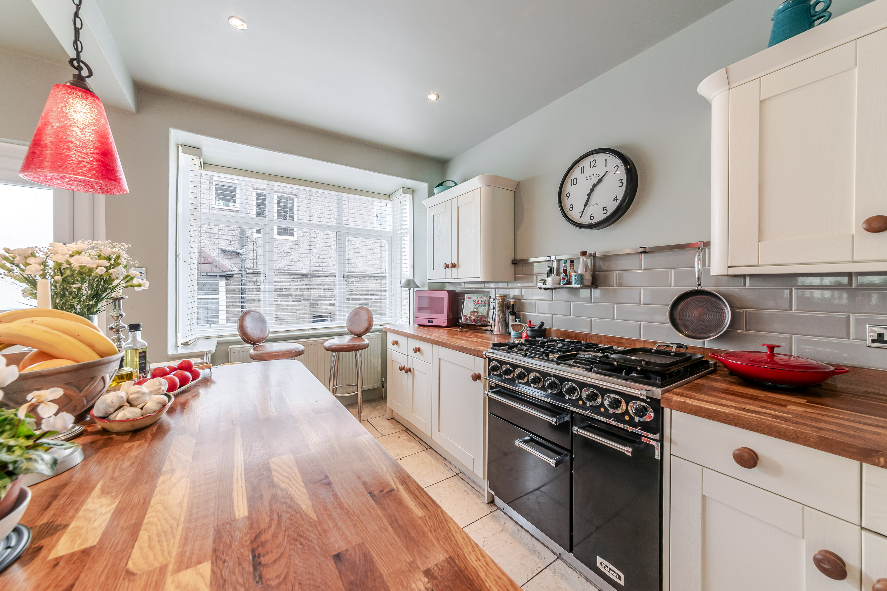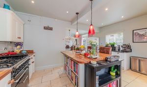 The kitchen area has a further range of base and wall cupboards, drawers, contrasting overlying Oak worktops, matching splashbacks with further tiling above.There is a central heating radiator, tiled floor, Belfast sink with granite surround and base cupboards, there is space for a range style cooker, under counter space for washing machine, cupboard housing an Ideal Logic gas fired central heating boiler and an island unit with book shelving and complimented by an overlying Oak worktop which extends to for a breakfast bar.