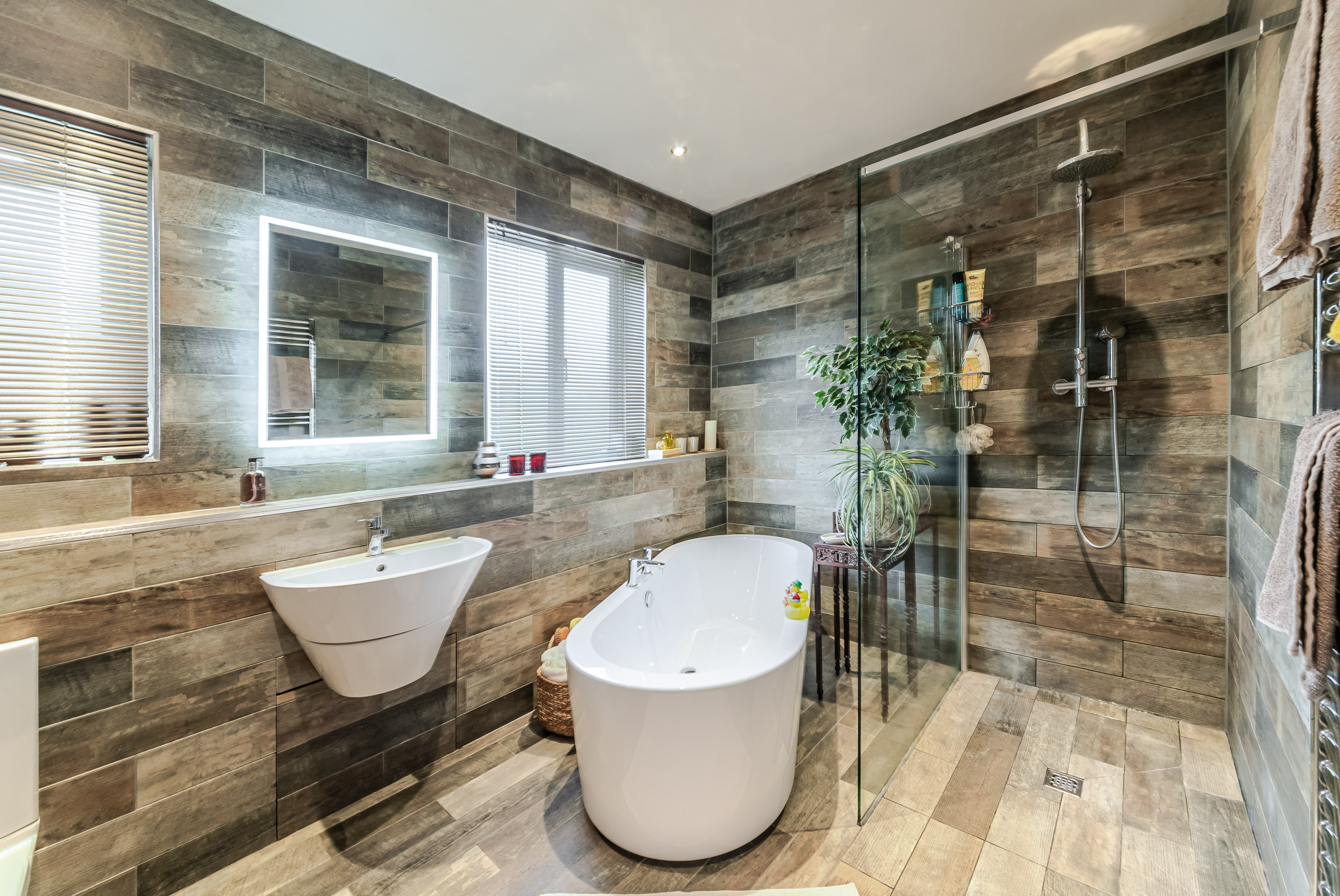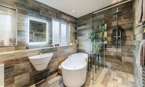 Once again as the dimensions indicate this is a generously proportioned room which has two frosted pVCU double glazed windows, inset LED downlighters, floor to ceiling tiled walls, tiled floor, large chrome ladder style heated towel rail and fitted with a suite comprising wall hung hand wash basin with chrome monobloc tap, free standing bath with chrome mixer tap, low flush w.c. and wet area with glazed side panel and having chrome shower fitting incorporating fixed shower rose and separate hand spray.