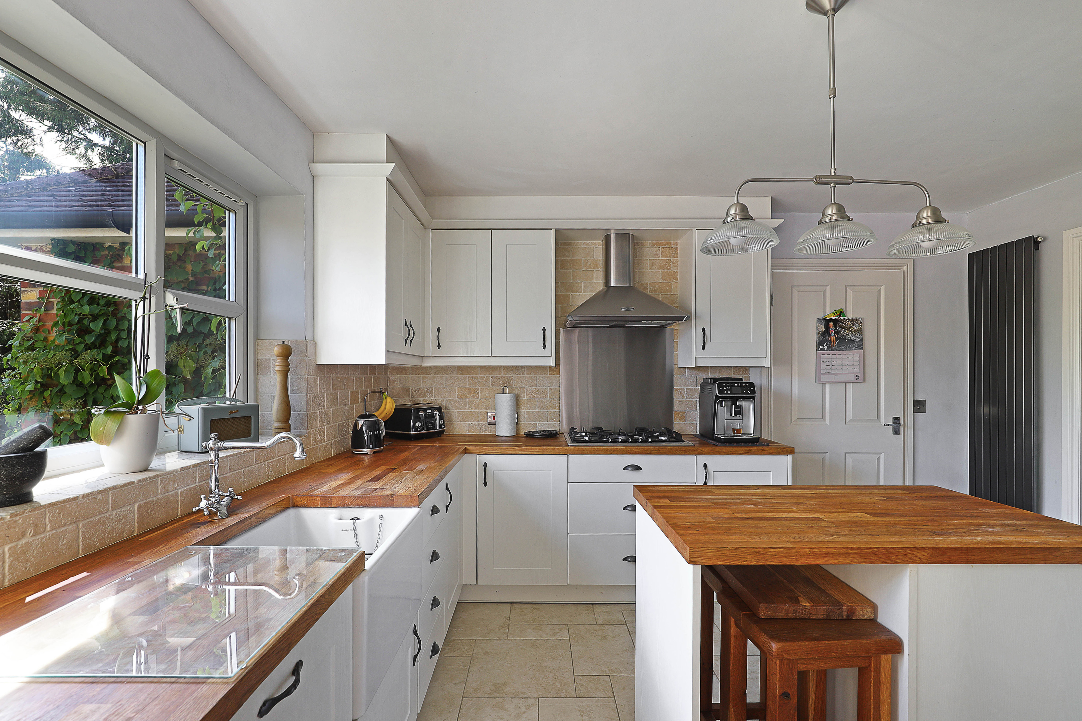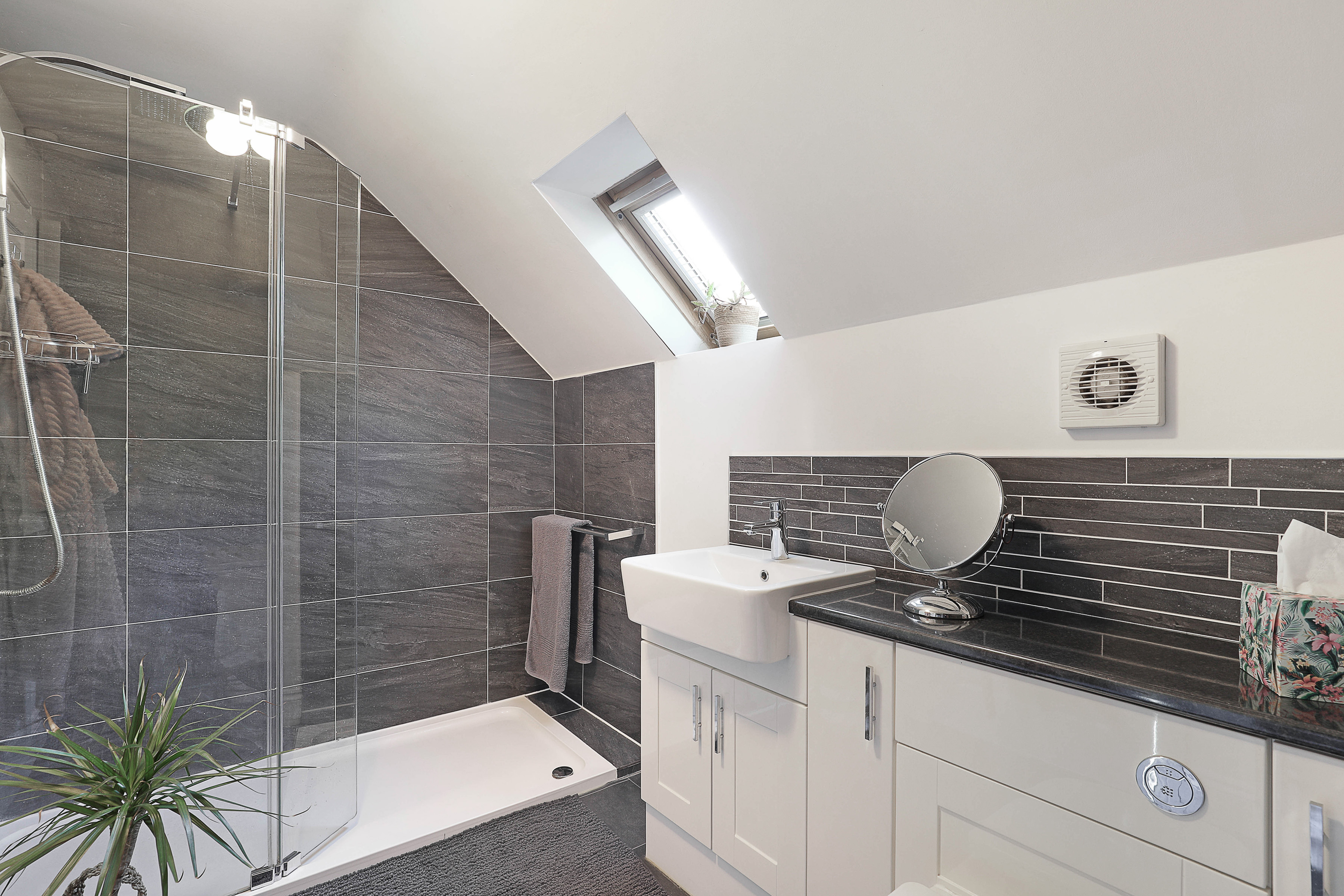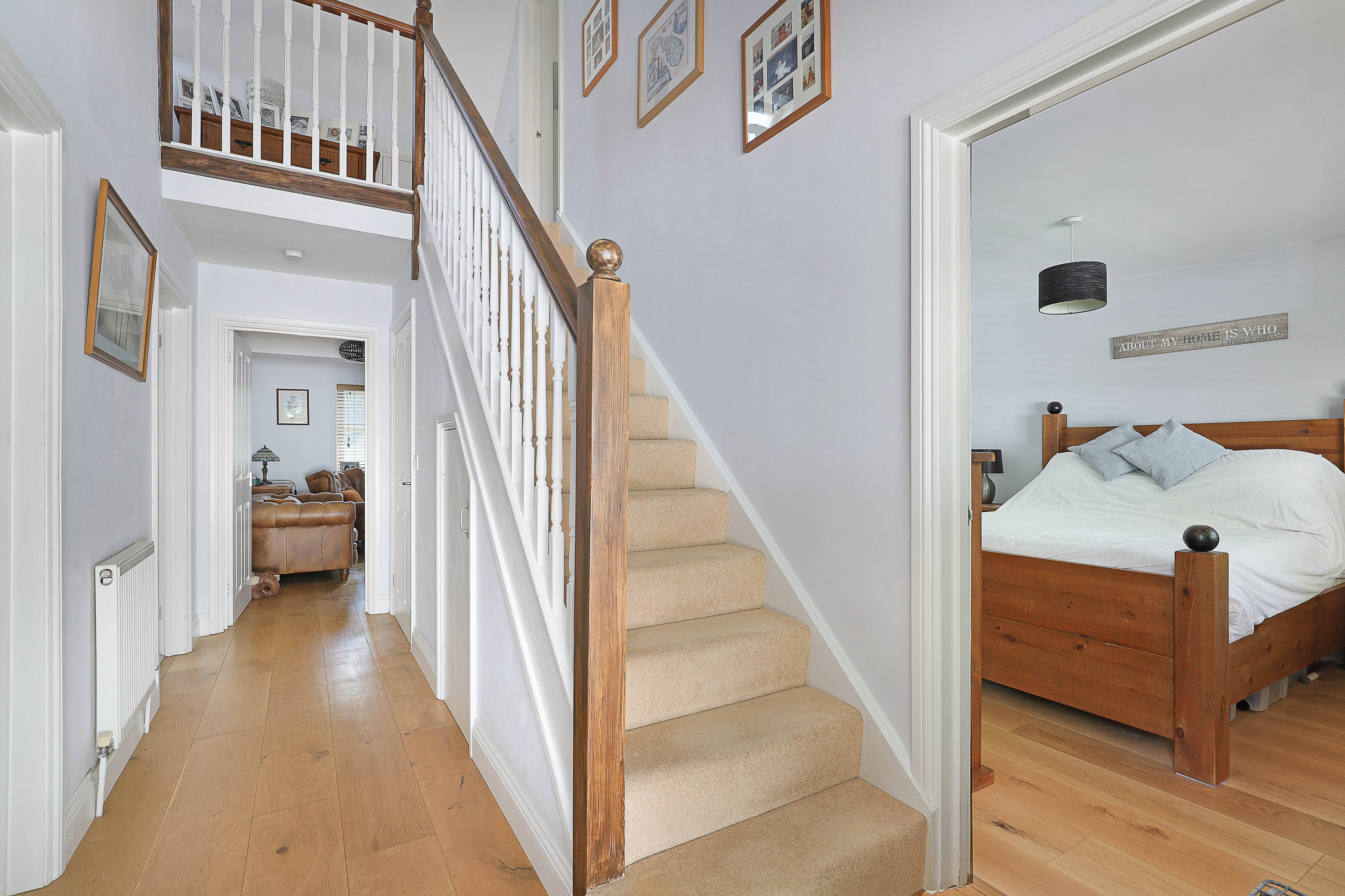 Upstairs sit two additional double bedrooms, both awash with light from their vaulted skylights above. Full of space and classic style, the family bathroom is a haven to relax within, comprising both a bath and walk-in shower. The upstairs also offers heaps of storage with a spacious landing and handy eaves space to fill.
