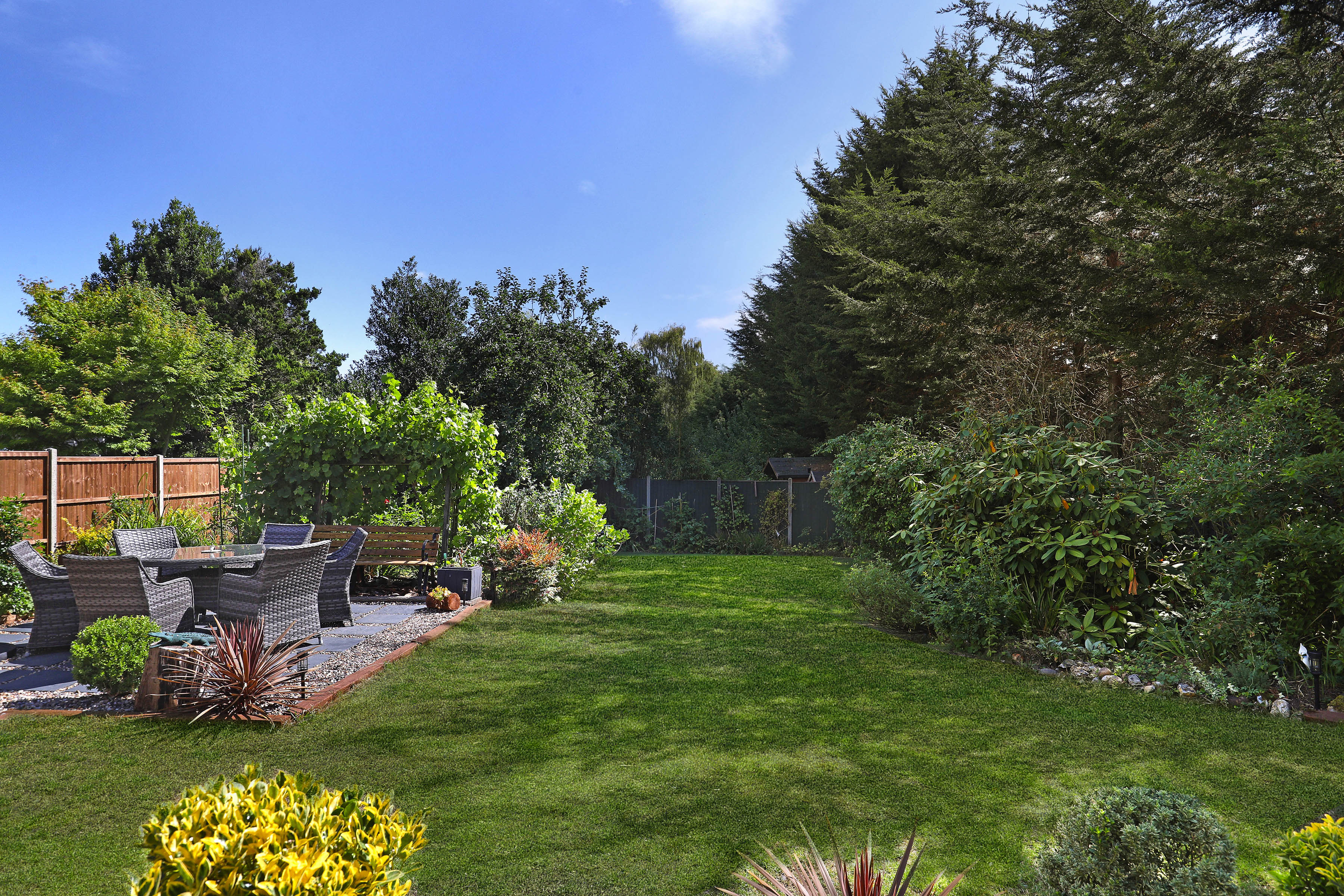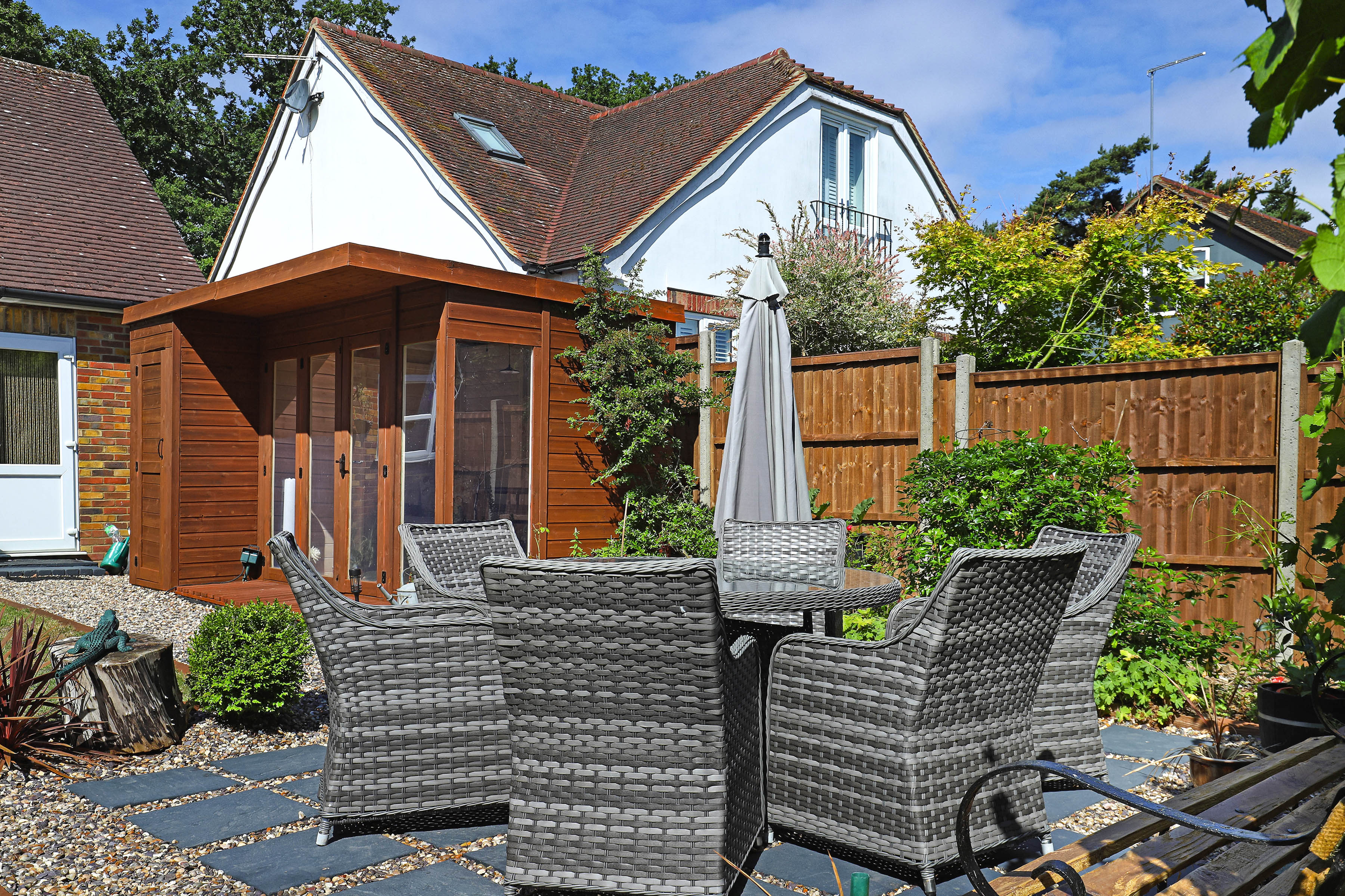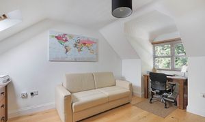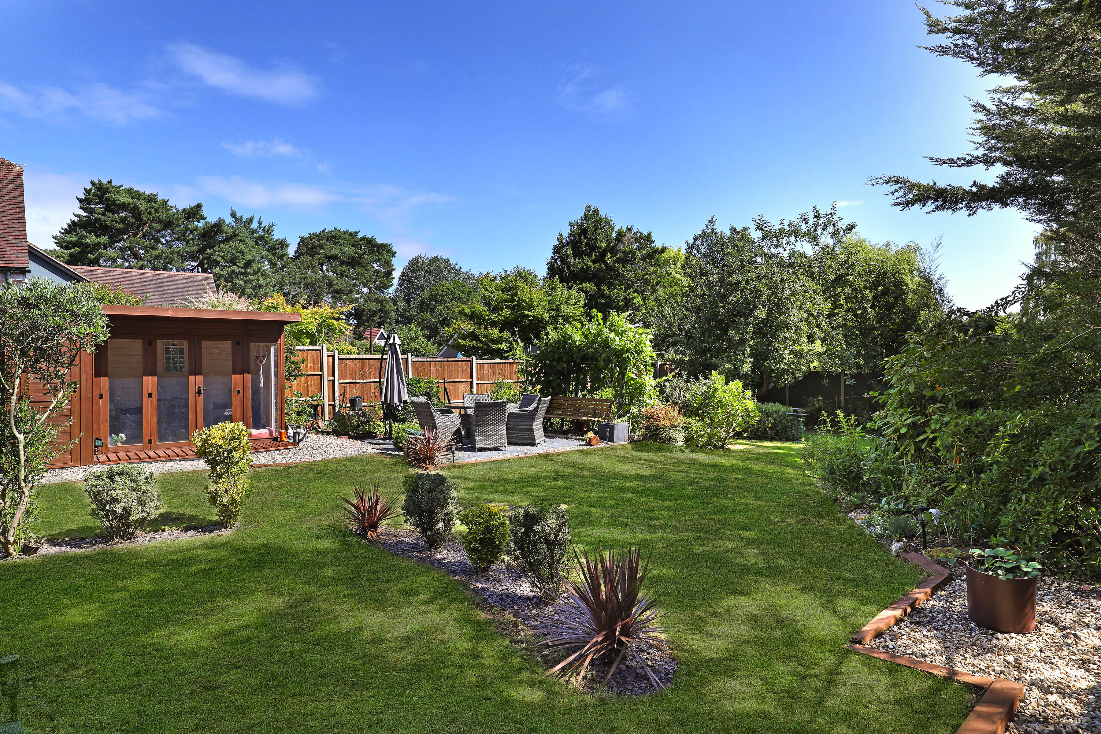 Outside, soak up the sunshine in the rear garden - the best place to enjoy summer dining and drinks with family and friends. Private and peaceful with large lawn, mature planting and a super handy garden room, it's a fab spot to be.