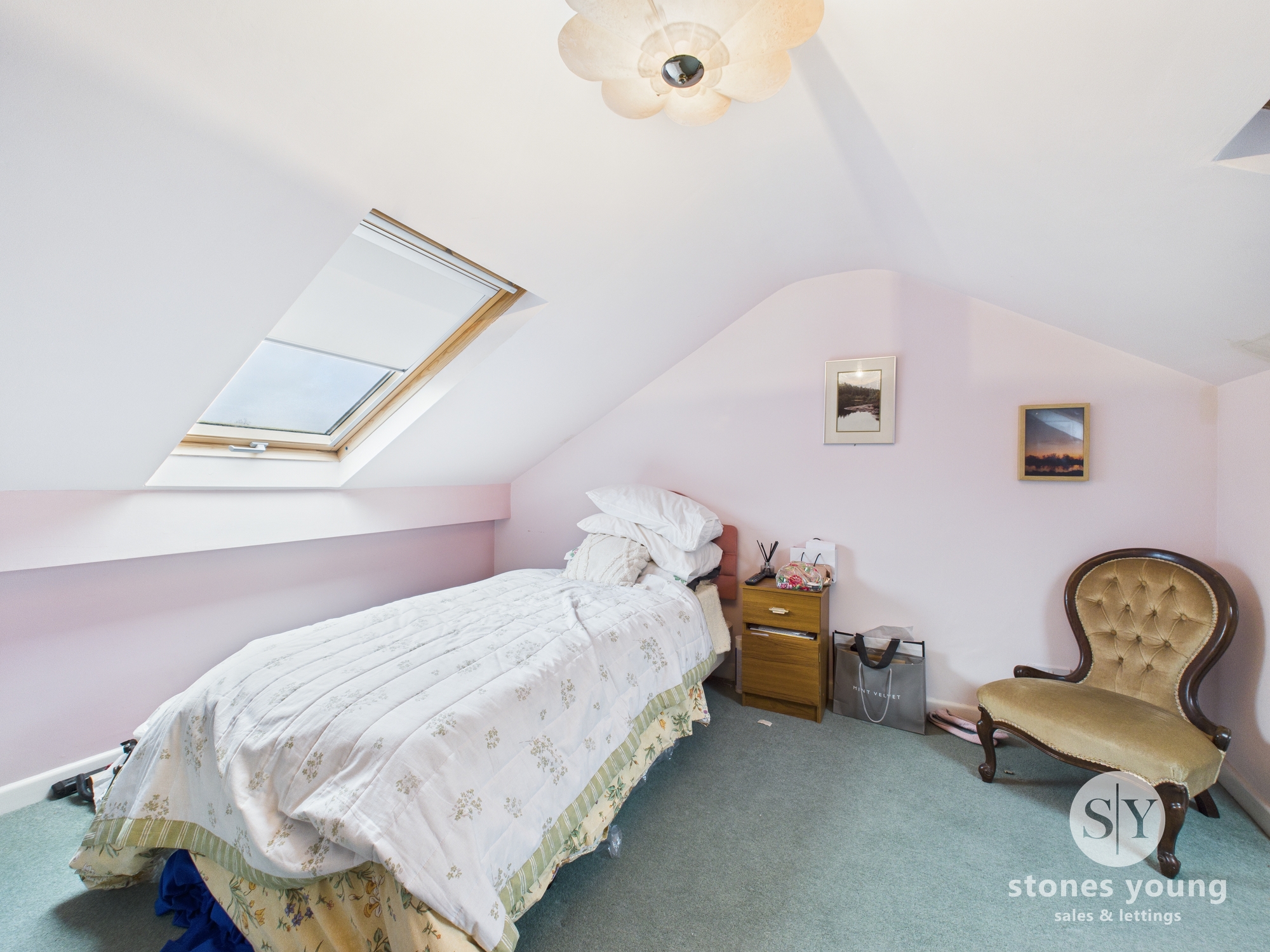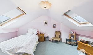 Double bedroom with carpet flooring, Velux windows x2, panel radiator.