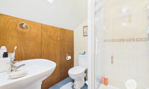 Carpet flooring, three piece in white comprising of electric shower enclosure, wc and basin, storage cupboard, Velux window, panel radiator.