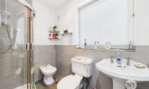 LVT flooring, four piece in white comprising of wc, basin, electric shower enclosure, ceiling spot lights, crossers double glazed uPVC window, towel radiator and panel radiator.