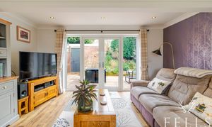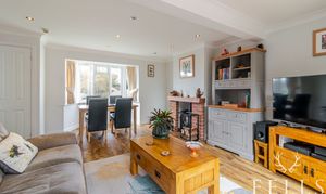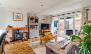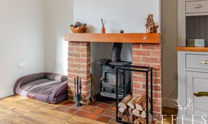 The living and dining room extends the full depth of the house, creating a versatile space that works equally well for relaxing or entertaining. A wood burning stove set within a brick fireplace adds warmth and character, while French doors open out onto the patio and garden beyond.