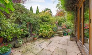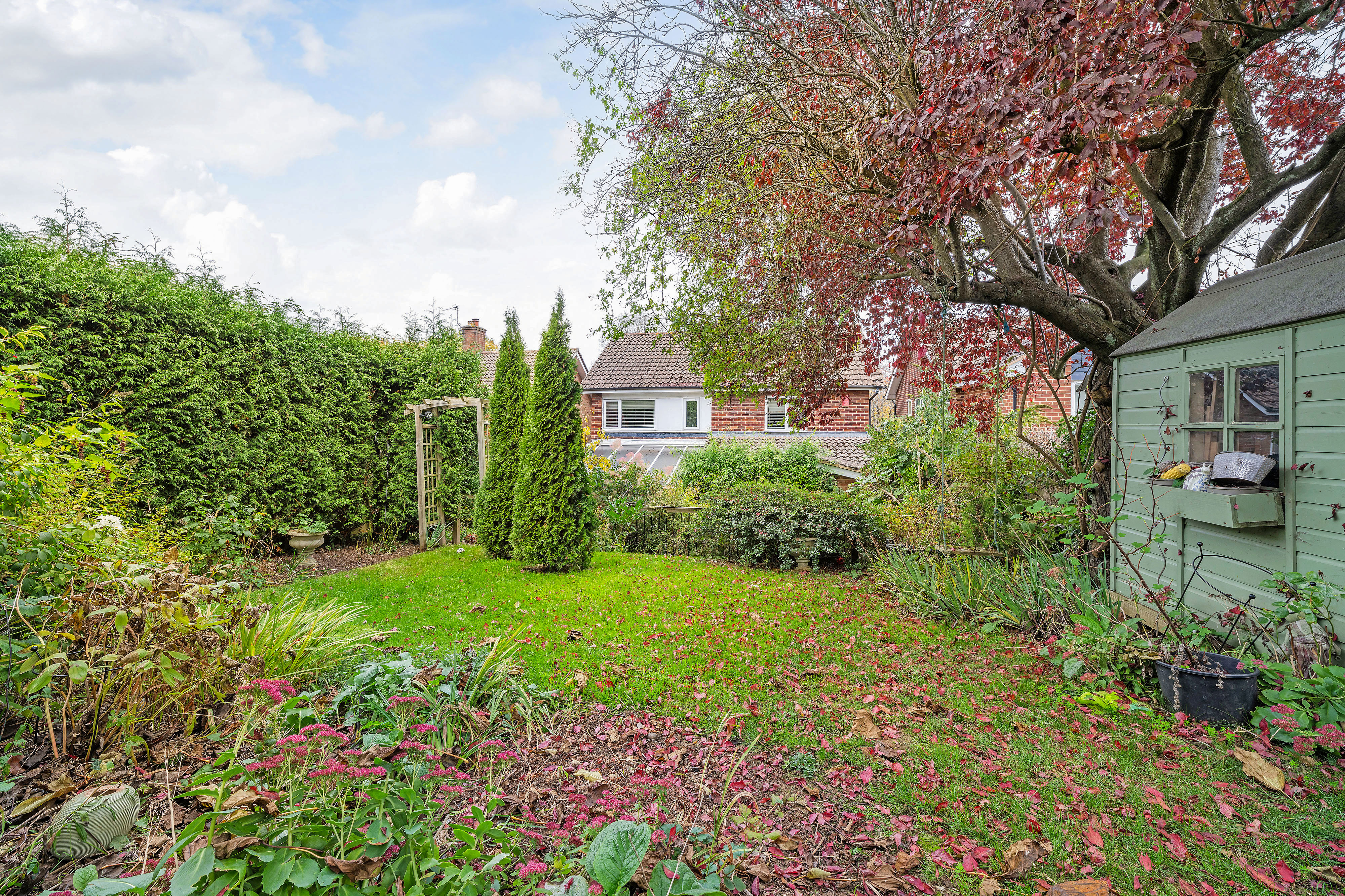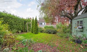 Outside the secluded rear garden is mainly laid to lawn with mature trees and shrubs, low level conifers and climbing roses, patio seating area and timber shed.