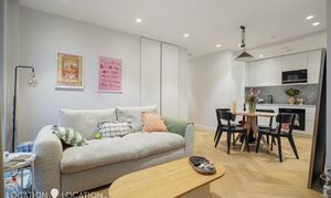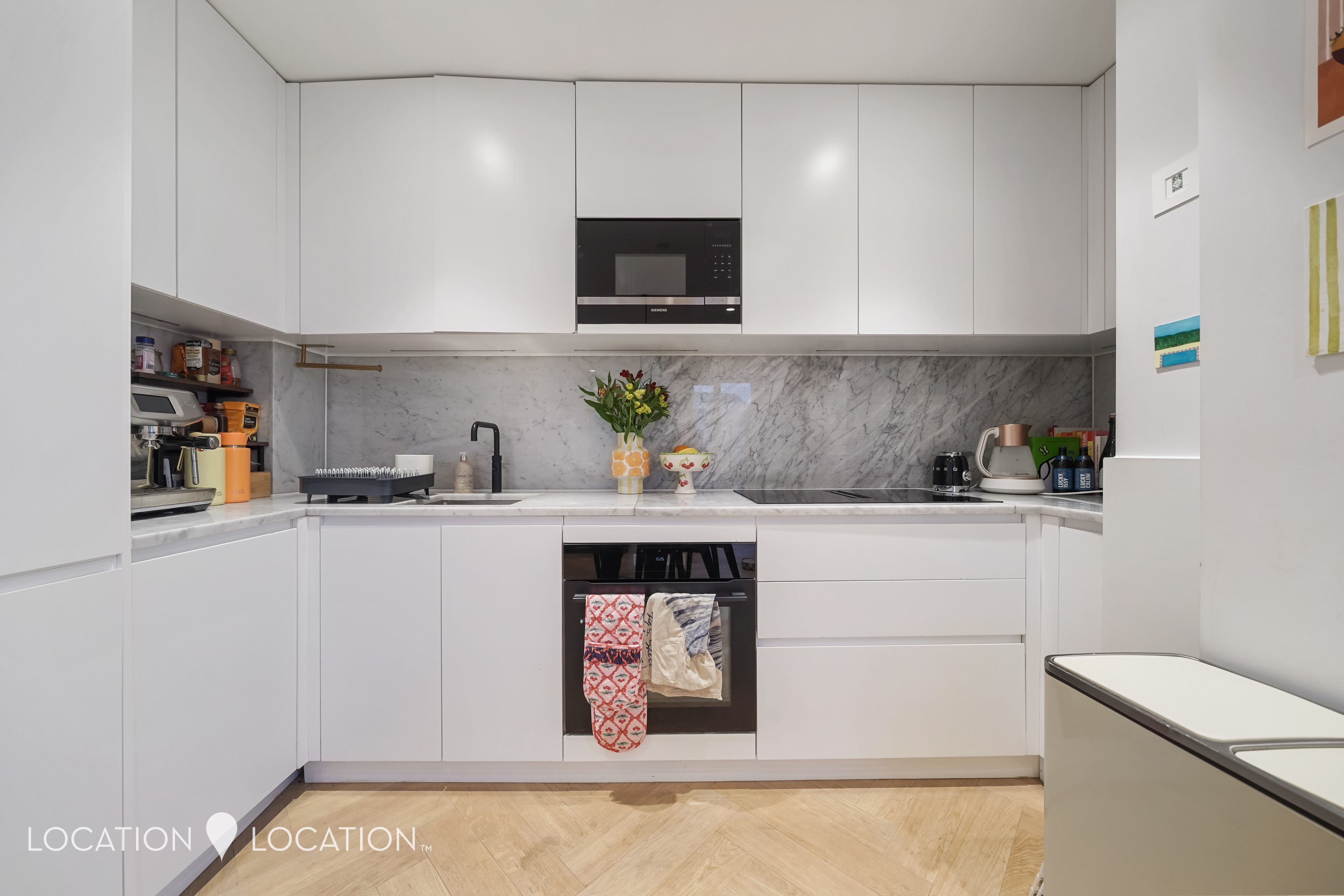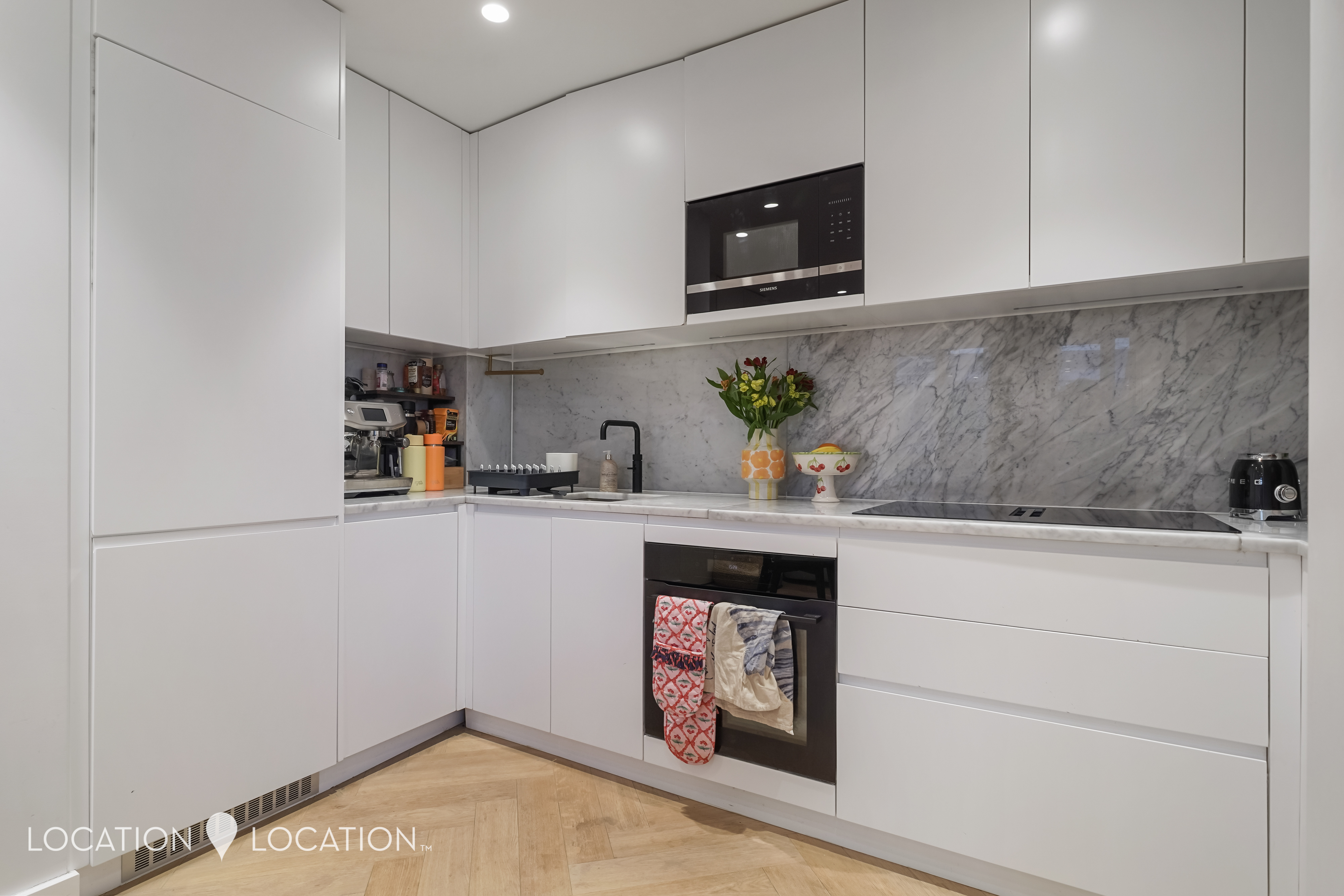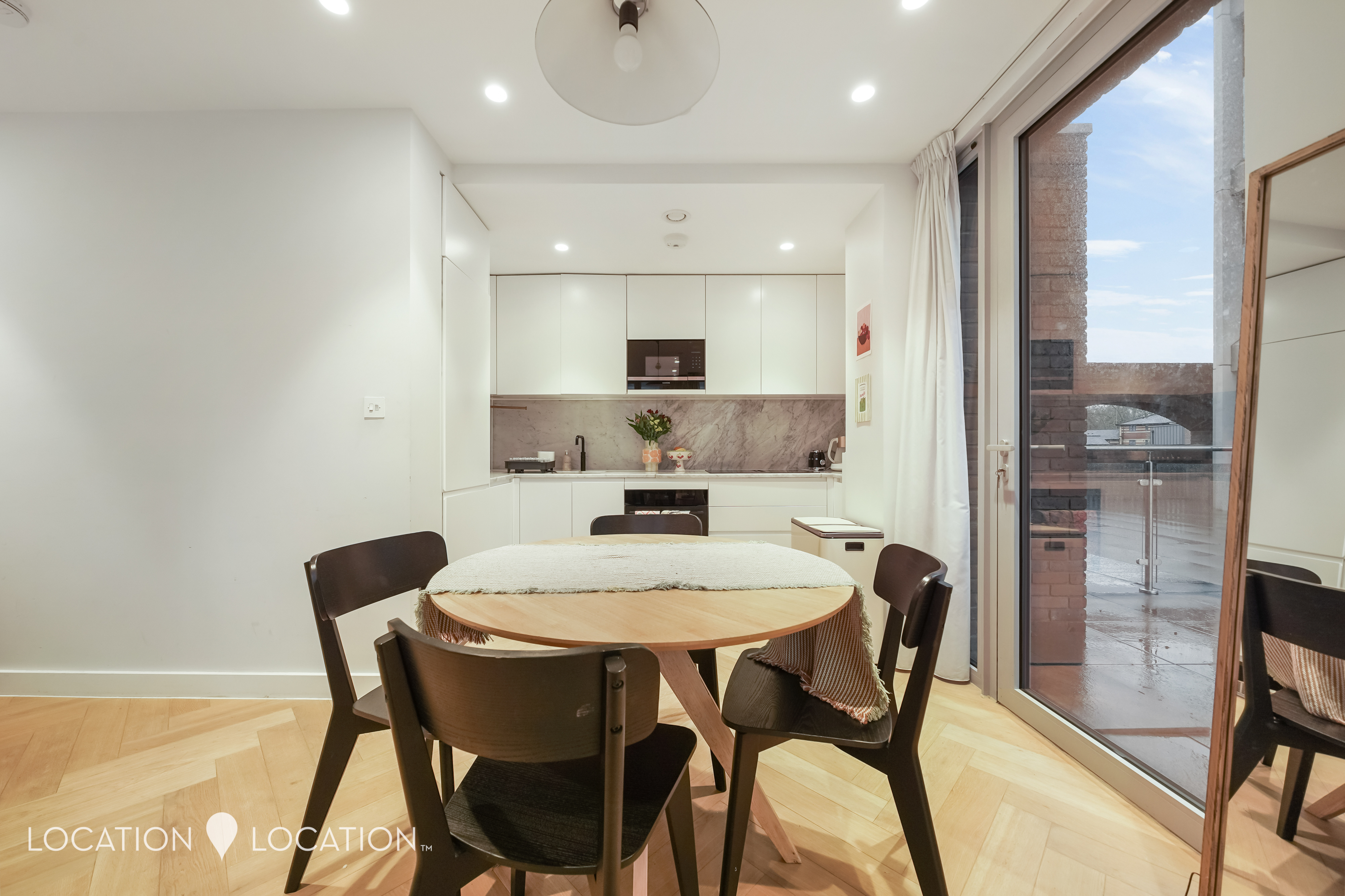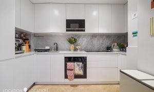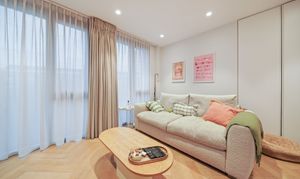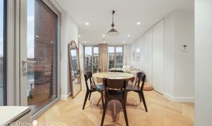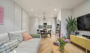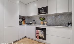 The heart of the home is the spacious open-plan living and kitchen area, offering ample room for dining and entertaining. Floor-to-ceiling windows flood the space with natural light, enhancing the contemporary feel. The kitchen is beautifully appointed with marble worktops, a smart integrated extractor fan and fully built-in appliances. However, the real show-stopper is the expansive 32-ft private terrace - an exceptional outdoor space perfect for entertaining and enjoying both morning and afternoon sun.