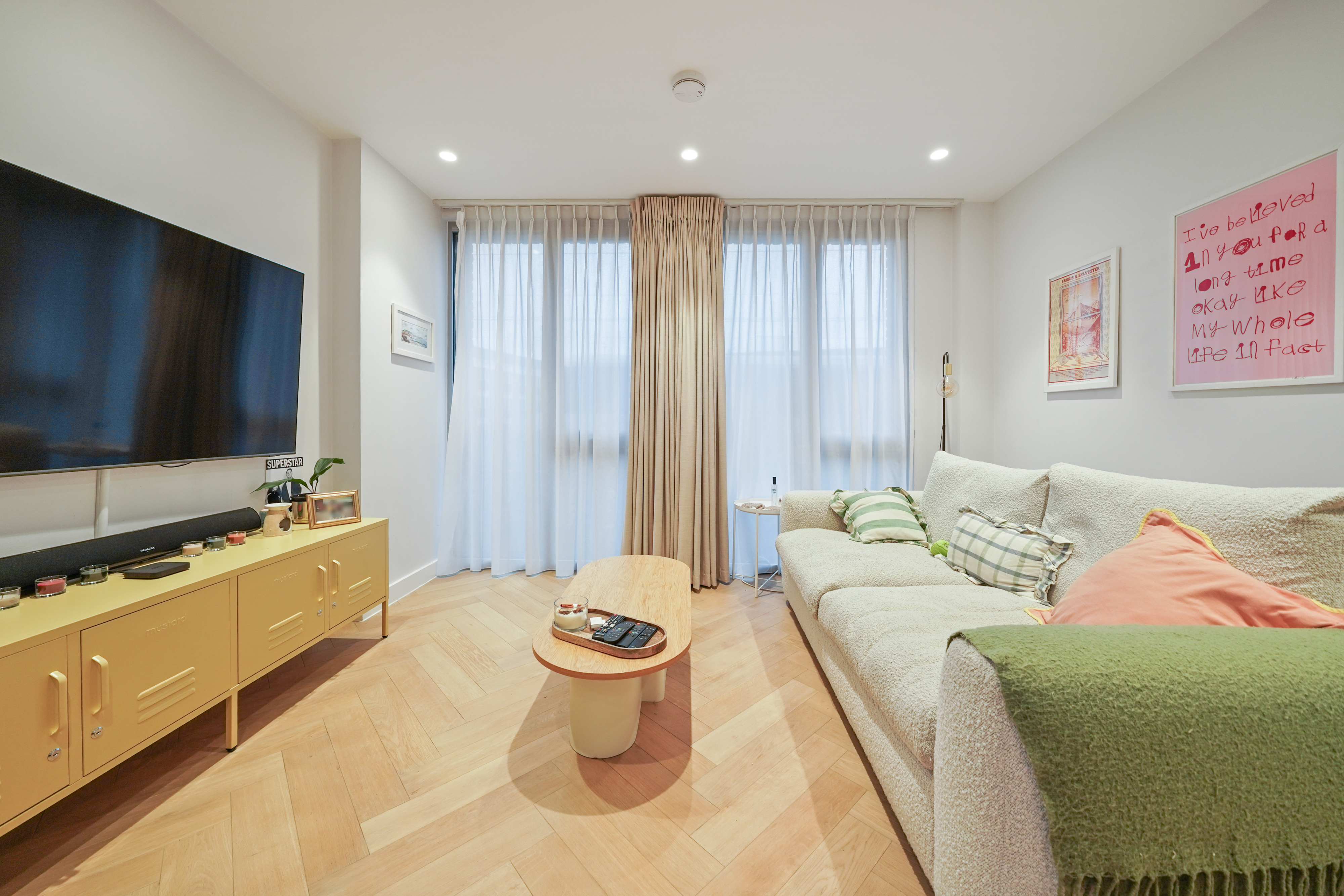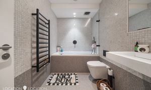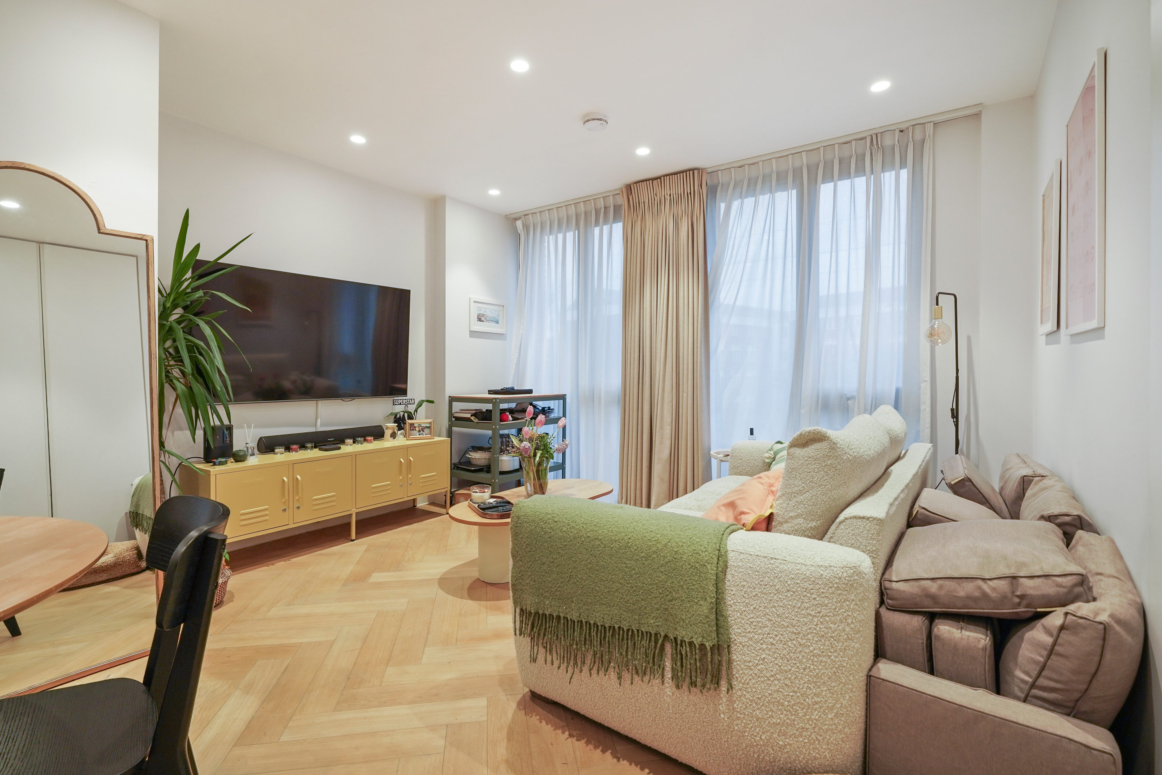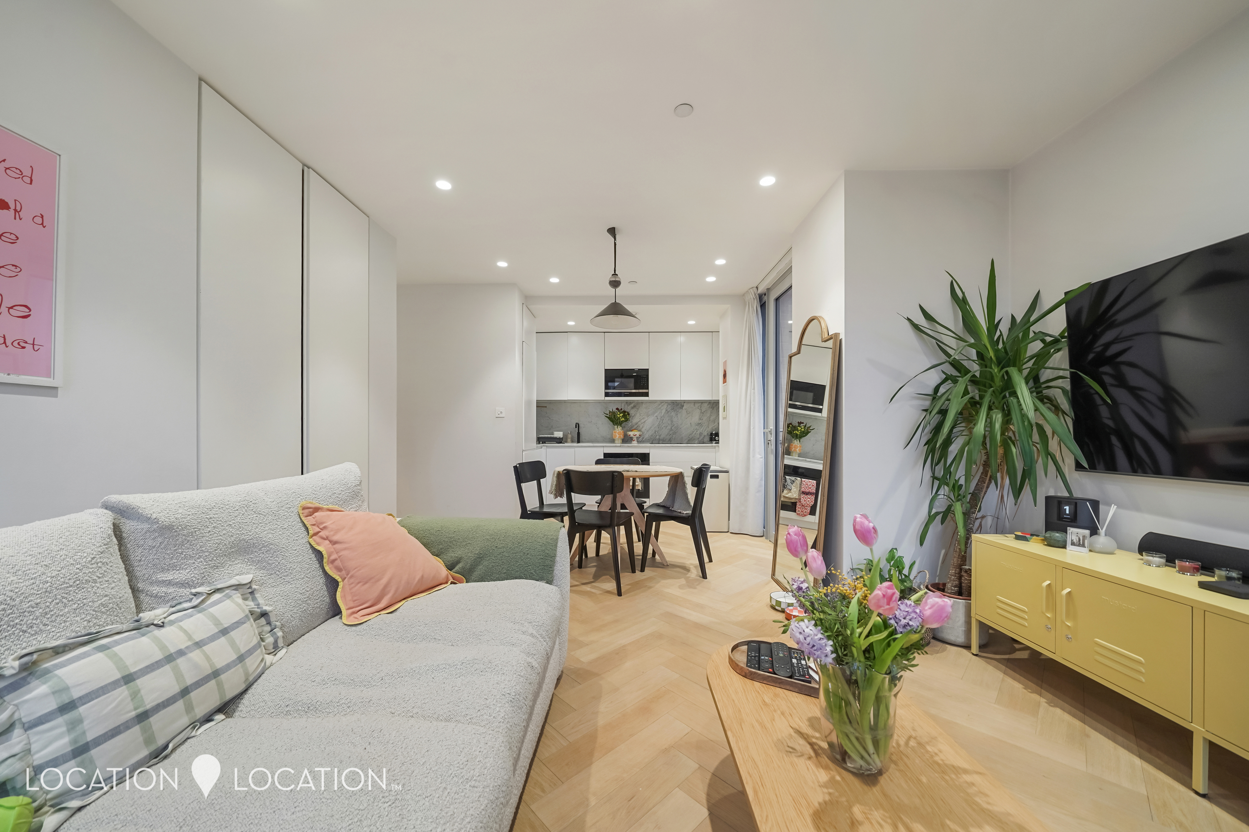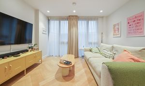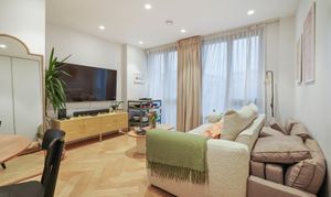 The apartment features impressive high ceilings, elegant herringbone flooring with underfloor heating, and even a built-in speaker system in the bathroom. A truly modern home, the stylish bathroom is finished with mosaic tiling and sleek matte black fittings, while the generous double bedroom benefits from bespoke built-in wardrobes with integrated lighting.