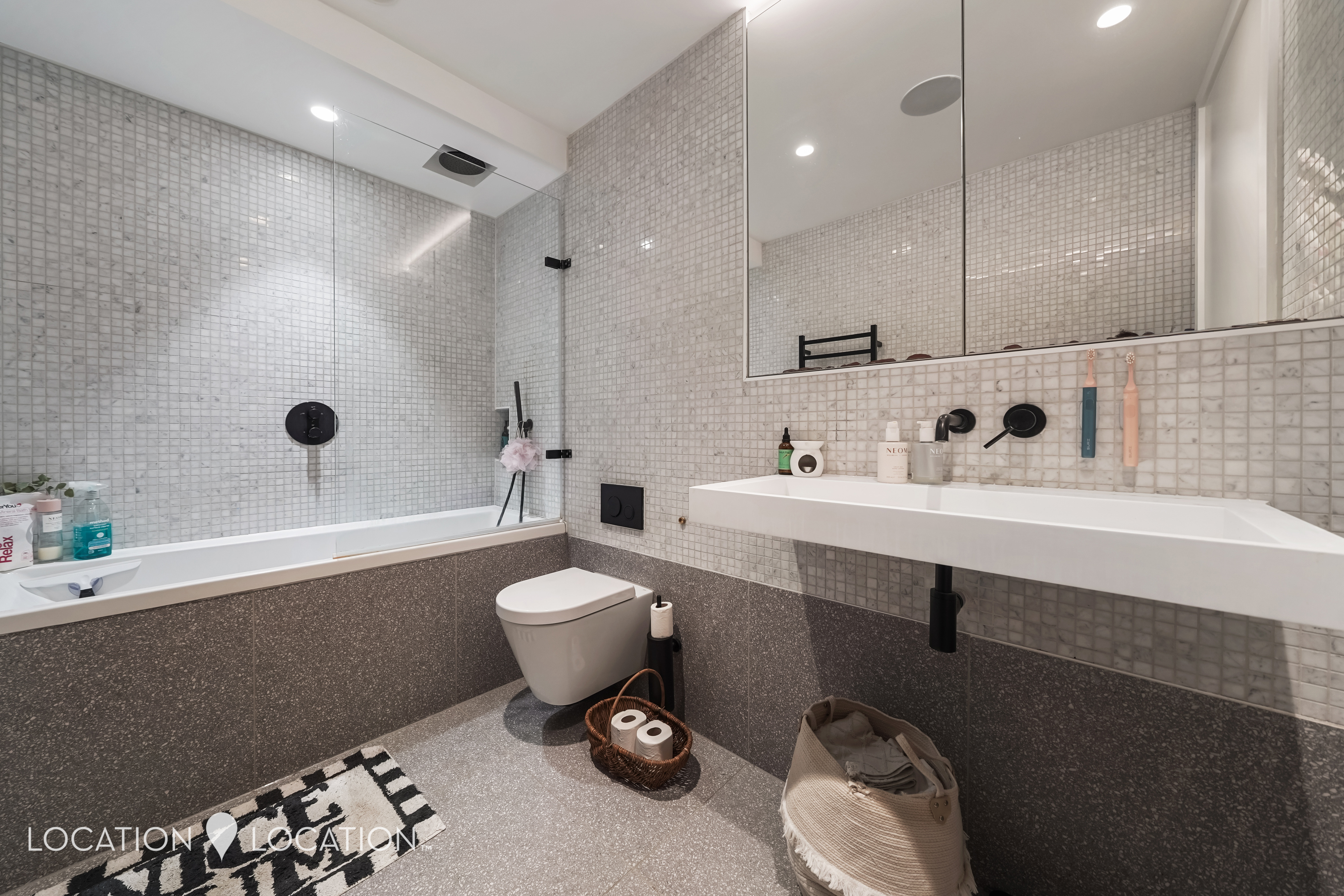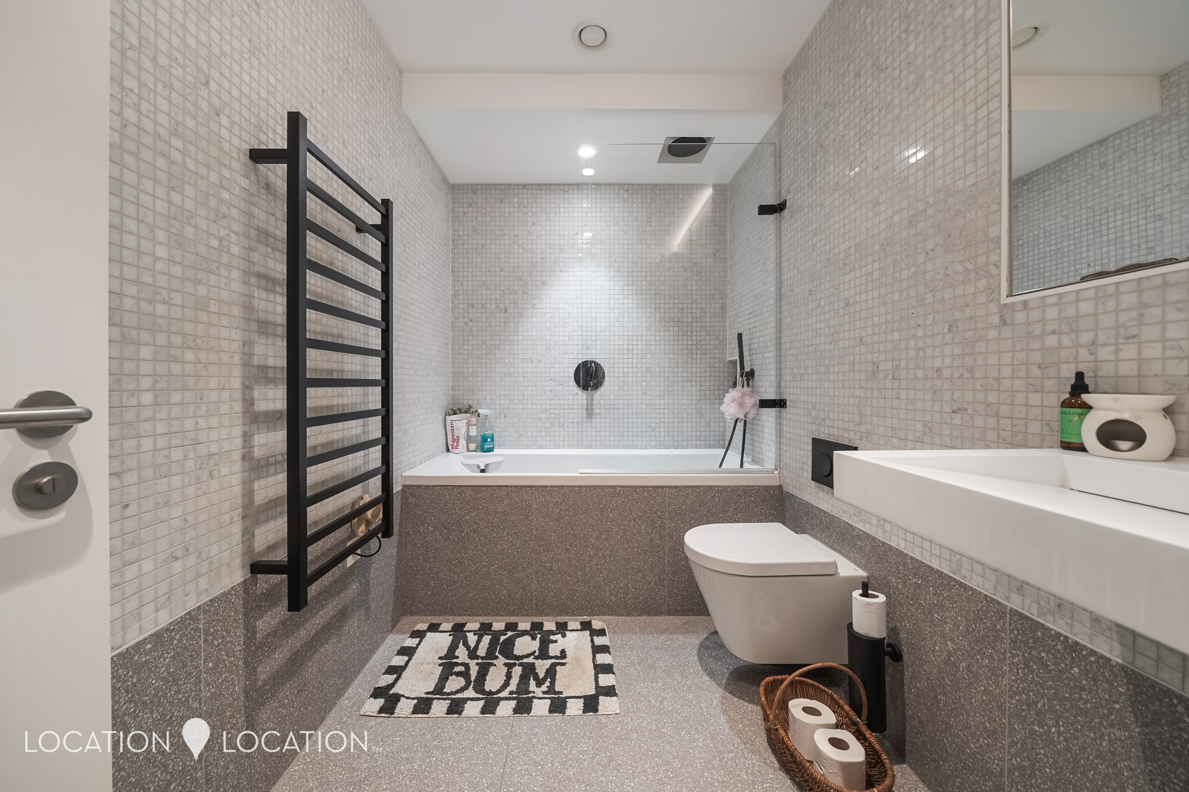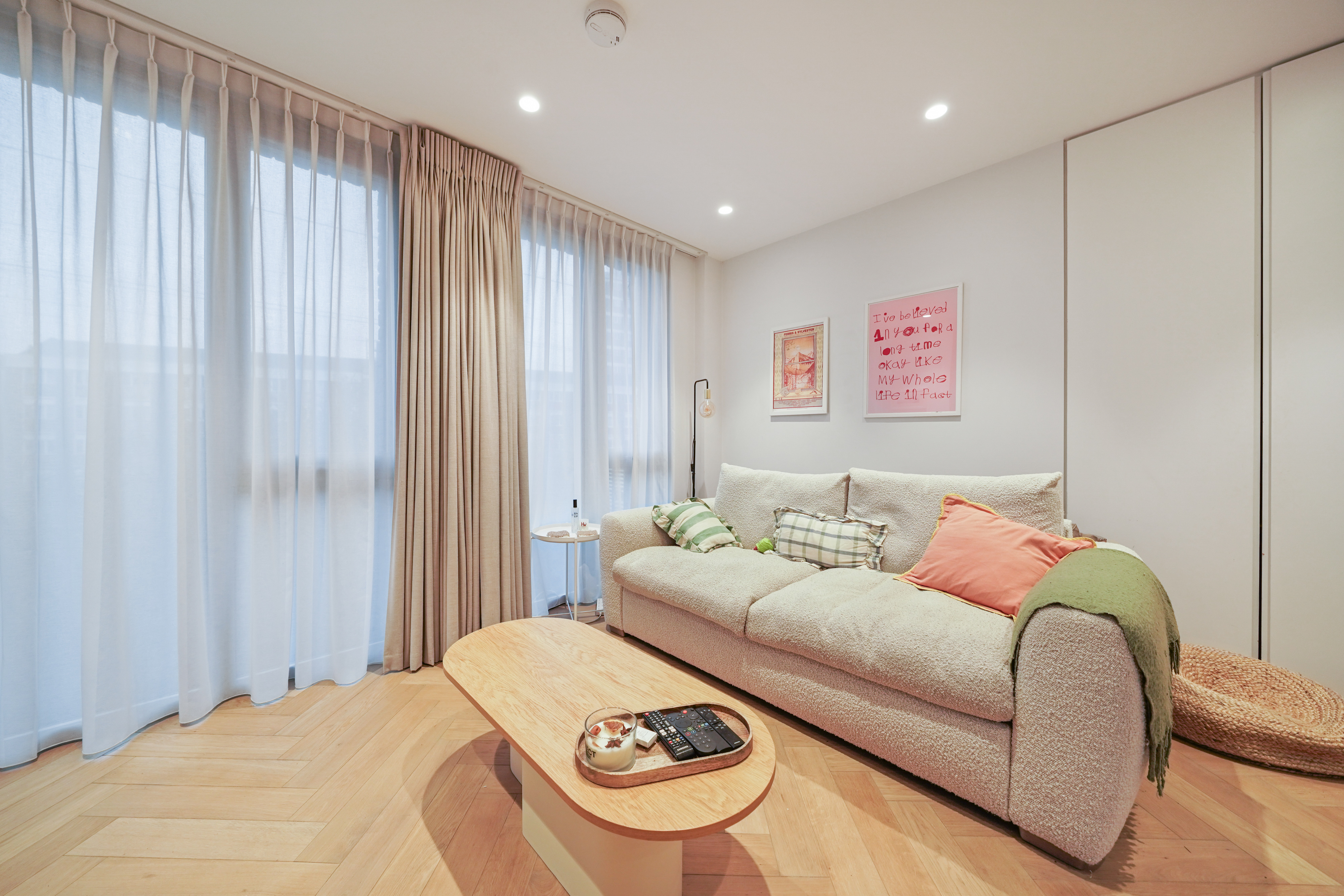 The apartment features impressive high ceilings, elegant herringbone flooring with underfloor heating, and even a built-in speaker system in the bathroom. A truly modern home, the stylish bathroom is finished with mosaic tiling and sleek matte black fittings, while the generous double bedroom benefits from bespoke built-in wardrobes with integrated lighting.