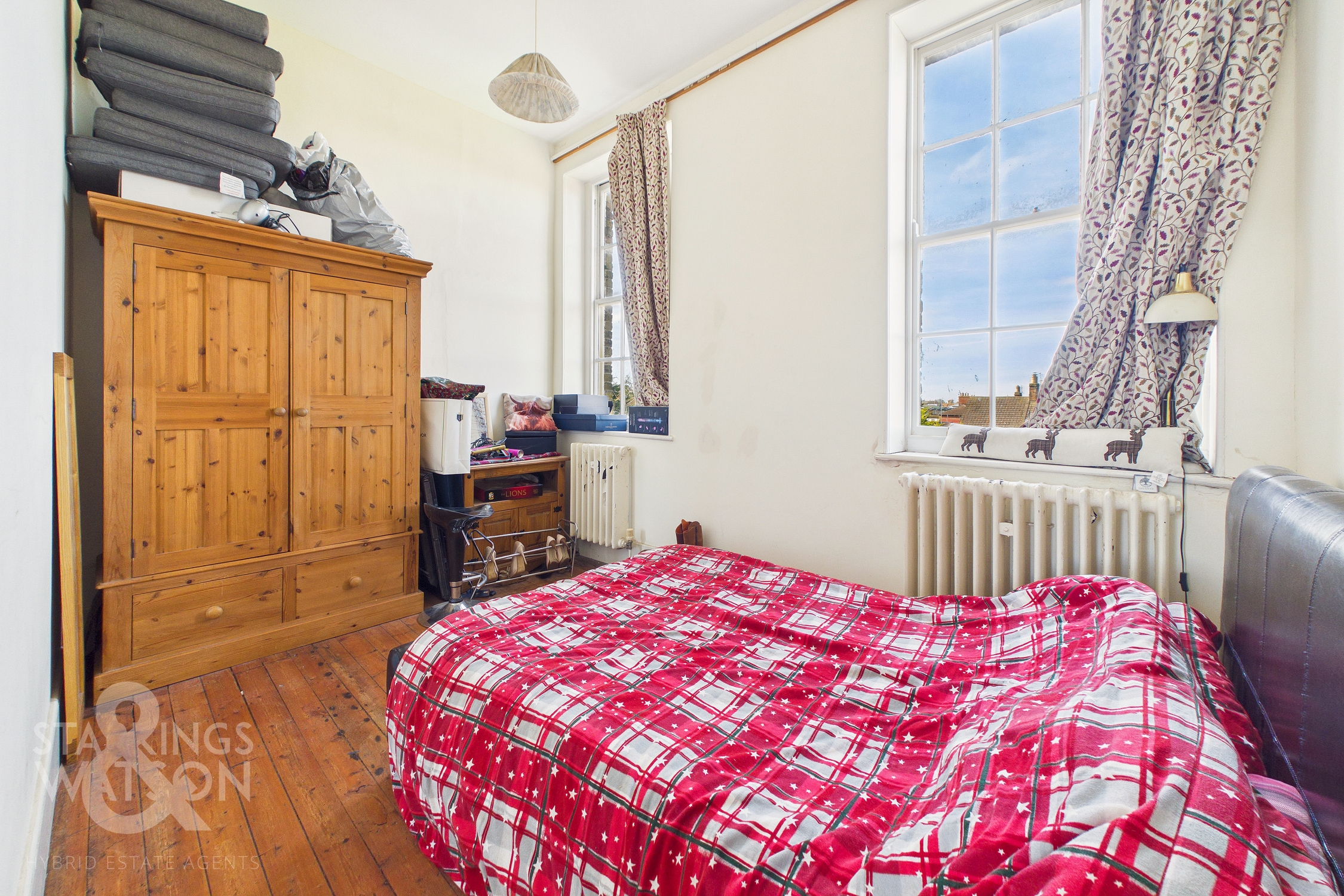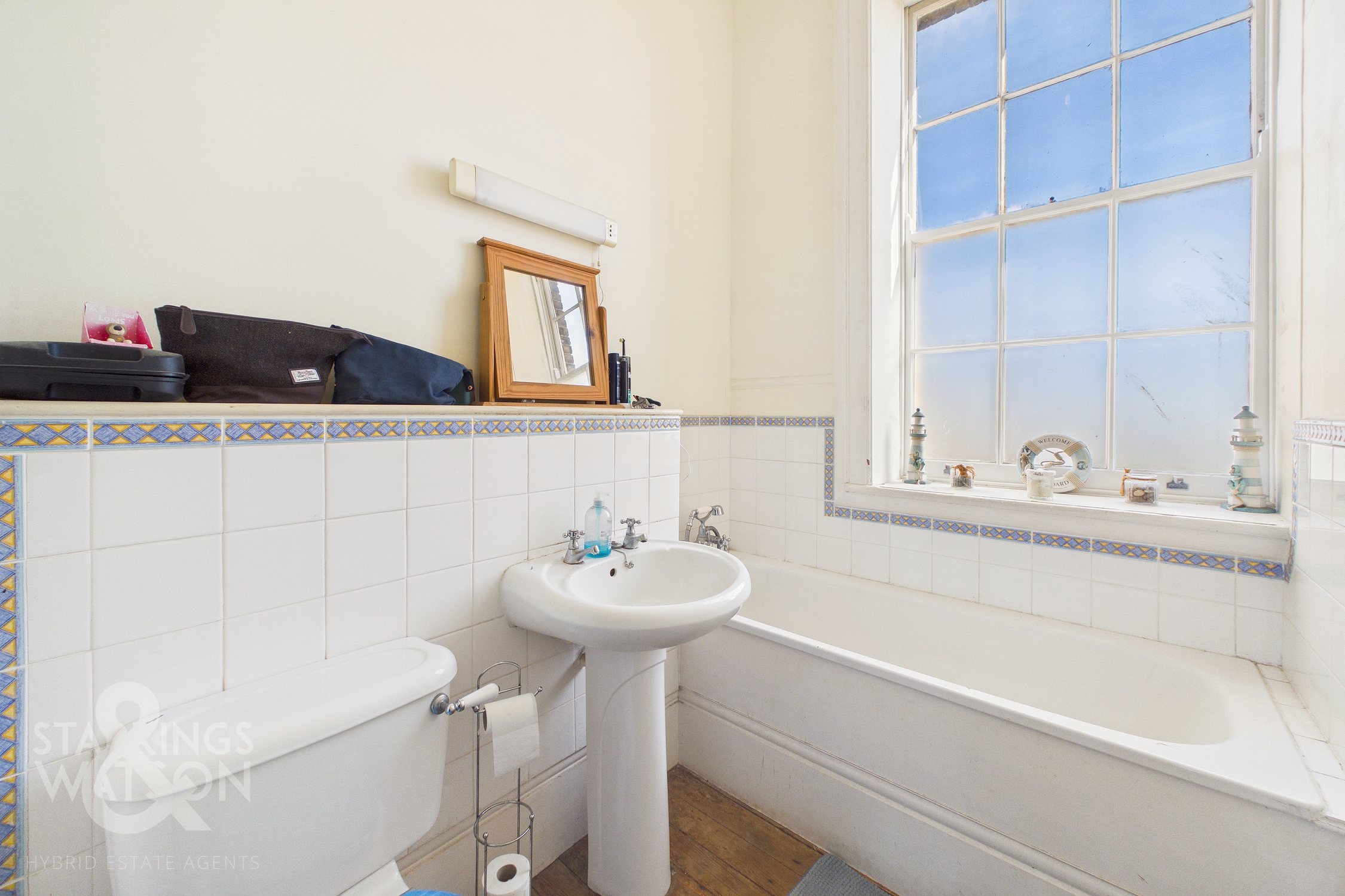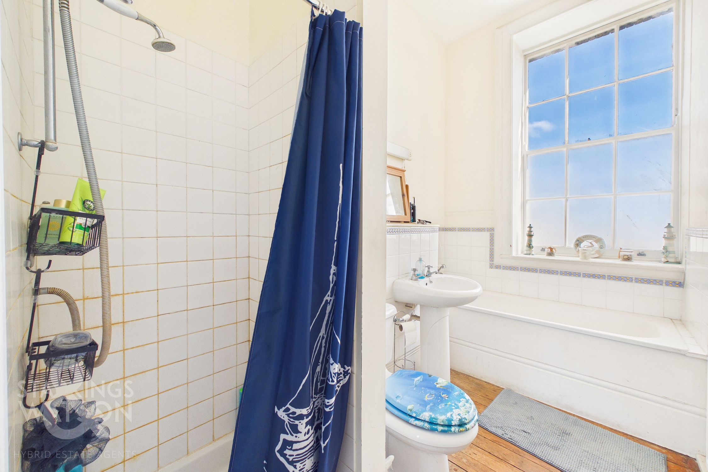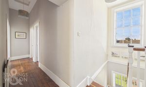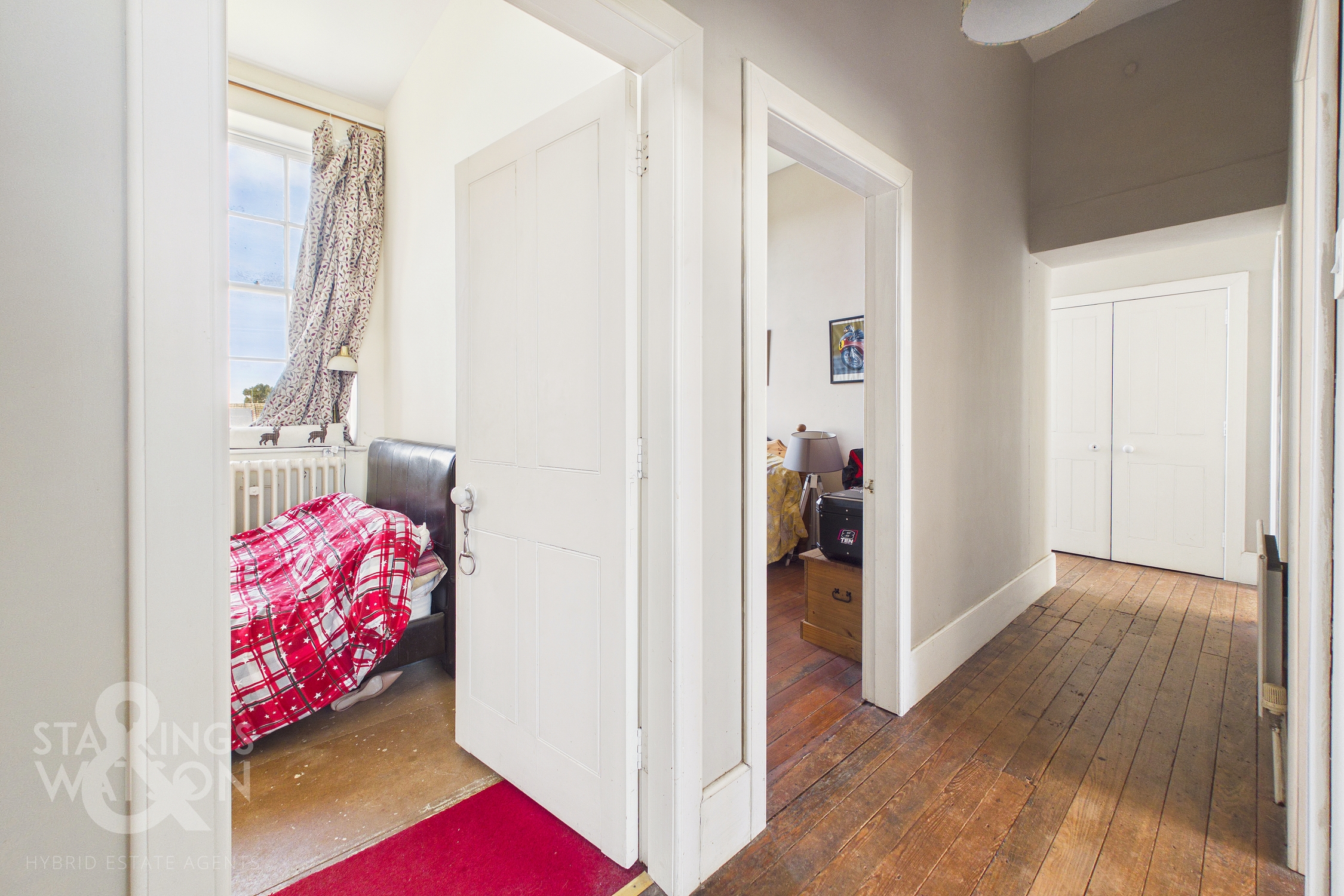 Ascending the stairs to the first floor landing, loft access can be found overhead while double opening doors provide airing cupboard storage. From here, doors lead to four well proportioned bedrooms. The first room offers space for a double bed with wood flooring, while the similarly sized opposite room features carpeted flooring and is currently used as a dressing room, though it would make an ideal home office/study. The second double room is currently used as a guest suite and includes twin radiators, wood flooring, and ample space for storage furniture. The main bedroom provides twin front facing windows overlooking the communal courtyard, with further room for a large double bed and wardrobe space. Completing the accommodation is a four piece family bathroom at the end of the landing, offering a fitted bath, a white two piece suite, and an inset shower cubicle with tiled splashbacks.
