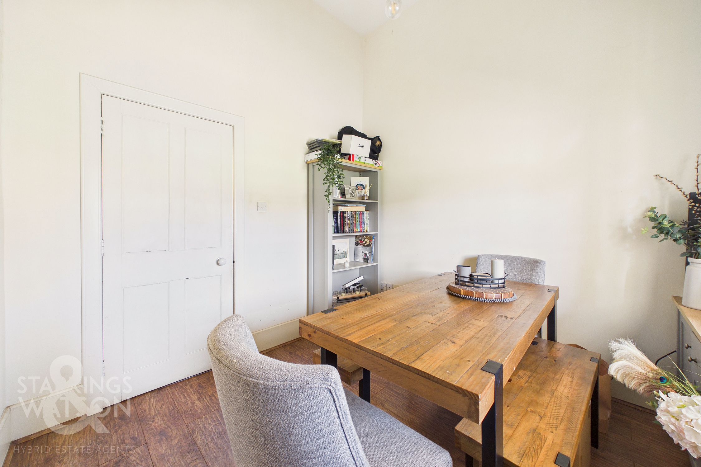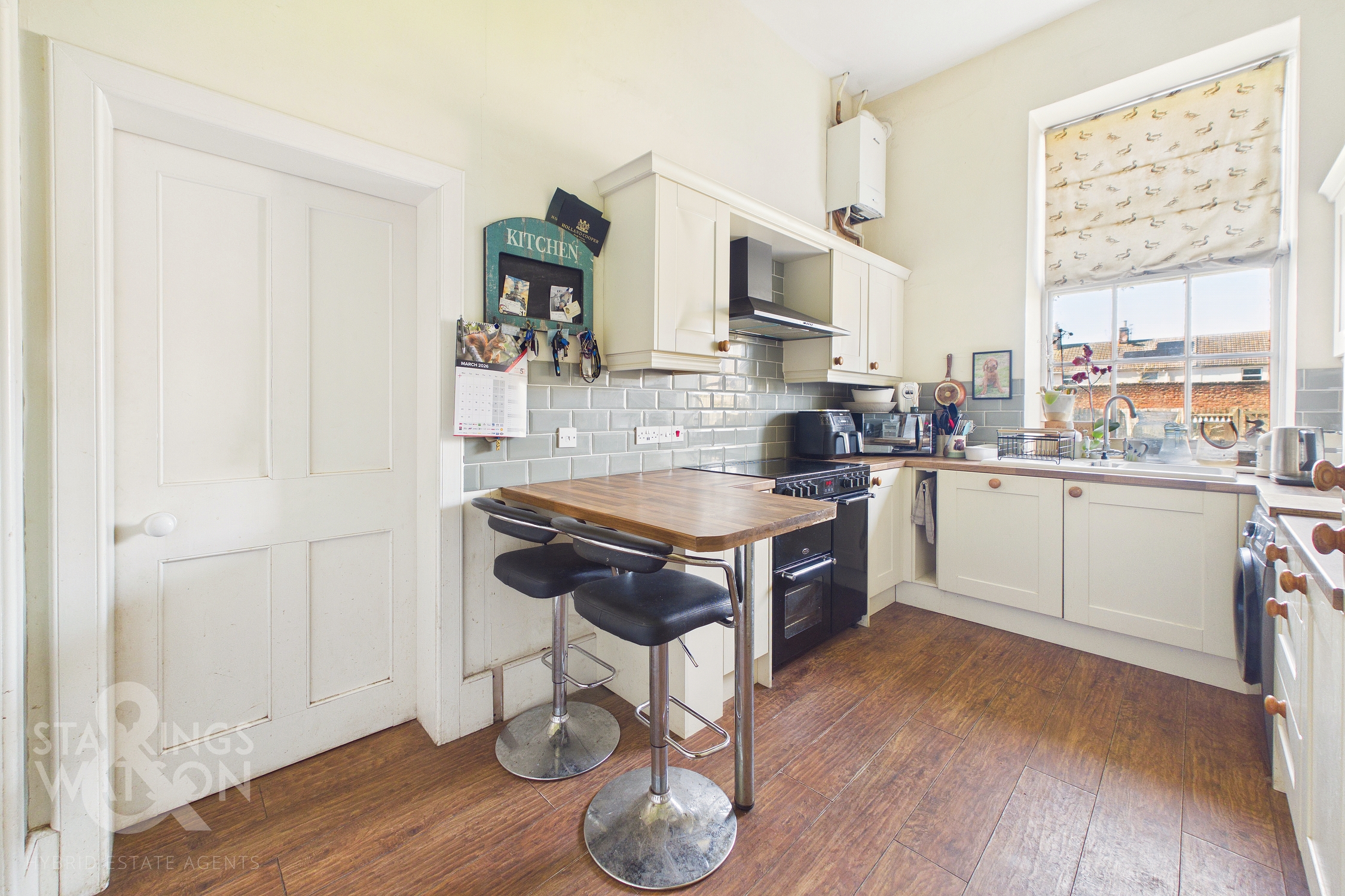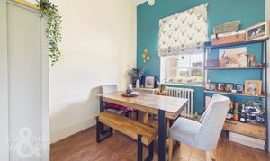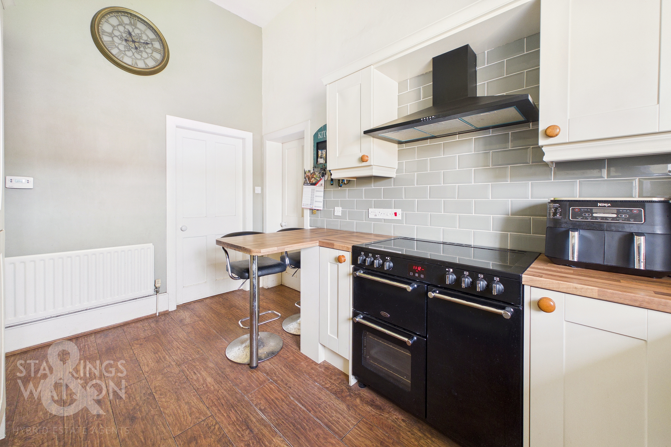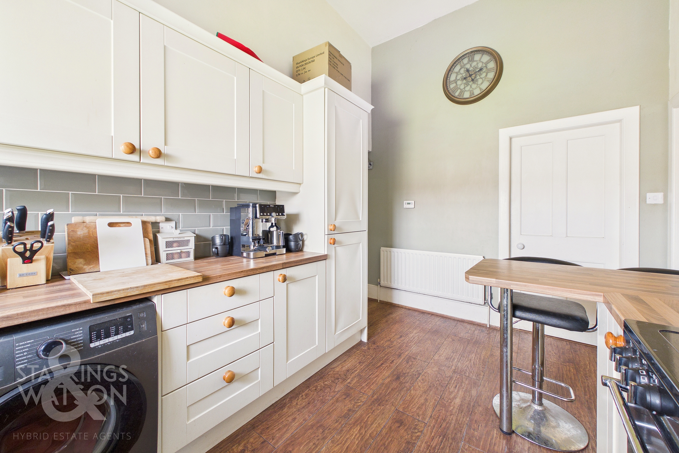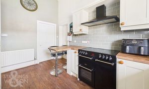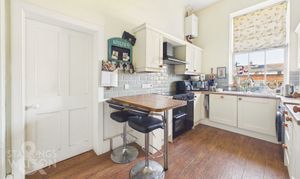 Stepping inside the light and bright entrance, there is plenty of space for storing coats and shoes, alongside a tucked away storage cupboard beneath the stairs. A door opens to a convenient two piece W.C, perfect for guests, while two further doors lead to the private enclosed garden and the fully fitted kitchen. The kitchen itself offers extensive storage from a range of wall and base units and boasts integrated appliances including a dishwasher, washing machine, fridge and freezer. A recently replaced range cooker sits beneath a fitted extractor and will remain with the property, while the worktop space wraps around to form breakfast bar seating for informal dining. The space is complemented by fully tiled splashbacks for ease of maintenance and a ceramic inset sink with a mixer tap situated below the window. Wood flooring runs underfoot and continues into the adjacent dining room, which features tall ceilings and large six-over-six sash windows overlooking the courtyard. At the end of the kitchen, a further door welcomes you to the light and bright 23’ sitting room. This space enjoys a generous dual aspect, ensuring the room is flooded with natural light, and offers versatility for a range of soft furnishing layouts. The room is centred around an original and functioning open fire with a tiled hearth.