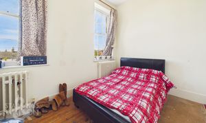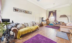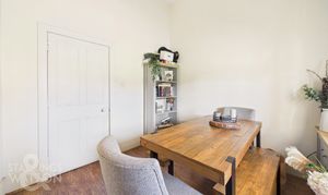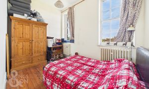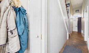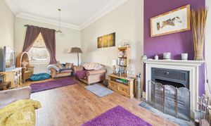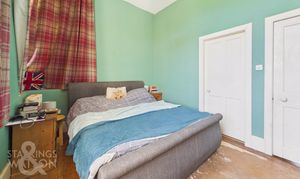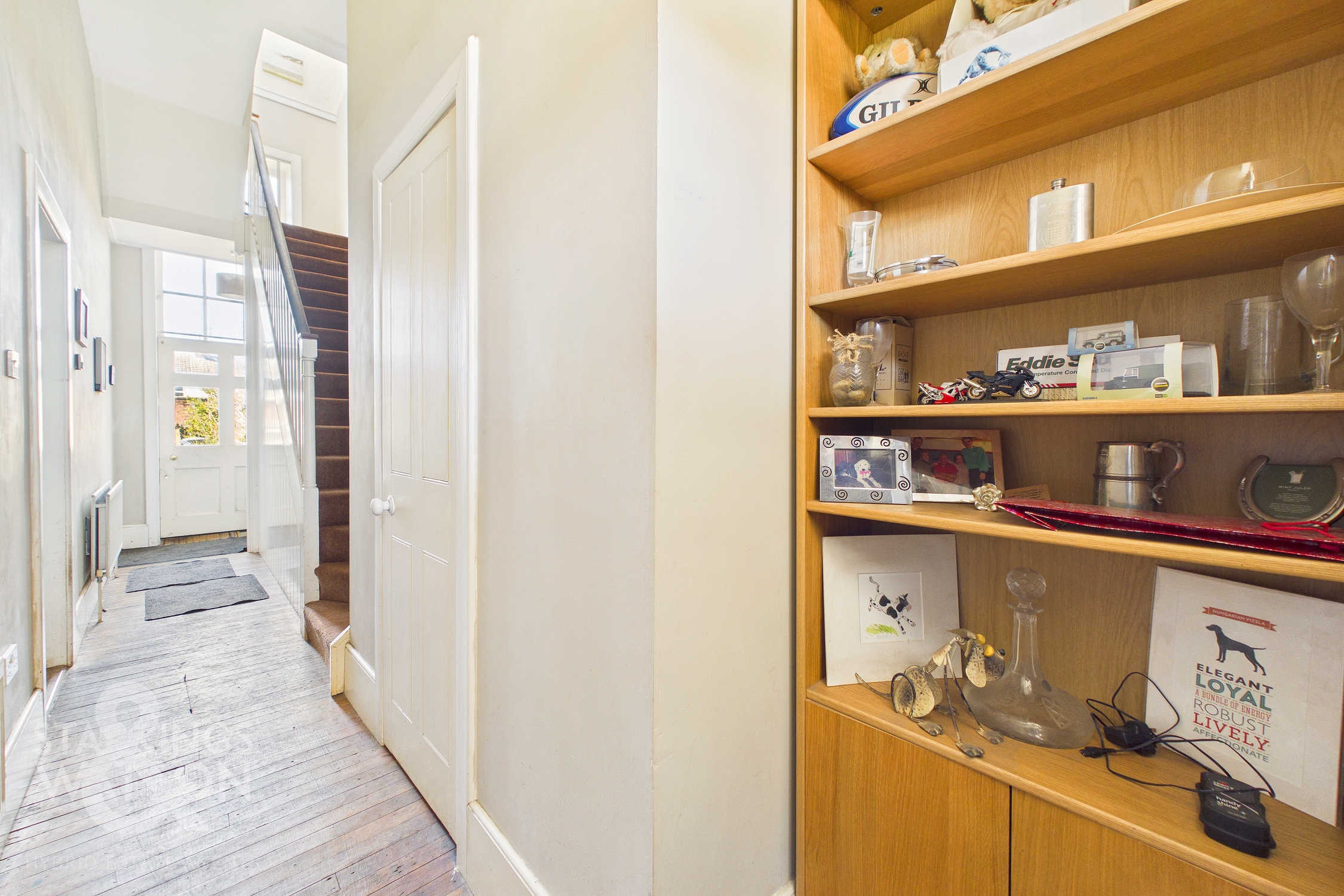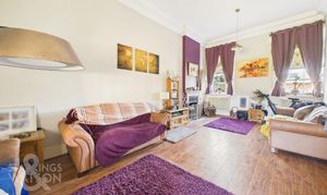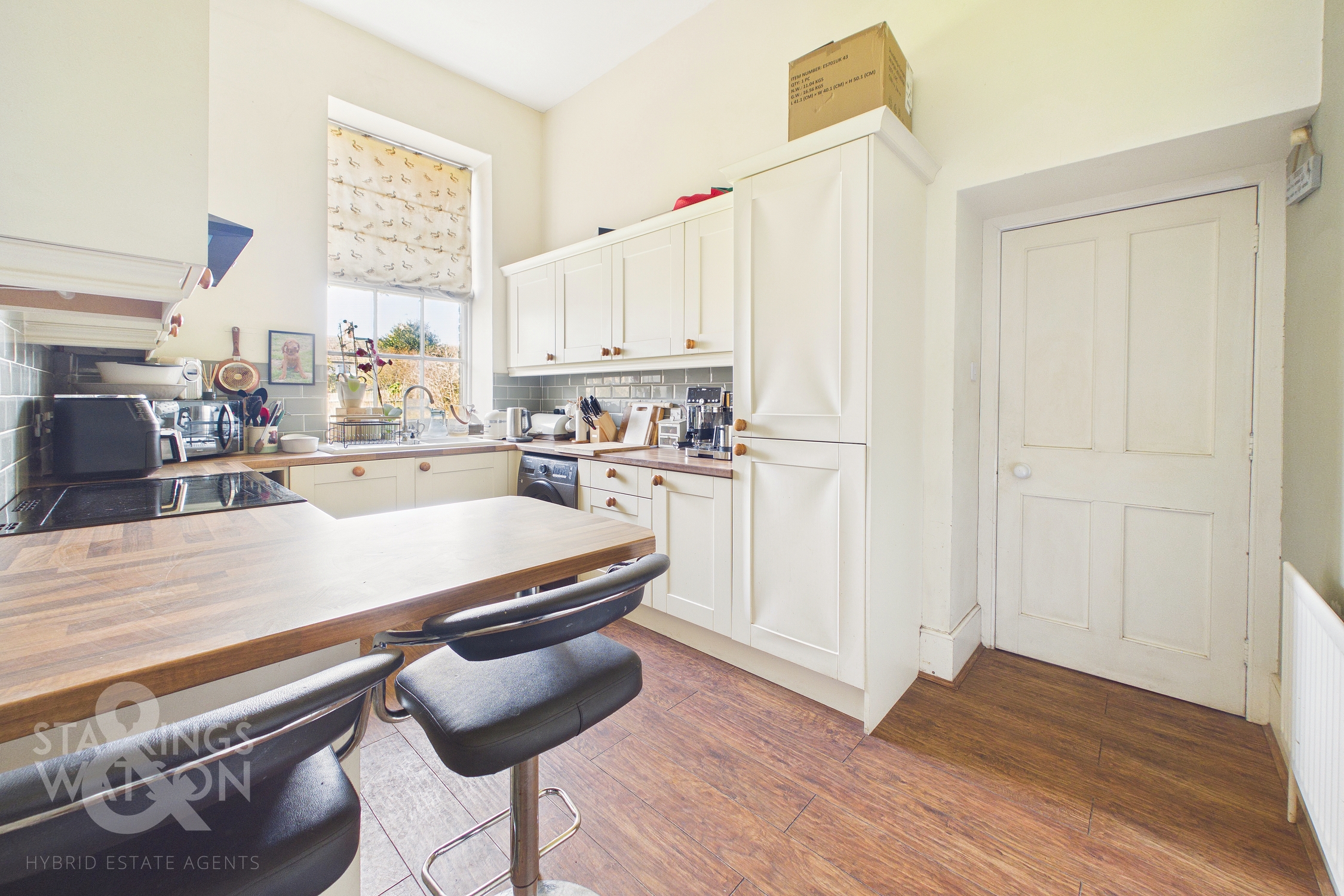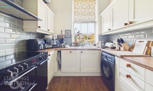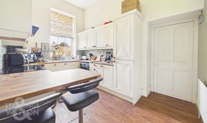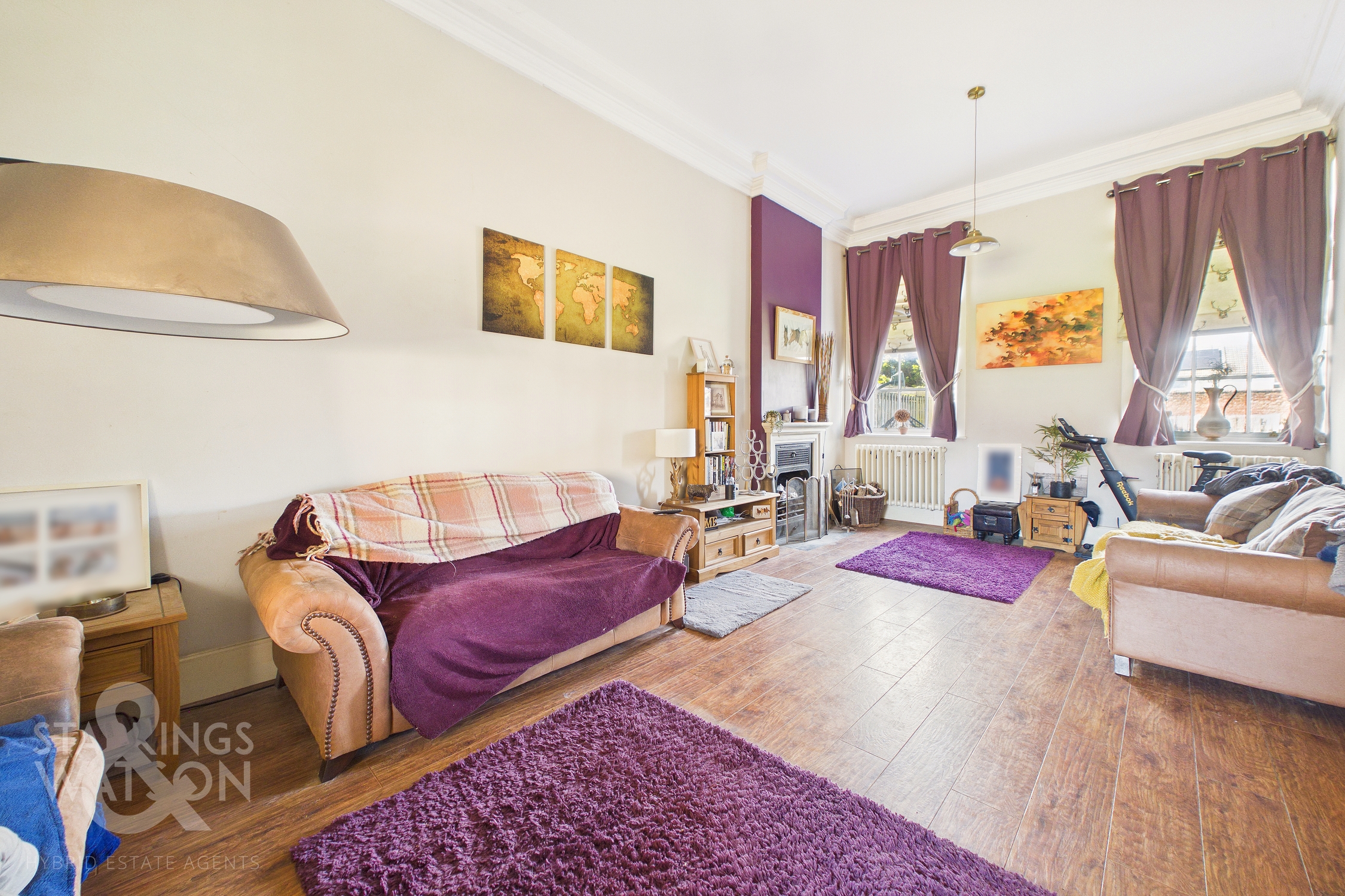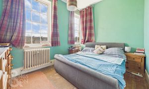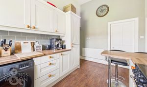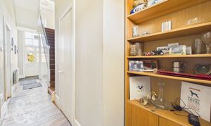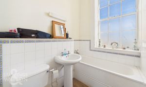 Stepping inside the light and bright entrance, there is plenty of space for storing coats and shoes, alongside a tucked away storage cupboard beneath the stairs. A door opens to a convenient two piece W.C, perfect for guests, while two further doors lead to the private enclosed garden and the fully fitted kitchen. The kitchen itself offers extensive storage from a range of wall and base units and boasts integrated appliances including a dishwasher, washing machine, fridge and freezer. A recently replaced range cooker sits beneath a fitted extractor and will remain with the property, while the worktop space wraps around to form breakfast bar seating for informal dining. The space is complemented by fully tiled splashbacks for ease of maintenance and a ceramic inset sink with a mixer tap situated below the window. Wood flooring runs underfoot and continues into the adjacent dining room, which features tall ceilings and large six-over-six sash windows overlooking the courtyard. At the end of the kitchen, a further door welcomes you to the light and bright 23’ sitting room. This space enjoys a generous dual aspect, ensuring the room is flooded with natural light, and offers versatility for a range of soft furnishing layouts. The room is centred around an original and functioning open fire with a tiled hearth.