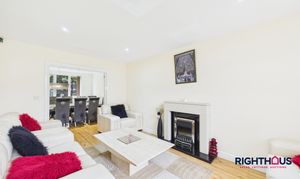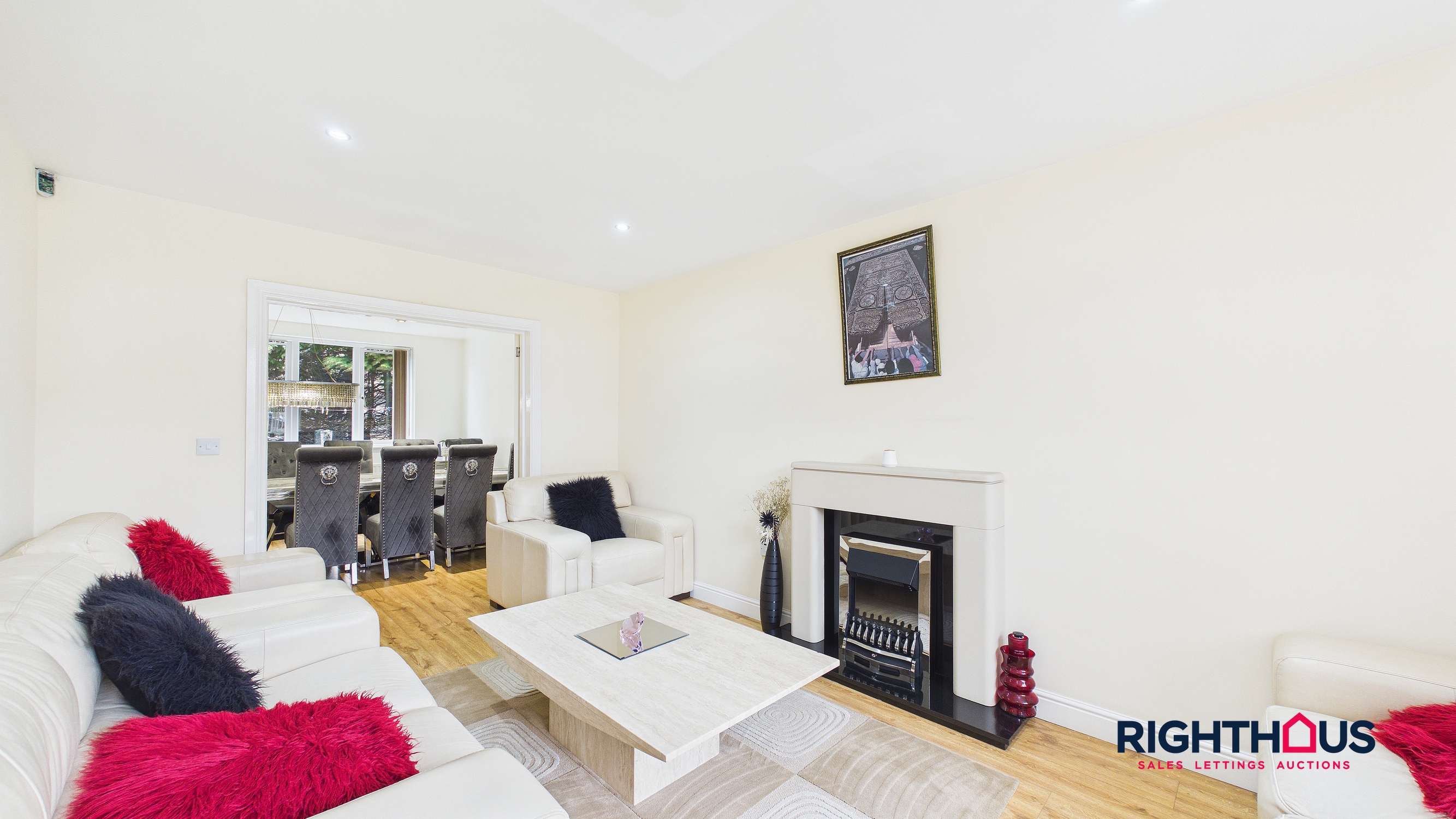 A bright, well proportioned main living space featuring an elegant fire surround with inset hearth mounted fire. Dual doors open into the dining zone.